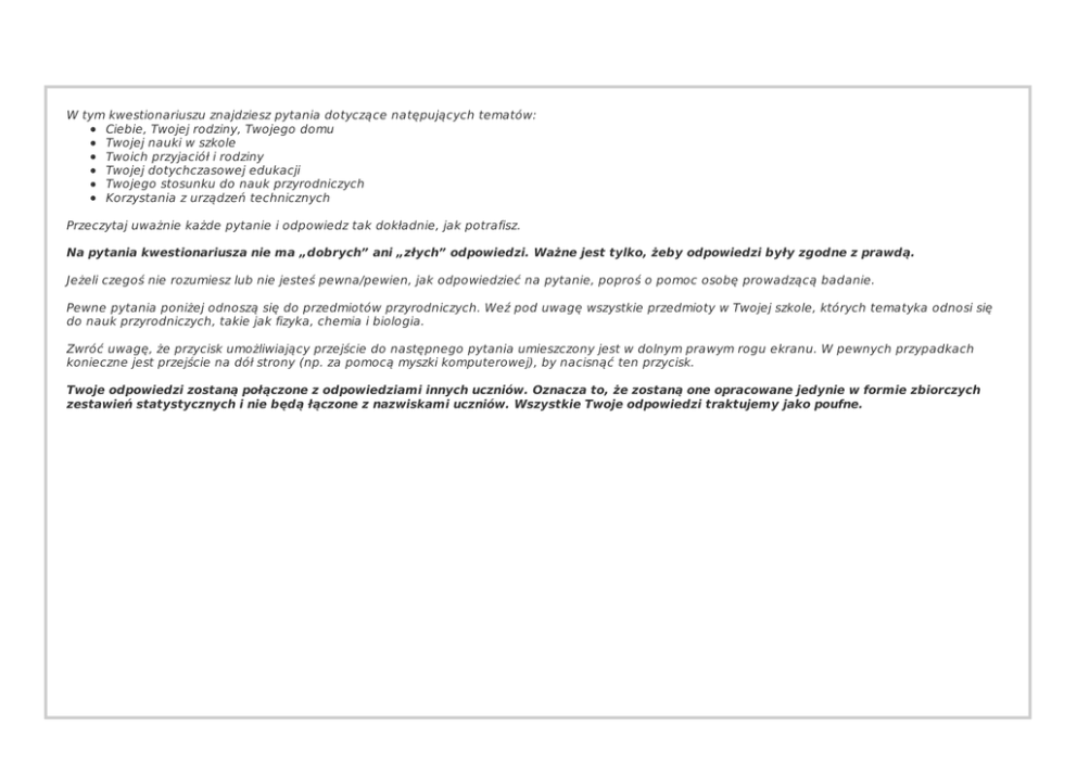 W tym kwestionariuszu znajdziesz pytania dotyczące natępujących tematów: Ciebie, Twojej rodziny, Twojego domu Twojej nauki w szkole Twoich przyjaciół i rodziny Twojej dotychczasowej edukacji Twojego stosunku do nauk przyrodniczych Korzystania z urządzeń technicznych Przeczytaj uważnie każde pytanie i odpowiedz tak dokładnie, jak potrafisz. Na pytania kwestionariusza nie ma „dobrych” ani „złych” odpowiedzi. Ważne jest tylko, żeby odpowiedzi były zgodne z prawdą. Jeżeli czegoś nie rozumiesz lub nie jesteś pewna/pewien, jak odpowiedzieć na pytanie, poproś o pomoc osobę prowadzącą badanie. Pewne pytania poniżej odnoszą się do przedmiotów przyrodniczych. Weź pod uwagę wszystkie przedmioty w Twojej szkole, których tematyka odnosi się do nauk przyrodniczych, takie jak fizyka, chemia i biologia. Zwróć uwagę, że przycisk umożliwiający przejście do następnego pytania umieszczony jest w dolnym prawym rogu ekranu. W pewnych przypadkach konieczne jest przejście na dół strony (np. za pomocą myszki komputerowej), by nacisnąć ten przycisk. Twoje odpowiedzi zostaną połączone z odpowiedziami innych uczniów. Oznacza to, że zostaną one opracowane jedynie w formie zbiorczych zestawień statystycznych i nie będą łączone z nazwiskami uczniów. Wszystkie Twoje odpowiedzi traktujemy jako poufne. Część A: Pytania dotyczące Ciebie, Twojej rodziny i Twojego domu Do której klasy uczęszczasz? (Wpisz oznaczenie klasy, np. 3a, 3b.) ST001C 01TA Do jakiej szkoły obecnie uczęszczasz? (Zaznacz jedną odpowiedź.) Gimnazjum Liceum ogólnokształcące Liceum profilowane Technikum Zasadnicza Szkoła Zawodowa ST002Q01TA01 ST002Q01TA02 ST002Q01TA03 ST002Q01TA04 ST002Q01TA05 Podaj swoją datę urodzenia. (Aby odpowiedzieć na pytanie, proszę wybrać dzień, miesiąc i rok z rozwijanej listy.) ST003Q01TA01 Dzień Wybierz... Dzień ( ST003Q01TA01 ) Wybierz... 01 02 03 04 05 06 07 08 09 10 11 12 13 14 15 16 17 18 19 20 21 22 23 24 25 26 27 28 29 30 31 ST003Q02TA01 Miesiąc Wybierz... Miesiąc ( ST003Q02TA01 ) Wybierz... Styczeń Luty Marzec Kwiecień Maj Czerwiec Lipiec Sierpień Wrzesień Październik Listopad Grudzień ST003Q03TA01 Rok Wybierz... Rok ( ST003Q03TA01 ) Wybierz... 1998 1999 2000 2001 Consistency check rule Rule: IF (^ST003Q01TA01 = null OR ^ST003Q02TA01 = null OR ^ST003Q03TA01 = null) Message: Wpisz proszę swoją dokładną datę urodzenia. Zaznacz swoją płeć. (Zaznacz jedną odpowiedź.) Kobieta Mężczyzna ST004Q01TA01 ST004Q01TA02 Jakie wykształcenie ma Twoja matka? (Zaznacz jedną odpowiedź: najwyższy ukończony, potwierdzony świadectwem lub dyplomem, poziom szkoły. Jeśli nie jesteś pewna/pewien, którą odpowiedź zaznaczyć, poproś o pomoc osobę przeprowadzającą badanie.) Podstawowe i niepełne podstawowe Zasadnicze zawodowe Średnie – technikum, liceum zawodowe Średnie – liceum ogólnokształcące Policealne/pomaturalne Licencjackie/inżynierskie Wyższe studia magisterskie lub lekarskie Posiada stopień doktora, doktora habilitowanego lub tytuł profesora ST005C 01TA01 ST005C 01TA02 ST005C 01TA03 ST005C 01TA04 ST005C 01TA05 ST005C 01TA06 ST005C 01TA07 ST005C 01TA08 Jakie wykształcenie ma Twój ojciec? (Zaznacz jedną odpowiedź: najwyższy ukończony, potwierdzony świadectwem lub dyplomem, poziom szkoły. Jeśli nie jesteś pewna/pewien, którą odpowiedź zaznaczyć, poproś o pomoc osobę przeprowadzającą badanie.) Podstawowe i niepełne podstawowe Zasadnicze zawodowe Średnie – technikum, liceum zawodowe Średnie – liceum ogólnokształcące Policealne/pomaturalne Licencjackie/inżynierskie Wyższe studia magisterskie lub lekarskie Posiada stopień doktora, doktora habilitowanego lub tytuł profesora ST007C 01TA01 ST007C 01TA02 ST007C 01TA03 ST007C 01TA04 ST007C 01TA05 ST007C 01TA06 ST007C 01TA07 ST007C 01TA08 Jaka jest obecna sytuacja zawodowa Twojej matki? (Zaznacz jedną odpowiedź.) Pracuje zarobkowo na pełnym etacie (wykonuje pracę najemną, pracuje na własny rachunek, w firmie rodzinnej, we własnym gospodarstwie rolnym) Pracuje zarobkowo na część etatu, wykonuje prace dorywcze Jest bezrobotna i aktywnie poszukuje pracy Inna (np. zajmuje się domem, jest na emeryturze, rencie) ST009Q01TA01 ST009Q01TA02 ST009Q01TA03 ST009Q01TA04 Jaka jest obecna sytuacja zawodowa Twojego ojca? (Zaznacz jedną odpowiedź.) Pracuje zarobkowo na pełnym etacie (wykonuje pracę najemną, pracuje na własny rachunek, w firmie rodzinnej, we własnym gospodarstwie rolnym) Pracuje zarobkowo na część etatu, wykonuje prace dorywcze Jest bezrobotny i aktywnie poszukuje pracy Inna (np. zajmuje się domem, jest na emeryturze, rencie) ST010Q01TA01 ST010Q01TA02 ST010Q01TA03 ST010Q01TA04 Czy masz w domu: (Zaznacz jedną odpowiedź w każdym wierszu.) Biurko do nauki Własny pokój Spokojne miejsce do nauki Komputer, którego możesz używać do nauki Edukacyjne programy komputerowe Dostęp do Internetu Literaturę klasyczną (np. Sienkiewicza) Zbiory poezji Dzieła sztuki (np. obrazy) Książki, które są pomocne w nauce Tak Nie ST011Q01TA01 ST011Q01TA02 ST011Q02TA01 ST011Q02TA02 ST011Q03TA01 ST011Q03TA02 ST011Q04TA01 ST011Q04TA02 ST011Q05TA01 ST011Q05TA02 ST011Q06TA01 ST011Q06TA02 ST011Q07TA01 ST011Q07TA02 ST011Q08TA01 ST011Q08TA02 ST011Q09TA01 ST011Q09TA02 ST011Q10TA01 ST011Q10TA02 Książki naukowo-techniczne Słownik DVD Telewizor plazmowy lub LCD Antenę satelitarną lub telewizję kablową z co najmniej 30 kanałami Książki o sztuce, muzyce, architekturze, projektowaniu Zmywarkę Aparat cyfrowy Drukarkę ST011Q11TA01 ST011Q11TA02 ST011Q12TA01 ST011Q12TA02 ST011Q13TA01 ST011Q13TA02 ST011Q14NA01 ST011Q14NA02 ST011Q15NA01 ST011Q15NA02 ST011Q16NA01 ST011Q16NA02 ST011Q17TA01 ST011Q17TA02 ST011Q18TA01 ST011Q18TA02 ST011Q19TA01 ST011Q19TA02 Ile z tych rzeczy jest w Twoim domu? (Zaznacz jedną odpowiedź w każdym wierszu.) Telewizor Samochód Łazienka Telefon komórkowy bez dostępu do Internetu Telefon komórkowy z dost