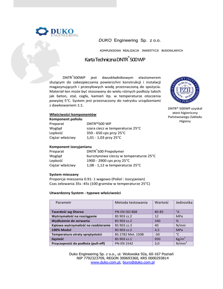 DUKO Engineering Sp. z o.o. KOMPLEKSOWA REALIZACJA INWESTYCJI BUDOWLANYCH KartaTechnicznaDNTR®500WP DNTR®500WP jest dwuskładnikowym elastomerem służącym do zabezpieczania powierzchni konstrukcji i instalacji magazynujących i przesyłowych wodę przeznaczoną do spożycia. Materiał ten może być stosowany do wielu różnych podłoży takich jak beton, stal, cegła, kamień itp. w temperaturze otoczenia powyżej 5°C. System jest przeznaczony do natrysku urządzeniami z dawkowaniem 1:1. Właściwości komponentów Komponent poliolu Preparat DNTR®500 WP Wygląd szara ciecz w temperaturze 25°C Lepkość 350 - 650 cps przy 25°C Ciężar właściwy 1,01 - 1,03 przy 25°C DNTR® 500WP uzyskał atest higieniczny Państwowego Zakładu Higieny Komponent izocyjanianu Preparat DNTR®500 Prepolymer Wygląd bursztynowa cieczy w temperaturze 25°C Lepkość 1900 - 2900 cps przy 25°C Ciężar właściwy 1,08 - 1,12 w temperaturze 25°C System mieszany Proporcje mieszania 0.91: 1 wagowo (Poliol : Izocyjanian) Czas żelowania 35s -45s (100 gramów w temperaturze 25°C) Utwardzony System - typowe właściwości Parametr Twardość wg Shorea Wytrzymałość na rozciąganie Wydłużenie do zerwania Kątowa wytrzymałość na rozdzieranie 100% Moduł Temperatura utraty sprężystości Gęstość Przyczepność do podłoża (pull-off) Metoda testowania Wartość Jednostka PN-EN ISO 868 BS 903 cz.2 BS 903 cz.2 BS 903 cz.3 BS 903 cz.2 BS 2782 Met. 150B BS 903 cz.1 PN-EN 1542 80-85 12 340 40 4,5 -50 950 3,0 °A MPa % N/mm MPa °C Kg/m3 N/mm2 Duko Engineering Sp. z o.o., ul. Wołowska 92a, 60-167 Poznań NIP 7792323709, REGON 300693360, KRS 0000293814 www.duko.com.pl, [email protected]
