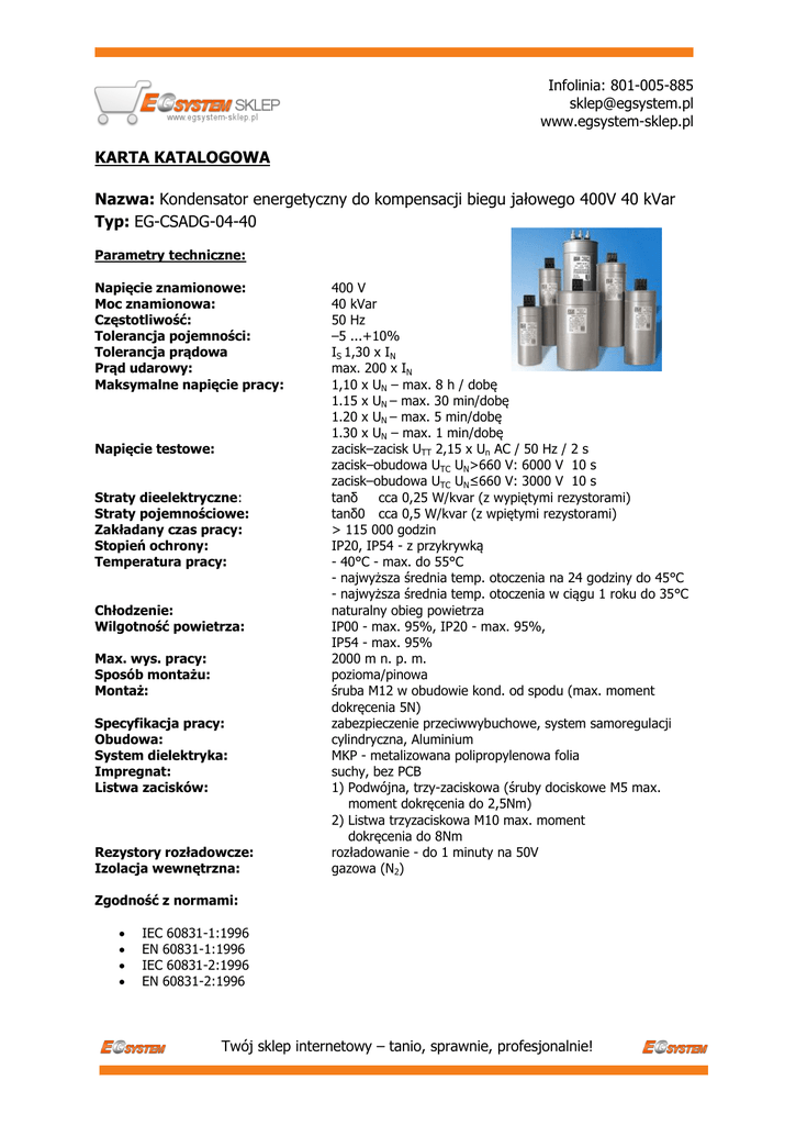 Infolinia: 801-005-885 [email protected] www.egsystem-sklep.pl KARTA KATALOGOWA Nazwa: Kondensator energetyczny do kompensacji biegu jałowego 400V 40 kVar Typ: EG-CSADG-04-40 Parametry techniczne: Napięcie znamionowe: Moc znamionowa: Częstotliwość: Tolerancja pojemności: Tolerancja prądowa Prąd udarowy: Maksymalne napięcie pracy: Napięcie testowe: Straty dieelektryczne: Straty pojemnościowe: Zakładany czas pracy: Stopień ochrony: Temperatura pracy: Chłodzenie: Wilgotność powietrza: Max. wys. pracy: Sposób montażu: Montaż: Specyfikacja pracy: Obudowa: System dielektryka: Impregnat: Listwa zacisków: Rezystory rozładowcze: Izolacja wewnętrzna: 400 V 40 kVar 50 Hz –5 ...+10% IS 1,30 x IN max. 200 x IN 1,10 x UN – max. 8 h / dobę 1.15 x UN – max. 30 min/dobę 1.20 x UN – max. 5 min/dobę 1.30 x UN – max. 1 min/dobę zacisk–zacisk UTT 2,15 x Un AC / 50 Hz / 2 s zacisk–obudowa UTC UN>660 V: 6000 V 10 s zacisk–obudowa UTC UN≤660 V: 3000 V 10 s tanδ cca 0,25 W/kvar (z wypiętymi rezystorami) tanδ0 cca 0,5 W/kvar (z wpiętymi rezystorami) > 115 000 godzin IP20, IP54 - z przykrywką - 40°C - max. do 55°C - najwyższa średnia temp. otoczenia na 24 godziny do 45°C - najwyższa średnia temp. otoczenia w ciągu 1 roku do 35°C naturalny obieg powietrza IP00 - max. 95%, IP20 - max. 95%, IP54 - max. 95% 2000 m n. p. m. pozioma/pinowa śruba M12 w obudowie kond. od spodu (max. moment dokręcenia 5N) zabezpieczenie przeciwwybuchowe, system samoregulacji cylindryczna, Aluminium MKP - metalizowana polipropylenowa folia suchy, bez PCB 1) Podwójna, trzy-zaciskowa (śruby dociskowe M5 max. moment dokręcenia do 2,5Nm) 2) Listwa trzyzaciskowa M10 max. moment dokręcenia do 8Nm rozładowanie - do 1 minuty na 50V gazowa (N2) Zgodność z normami: IEC 60831-1:1996 EN 60831-1:1996 IEC 60831-2:1996 EN 60831-2:1996 Twój sklep internetowy – tanio, sprawnie, profesjonalnie! Infolinia: 801-005-885 [email protected] www.egsystem-sklep.pl Zabezpieczenie przeciwwybuchowe kondensatorów CSADG Wymiary Twój sklep internetowy – tanio, sprawnie, profesjonalnie!