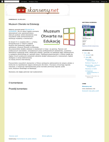 Udostępnij Utwórz bloga Następny blog» PONIEDZIAŁEK, 18 LIPCA 2011 WIZYTÓWKA FACEBOOKA Muzeum Otwrate na Edukację skanseny.net Właśnie powstał portal EDUKACJA W SKANSENIE. Ma on służyć będzie wymianie doświadczeń oraz upowszechnianiu dobrych praktyk wśród edukatorów oraz wszystkich osób zainteresowanych edukacją muzealną w skansenach. W dniach 9-11 września 2011 r. w Parku Etnograficznym w Tokarni (oddział Muzeum Wsi Kieleckiej) odbędzie się seminarium „Muzeum Otwarte na Edukację dla pracowników działów edukacji w skansenach w kraju i za granicą. Poprzez cykl praktycznych warsztatów, prowadzonych przez profesjonalnych edukatorów, uczestnicy seminarium wypracują nowe, atrakcyjne metody i pomysły na realizację zajęć edukacyjnych, a następnie skonfrontują je z opiniami dzieci. Publikacja poseminaryjna, w której znajdą się między innymi praktyczne wskazówki odnośnie działań edukacyjnych w skansenach, będzie dostępna w wersji elektronicznej na naszej stronie internetowej. Pracowników wszystkich skansenów w Polsce zachęcamy jednocześnie do wzięcia udziału w konkursie na najciekawsze zajęcia edukacyjne dla dzieci. Zwycięzcy otrzymają nagrody rzeczowe, a instytucja reprezentowana przez laureata pierwszej nagrody zyska tytuł „Muzeum Otwartego na Edukację”. Skanseny.net objęły patronat nad wydarzeniem. Wypromuj również swoją stronę ARCHIWUM BLOGA ▼ 2011 (9) ► sierpień (3) ▼ lipiec (6) Weekend w skansenach Konkurs “(op.cit.,)” Etnoklimaty - konkurs fotograficzny Wystawy w Ochli VI Festiwal Folklorystyczny w Opolu Muzeum Otwrate na Edukację 0 komentarze: O MNIE Skanseny.net Prześlij komentarz www.skanseny.net Wyświetl mój pełny profil Nowszy post Subskrybuj: Komentarze do posta (Atom) Strona główna Zaloguj się SHARE IT skanseny.net. Blog powstał ze środków Ministerstwa Kultury i Dziedzictwa Nardowego. Szablon Simple. Technologia Blogger.