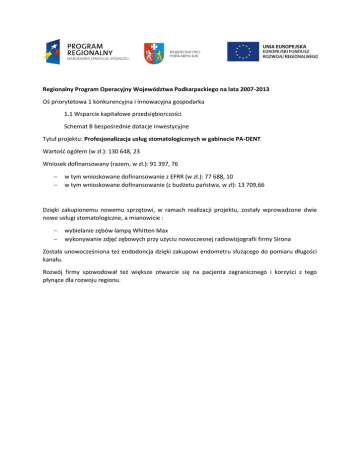 Regionalny Program Operacyjny Województwa Podkarpackiego na lata 2007-2013 Oś priorytetowa 1 konkurencyjna i innowacyjna gospodarka 1.1 Wsparcie kapitałowe przedsiębiorczości Schemat B bezpośrednie dotacje inwestycyjne Tytuł projektu: Profesjonalizacja usług stomatologicznych w gabinecie PA-DENT Wartość ogółem (w zł.): 130 648, 23 Wniosek dofinansowany (razem, w zł.): 91 397, 76 w tym wnioskowane dofinansowanie z EFRR (w zł.): 77 688, 10 w tym wnioskowane dofinansowanie (z budżetu państwa, w zł): 13 709,66 Dzięki zakupionemu nowemu sprzętowi, w ramach realizacji projektu, zostały wprowadzone dwie nowe usługi stomatologiczne, a mianowicie : wybielanie zębów lampą Whitten Max wykonywanie zdjęć zębowych przy użyciu nowoczesnej radiowizjografii firmy Sirona Została unowocześniona też endodoncja dzięki zakupowi endometru służącego do pomiaru długości kanału. Rozwój firmy spowodował też większe otwarcie się na pacjenta zagranicznego i korzyści z tego płynące dla rozwoju regionu.