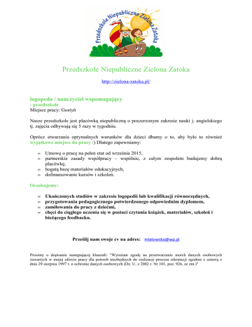 Przedszkole Niepubliczne Zielona Zatoka http://zielona-zatoka.pl/ logopeda / nauczyciel wspomagający - przedszkole Miejsce pracy: Gostyń Nasze przedszkole jest placówką niepubliczną o poszerzonym zakresie nauki j. angielskiego tj. zajęcia odbywają się 5 razy w tygodniu. Oprócz stwarzania optymalnych warunków dla dzieci dbamy o to, aby było to również wyjątkowe miejsce do pracy :) Dlatego zapewniamy: • • • • Umowę o pracę na pełen etat od września 2015, partnerskie zasady współpracy – wspólnie, z całym zespołem budujemy dobrą placówkę, bogatą bazę materiałów edukacyjnych, dofinansowanie kursów i szkoleń. Oczekujemy: • • • • Ukończonych studiów w zakresie logopedii lub kwalifikacji równorzędnych, przygotowania pedagogicznego potwierdzonego odpowiednim dyplomem, zamiłowania do pracy z dziećmi, chęci do ciągłego uczenia się w postaci czytania książek, materiałów, szkoleń i bieżącego feedbacku. Prześlij nam swoje cv na adres: [email protected] Prosimy o dopisanie następującej klauzuli: "Wyrażam zgodę na przetwarzanie moich danych osobowych zawartych w mojej ofercie pracy dla potrzeb niezbędnych do realizacji procesu rekrutacji zgodnie z ustawą z dnia 29 sierpnia 1997 r. o ochronie danych osobowych (Dz. U. z 2002 r. Nr 101, poz. 926, ze zm.)"