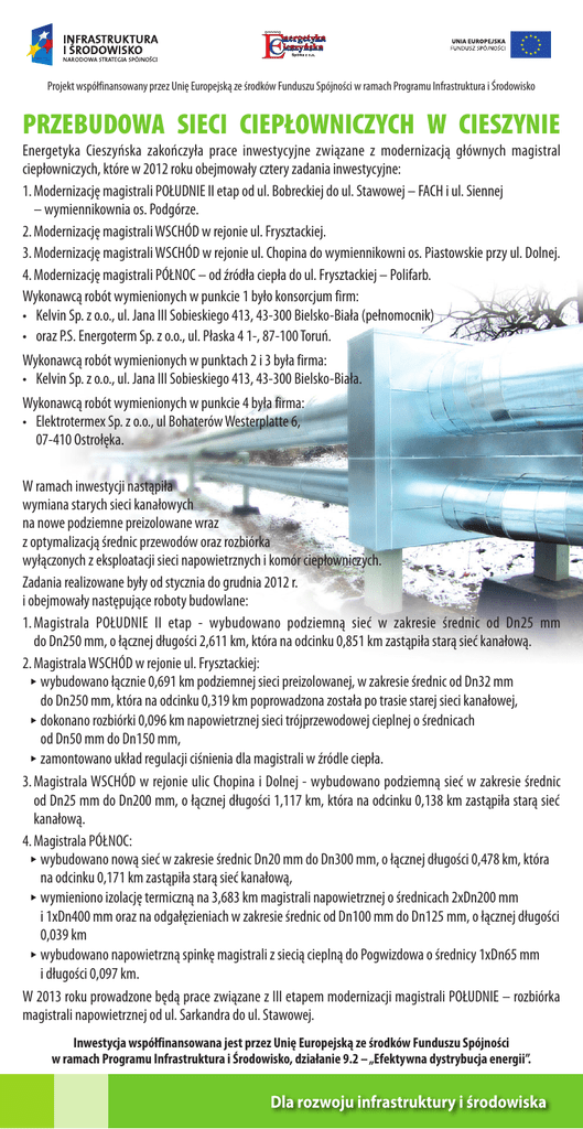 Projekt współfinansowany przez Unię Europejską ze środków Funduszu Spójności w ramach Programu Infrastruktura i Środowisko PRZEBUDOWA SIECI CIEPŁOWNICZYCH W CIESZYNIE Energetyka Cieszyńska zakończyła prace inwestycyjne związane z modernizacją głównych magistral ciepłowniczych, które w 2012 roku obejmowały cztery zadania inwestycyjne: 1.Modernizację magistrali POŁUDNIE II etap od ul. Bobreckiej do ul. Stawowej – FACH i ul. Siennej – wymiennikownia os. Podgórze. 2.Modernizację magistrali WSCHÓD w rejonie ul. Frysztackiej. 3.Modernizację magistrali WSCHÓD w rejonie ul. Chopina do wymiennikowni os. Piastowskie przy ul. Dolnej. 4.Modernizację magistrali PÓŁNOC – od źródła ciepła do ul. Frysztackiej – Polifarb. Wykonawcą robót wymienionych w punkcie 1 było konsorcjum firm: • Kelvin Sp. z o.o., ul. Jana III Sobieskiego 413, 43-300 Bielsko-Biała (pełnomocnik) • oraz P.S. Energoterm Sp. z o.o., ul. Płaska 4 1-, 87-100 Toruń. Wykonawcą robót wymienionych w punktach 2 i 3 była firma: • Kelvin Sp. z o.o., ul. Jana III Sobieskiego 413, 43-300 Bielsko-Biała. Wykonawcą robót wymienionych w punkcie 4 była firma: • Elektrotermex Sp. z o.o., ul Bohaterów Westerplatte 6, 07-410 Ostrołęka. W ramach inwestycji nastąpiła wymiana starych sieci kanałowych na nowe podziemne preizolowane wraz z optymalizacją średnic przewodów oraz rozbiórka wyłączonych z eksploatacji sieci napowietrznych i komór ciepłowniczych. Zadania realizowane były od stycznia do grudnia 2012 r. i obejmowały następujące roboty budowlane: 1.Magistrala POŁUDNIE II etap - wybudowano podziemną sieć w zakresie średnic od Dn25 mm do Dn250 mm, o łącznej długości 2,611 km, która na odcinku 0,851 km zastąpiła starą sieć kanałową. 2.Magistrala WSCHÓD w rejonie ul. Frysztackiej: ff wybudowano łącznie 0,691 km podziemnej sieci preizolowanej, w zakresie średnic od Dn32 mm do Dn250 mm, która na odcinku 0,319 km poprowadzona została po trasie starej sieci kanałowej, ff dokonano rozbiórki 0,096 km napowietrznej sieci trójprzewodowej cieplnej o średnicach od Dn50 mm do Dn150 mm, ff zamontowano układ regulacji ciśnienia dla magistrali w źródle ciepła. 3.Magistrala WSCHÓD w rejonie ulic Chopina i Dolnej - wybudowano podziemną sieć w zakresie średnic od Dn25 mm do Dn200 mm, o łącznej długości 1,117 km, która na odcinku 0,138 km zastąpiła starą sieć kanałową. 4.Magistrala PÓŁNOC: ff wybudowano nową sieć w zakresie średnic Dn20 mm do Dn300 mm, o łącznej długości 0,478 km, która na odcinku 0,171 km zastąpiła starą sieć kanałową, ff w ymieniono izolację termiczną na 3,683 km magistrali napowietrznej o średnicach 2xDn200 mm i 1xDn400 mm oraz na odgałęzieniach w zakresie średnic od Dn100 mm do Dn125 mm, o łącznej długości 0,039 km ff w ybudowano napowietrzną spinkę magistrali z siecią cieplną do Pogwizdowa o średnicy 1xDn65 mm i długości 0,097 km. W 2013 roku prowadzone będą prace związane z III etapem modernizacji magistrali POŁUDNIE – rozbiórka magistrali napowietrznej od ul. Sarkandra do ul. Stawowej. Inwestycja współfinansowana jest przez Unię Europejską ze środków Funduszu Spójności w ramach Programu Infrastruktura i Środowisko, działanie 9.2 – „Efektywna dystrybucja energii”. Dla rozwoju infrastruktury i środowiska