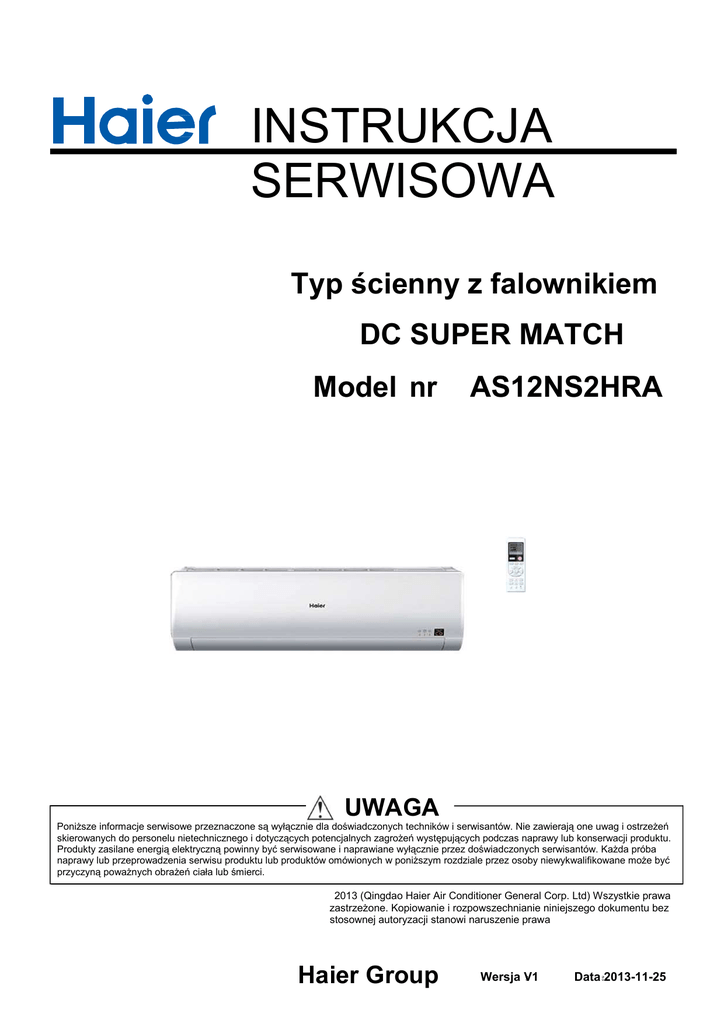 INSTRUKCJA SERWISOWA Typ ścienny z falownikiem DC SUPER MATCH Model nr AS12NS2HRA UWAGA Poniższe informacje serwisowe przeznaczone są wyłącznie dla doświadczonych techników i serwisantów. Nie zawierają one uwag i ostrzeżeń skierowanych do personelu nietechnicznego i dotyczących potencjalnych zagrożeń występujących podczas naprawy lub konserwacji produktu. Produkty zasilane energią elektryczną powinny być serwisowane i naprawiane wyłącznie przez doświadczonych serwisantów. Każda próba naprawy lub przeprowadzenia serwisu produktu lub produktów omówionych w poniższym rozdziale przez osoby niewykwalifikowane może być przyczyną poważnych obrażeń ciała lub śmierci. 2013 (Qingdao Haier Air Conditioner General Corp. Ltd) Wszystkie prawa zastrzeżone. Kopiowanie i rozpowszechnianie niniejszego dokumentu bez stosownej autoryzacji stanowi naruszenie prawa Haier Group Wersja V1 Data 2013-11-25 Spis treści Spis treści 1. Wprowadzenie 1 2. Cechy urządzenia 7 3. Parametry techniczne 8 4. Wykaz czujników 9 5. Schematy przewodów rurowych 10 6. Schemat połączeń płytki z obwodem drukowanym (PCB) 11 7. Funkcje i sterowanie 14 8. Konfiguracja systemu 25 9. Rysunki wymiarowe 33 10. Środek ciężkości 33 11. Diagnostyka serwisowa 34 12. Schematy obwodów 54 Klimatyzator ścienny Wprowadze 1 Wprowadzenie 1.1 Wyjaśnienie nazwy modelu A S 0 9 N B 1 H R A Dotyczy T1; 220~240V50HZ/1ph Falownik DC Jednostki wewnętrzne Numer wersji Platforma 35N Platforma jednostek wewnętrznych: N (platforma N) Wydajność chłodnicza (9000BTU/h) Typ jednostki wewnętrznej: S (naścienna) l Klimatyzator ścienny Wprowadze 1.2 Zasady bezpieczeństwa Należy przeczytać poniższe uwagi dotyczące bezpieczeństwa przed podjęciem prac serwisowych. Tekst zawiera ostrzeżenia i uwagi. Są one szczególnie ważne, ponieważ ich nieprzestrzeganie może prowadzić do śmierci lub poważnych obrażeń. Fragmenty oznaczone słowem „Ostrzeżenie“ lub „Uwaga“ informują, że w określonych okolicznościach może dojść do wypadku, jeśli opisane zasady nie będą przestrzegane. W związku z tym należy przestrzegać wszystkich takich zasad. Piktogramy Ten symbol oznacza element, w przypadku którego należy zachować ostrożność. Piktogram pokazuje element, względem którego należy zachować ostrożność. ○ Ten symbol oznacza zakazane działanie. Zakazany przedmiot lub działanie są pokazane wewnątrz lub w pobliżu symbolu. ● Ten symbol wskazuje na działania, które muszą być podjęte lub na określoną instrukcję. Instrukcja pokazana jest wewnątrz lub w pobliżu symbolu. Po zakończeniu prac serwisowych, należy przeprowadzić test, aby upewnić się, że sprzęt działa normalnie i wyjaśnić użytkownikowi bezpieczny sposób eksploatacji produktu. 1.2.1 Środki bezpieczeństwa podczas serwisowania Uwaga Odłączyć wtyczkę kabla zasilającego przed demontażem urządzenia do naprawy. Serwisowanie urządzeń podłączonych do zasilania może spowodować porażenie. Jeśli konieczne jest zapewnienie zasilania w celu przeprowadzenia naprawy lub kontroli obwodów, nie wolno dotykać komponentów znajdujących się pod napięciem. Jeśli podczas prac serwisowych dojdzie do wycieku czynnika chłodzącego, nie wolno go dotykać. Czynnik chłodzący może spowodować odmrożenia. Podczas odłączania rury ssącej lub tłoczącej sprężarki w części zgrzewanej, należy najpierw całkowicie uwolnić czynnik chłodzący w dobrze wentylowanym miejscu. Jeśli w sprężarce pozostaje gaz, może dojść do jego uwolnienia podczas odłączania przewodu, co może spowodować obrażenia. Jeśli czynnik chłodzący wycieknie podczas prac serwisowych, należy przewietrzyć pomieszczenie. Czynnika chłodzący może generować toksyczne gazy po wejściu w kontakt z ogniem. Kondensator podwyższający dostarcza prąd o wysokim napięciu do komponentów elektrycznych urządzenia zewnętrznego. Należy całkowicie rozładować kondensator przed podjęciem prac serwisowych. Naładowany kondensator może spowodować porażenie prądem elektrycznym. Nie uruchamiać ani nie wyłączać klimatyzatora poprzez wkładanie lub wyjmowanie wtyczki z gniazdka. Działanie takie może spowodować porażenie prądem elektrycznym lub pożar. 2 Klimatyzator ścienny Wprowadzenie Uwaga Nie prowadzić naprawy komponentów elektrycznych wilgotnymi rękoma. Praca wilgotnymi rękoma może spowodować porażenie prądem elektrycznym Nie czyścić klimatyzatora poprzez polewanie wodą. Mycie urządzenia wodą może spowodować porażenie prądem elektrycznym. Podczas naprawy urządzenia w wilgotnym lub mokrym miejscu należy zapewnić uziemienie, aby uniknąć porażenia prądem. Podczas czyszczenia urządzenia należy wyłączyć zasilanie i odłączyć przewód zasilający. Wewnętrzny wentylator obraca się z dużą prędkością i może spowodować obrażenia. Nie przechylać urządzenia podczas demontażu. Ciecz zgromadzona we wnętrzu urządzenia może rozlać się i zamoczyć meble i podłogę. Należy sprawdzić, czy sekcja układu chłodzącego wystarczająco ostygła przed podjęciem prac serwisowych. Praca na urządzeniu, gdy układ chłodzenia jest gorący może spowodować oparzenia. Zgrzewarki używać wyłącznie w dobrze wentylowanym miejscu. Korzystanie ze zgrzewarki w zamkniętym pomieszczeniu może spowodować niedobór tlenu. 1.2.2 Środki ostrożności w odniesieniu do urządzeń po naprawie Uwaga Należy korzystać z części wymienionych w wykazie części zamiennych dla danego modelu urządzenia, a także odpowiednich narzędzi do prowadzenia prac serwisowych. Nigdy nie należy podejmować prób modyfikowania sprzętu. Zastosowanie niewłaściwych części lub narzędzi może spowodować porażenie prądem elektrycznym, wytworzenie nadmiernej temperatury lub pożar. Podczas przenoszenia urządzenia, upewnić się, że nowe miejsce instalacji jest wystarczająco wytrzymałe, aby utrzymać c