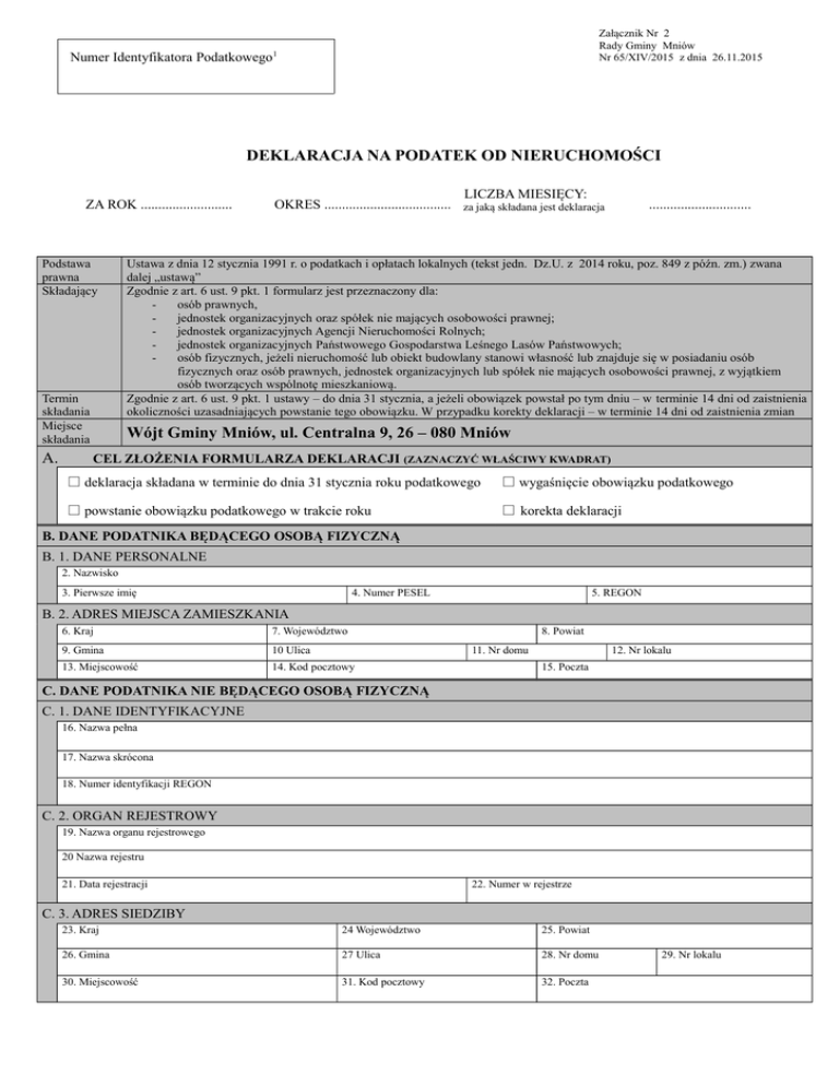 Załącznik Nr 2 Rady Gminy Mniów Nr 65/XIV/2015 z dnia 26.11.2015 do Uchwały Numer Identyfikatora Podatkowego1 i DEKLARACJA NA PODATEK OD NIERUCHOMOŚCI ZA ROK .......................... Podstawa prawna Składający Termin składania Miejsce składania A. LICZBA MIESIĘCY: OKRES ............................................... za jaką składana jest deklaracja ............................. Ustawa z dnia 12 stycznia 1991 r. o podatkach i opłatach lokalnych (tekst jedn. Dz.U. z 2014 roku, poz. 849 z późn. zm.) zwana dalej „ustawą” Zgodnie z art. 6 ust. 9 pkt. 1 formularz jest przeznaczony dla: osób prawnych, jednostek organizacyjnych oraz spółek nie mających osobowości prawnej; jednostek organizacyjnych Agencji Nieruchomości Rolnych; jednostek organizacyjnych Państwowego Gospodarstwa Leśnego Lasów Państwowych; osób fizycznych, jeżeli nieruchomość lub obiekt budowlany stanowi własność lub znajduje się w posiadaniu osób fizycznych oraz osób prawnych, jednostek organizacyjnych lub spółek nie mających osobowości prawnej, z wyjątkiem osób tworzących wspólnotę mieszkaniową. Zgodnie z art. 6 ust. 9 pkt. 1 ustawy – do dnia 31 stycznia, a jeżeli obowiązek powstał po tym dniu – w terminie 14 dni od zaistnienia okoliczności uzasadniających powstanie tego obowiązku. W przypadku korekty deklaracji – w terminie 14 dni od zaistnienia zmian Wójt Gminy Mniów, ul. Centralna 9, 26 – 080 Mniów CEL ZŁOŻENIA FORMULARZA DEKLARACJI (ZAZNACZYĆ WŁAŚCIWY KWADRAT) deklaracja składana w terminie do dnia 31 stycznia roku podatkowego wygaśnięcie obowiązku podatkowego powstanie obowiązku podatkowego w trakcie roku korekta deklaracji B. DANE PODATNIKA BĘDĄCEGO OSOBĄ FIZYCZNĄ B. 1. DANE PERSONALNE 2. Nazwisko 3. Pierwsze imię 4. Numer PESEL 5. REGON B. 2. ADRES MIEJSCA ZAMIESZKANIA 6. Kraj 7. Województwo 9. Gmina 10 Ulica 13. Miejscowość 14. Kod pocztowy 8. Powiat 11. Nr domu 12. Nr lokalu 15. Poczta C. DANE PODATNIKA NIE BĘDĄCEGO OSOBĄ FIZYCZNĄ C. 1. DANE IDENTYFIKACYJNE 16. Nazwa pełna 17. Nazwa skrócona 18. Numer identyfikacji REGON C. 2. ORGAN REJESTROWY 19. Nazwa organu rejestrowego 20 Nazwa rejestru 21. Data rejestracji 22. Numer w rejestrze C. 3. ADRES SIEDZIBY 23. Kraj 24 Województwo 25. Powiat 26. Gmina 27 Ulica 28. Nr domu 30. Miejscowość 31. Kod pocztowy 32. Poczta 29. Nr lokalu D. DANE O NIERUCHOMOŚCIACH I OBIEKTACH BUDOWLANYCH PODLEGAJĄCYCH OPODATKOWANIU LUB ICH ZWOLNIENIU D.1. POŁOŻENIE NIERUCHOMOŚCI 33. Położenie nieruchomości (adres) D.2. IDENTYFIKATORY GEODEZYJNE DZIAŁEK, BUDYNKÓW, LOKALI 34. Działki (obręb i nr działek) 35. Budynki 36. Lokale D.3. KSIĘGA WIECZYSTA 37. Numer księgi wieczystej (zbioru dokumentów) 38. Nazwa sądu E. DANE DOTYCZĄCE PRZEDMIOTU OPODATKOWANIA NIE ZWOLNIONEGO Z PODATKU Podstawa opodatkowania w m2 (ha) z dokładnością do 1 m2 PRZEDMIOT OPODATKOWANIA E.1. Grunty Stawka podatku Kwota podatku zł, gr zł, gr 39. 40. 41. Grunty związane z prowadzeniem działalności gospodarczej, bez względu 42. na sposób zakwalifikowania w ewidencji gruntów i budynków 43. 44. Grunty pod wodami powierzchniowymi stojącymi lub powierzchniowymi płynącymi jezior i zbiorników sztucznych 45 46. 47. Grunty pozostałe w tym zajętych na prowadzenie odpłatnej statutowej 48. działalności pozytku publicznego 49. 50. 51 52. 53. 1. Budynki mieszkalne ogółem 54. 55. 56. W tym kondygnacji od 1,40 do 2,20 m (zaliczyć 50% powierzchni) o wysokości: powyżej 2,20 m 57. 60. 61. wodami Niezabudowanych objętych obszarem rewitalizacji, o którym mowa w ustawie z dnia 9 października 2015 r. o rewitalizacji (Dz. U. poz. 1777), i położonych na terenach, dla których miejscowy plan zagospodarowania przestrzennego przewiduje przeznaczenie pod zabudowę mieszkaniową, usługową albo zabudowę o przeznaczeniu mieszanym obejmującym wyłącznie te rodzaje zabudowy, jeżeli od dnia wejścia w życie tego planu w odniesieniu do tych gruntów upłynął okres 4 lat, a w tym czasie nie zakończono budowy zgodnie z przepisami prawa budowlanego E.1. Budynki 58. 2. Związane z prowadzeniem działalności gospodarczej oraz części 59. budynków mieszkalnych zajęte na prowadzenie działalności gospodarczej – ogółem: W tym kondygnacji od 1,40 do 2,20 m (zaliczyć 50% powierzchni) o wysokości: powyżej 2,20 m 62. 63. 3. Zajęta na prowadzenie działalności gospodarczej w zakresie obrotu 64. kwalifikowanym materiałem siewnym – ogółem: W tym kondygnacji od 1,40 do 2,20 m (zaliczyć 50% powierzchni) o wysokości: powyżej 2,20 m 70. 71 75. 76 80. 81 68. 72. 73. 5. Pozostałe, w tym zajęte na prowadzenie odpłatnej statutowej 74. działalności pożytku publicznego przez organizacje pożytku publicznego – ogółem: W tym kondygnacji od 1,40 do 2,20 m (zaliczyć 50% powierzchni) o wysokości: powyżej 2,20 m 66. 67. 4. Zajęte na prowadzenie działalności gospodarczej w zakresie udzielania 69. świadczeń zdrowotnych – ogółem: W tym kondygnacji od 1,40 do 2,20 m (zaliczyć 50% powierzchni) o wysokości: powyżej 2,20 m 65. 77. 78. E.3. Budowle Budowle lub ich części związane z prowadzeniem działalności gospodarczej, o których mowa w art. 4 ust. 1 pkt. 3 i ust. 3-7 ustawy 79. RAZEM KWOTA PODATKU 82. KWOTA PODATKU Z POZ. 76 ZAOKRĄGLONA DO PEŁNYCH ZŁOTYCH *** 83. (KWOTA NALEŻNEGO PODATKU DO ZAPŁATY)**** F. INFORMACJA O PRZEDMIOTACH ZWOLNIONYCH (podać powierzchnię, bądź wartość budowli przedmiotów zwolnionych, stawkę podatku, kwotę zwolnienia oraz przepis prawa – z jakiego tytułu występuje zwolnienie) 96. Kraj 97. Województwo 98. Powiat 99. Gmina 100 Ulica 101. Nr domu 103. Miejscowość 104. Kod pocztowy 105. Poczta 102. Nr lokalu H. OŚWIADCZENIE I PODPIS PODATNIKA Oświadczam, że podane przeze mnie dane są zgodne z prawdą. PODPIS SKŁADAJĄCEGO / OSOBY REPREZENTUJĄCEJ SKŁADAJĄCEGO (niepotrzebne skreślić) 106. Imię 107. Nazwisko 108. Data wypełnienia deklaracji 109. Podp