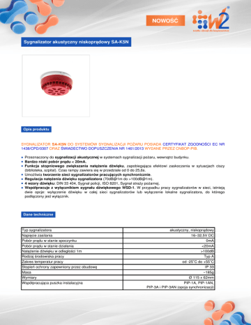 Sygnalizator akustyczny niskoprądowy SA-K5N Opis produktu SYGNALIZATOR SA-K5N DO SYSTEMÓW SYGNALIZACJI POŻARU POSIADA CERTYFIKAT ZGODNOŚCI EC NR 1438/CPD/0307 ORAZ ŚWIADECTWO DOPUSZCZENIA NR 1461/2013 WYDANE PRZEZ CNBOP-PIB. Przeznaczony do sygnalizacji akustycznej w systemach sygnalizacji pożaru, wewnątrz budynku. Bardzo niski pobór prądu < 20mA. Funkcja stopniowego zwiększania natężenia dźwięku, zapobiegająca efektowi zaskoczenia w sytuacjach ciszy (biblioteka, szpital). Czas rampy zawiera się w przedziale od 0 do 25,6s. Umożliwia tworzenie sieci sygnalizatorów pracujących synchronicznie. Regulacja natężenia dźwięku sygnalizatora (70dB@1m do >100dB@1m). 4 wzory dźwięku: DIN 33 404, Sygnał policji, ISO 8201, Sygnał straży pożarnej. Współpracuje z wyłącznikiem sygnału dźwiękowego WSD-1. W przypadku pracy sygnalizatorów w sieci, istnieją dwie opcje: wyłączenie dźwięku w całej sieci sygnalizatorów lub wyłączenie lokalne sygnalizatora, do którego podłączony jest wyłącznik. Dane techniczne Typ sygnalizatora akustyczny, niskoprądowy Napięcie zasilania 16–32,5V DC Pobór prądu w stanie spoczynku 0mA Pobór prądu w stanie działania <20mA Natężenie dźwięku w odległości 1m >100dB Rodzaj środowiska pracy Typ A Zakres temperatur pracy od -25˚C do +55˚C Stopień ochrony zapewniony przez obudowę Masa Wymiary Współpracująca puszka instalacyjna IP 33 ~185g Ø 115 x 62mm PIP-1A, PIP-1AN, PIP-3A i PIP-3AN (opcja synchronizacji) Schemat podłączenia VR ON-Opcja włączona OFF-Opcja wyłączona M/S ON-Tryb Master OFF-Tryb Slave S0 S1 Wzór dźwięku OFF OFF DIN 33 404 OFF ON Sygnał policji ON OFF ISO 8201 ON ON Sygnał straży pożarnej v04.10.07.2014 Powered by TCPDF (www.tcpdf.org) Nr pozycji Nazwa Funkcja 1 M/S Wybór trybu pracy master/slave 2 S0 Wybór wzoru dźwięku 3 S1 Wybór wzoru dźwięku 4 VR Włączenie/wyłączenie opcji stopniowego narastania głośności