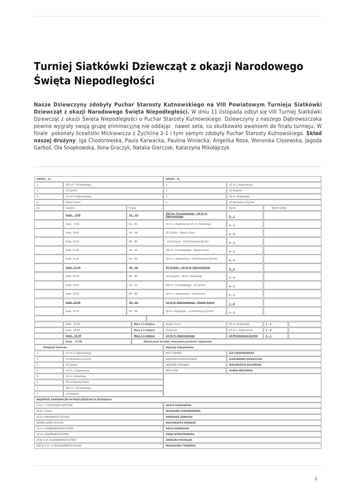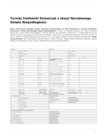 Turniej Siatkówki Dziewcząt z okazji Narodowego Święta Niepodległości Nasze Dziewczyny zdobyły Puchar Starosty Kutnowskiego na VIII Powiatowym Turnieju Siatkówki Dziewcząt z okazji Narodowego Święta Niepodległości. W dniu 11 listopada odbył się VIII Turniej Siatkówki Dziewcząt z okazji Święta Niepodległości o Puchar Starosty Kutnowskiego. Dziewczyny z naszego Dąbrowszczaka pewnie wygrały swoją grupę eliminacyjną nie oddając nawet seta, co skutkowało awansem do finału turnieju. W finale pokonały licealistki Mickiewicza z Żychlina 2-1 i tym samym zdobyły Puchar Starosty Kutnowskiego. Skład naszej drużyny: Iga Chodorowska, Paula Karwacka, Paulina Winiecka, Angelika Rosa, Weronika Ciszewska, Jagoda Garboś, Ola Snopkowska, Ilona Graczyk, Natalia Gierczak, Katarzyna Mikołajczyk GRUPA „ A „ GRUPA „ B „ 1. ZSZ im. Troczewskiego 1. LO im. J. Kasprowicza 2. ZS Żychlin 2. LO Gostynin 3. LO im H. Dąbrowskiego 3. ZS im. Grabskiego 4. Staszic Kutno 4. LO Mickiewicza Żychlin Lp. Godzina Grupa Godz. 9.00 A1 – A3 ZSZ im. Troczewskiego – LO im H. Dąbrowskiego Godz. 9.30 B1 – B3 LO im. J. Kasprowicza- ZS im. Grabskiego Godz. 10.00 A2 – A4 ZS Żychlin – Staszic Kutno Godz. 10.30 B2 – B4 LO Gostynin – LO Mickiewicza Żychlin Godz. 11.00 A1 – A4 ZSZ im. Troczewskiego – Staszic Kutno Godz. 11.30 B1 – B4 LO im. J. Kasprowicza – LO Mickiewicza Żychlin Godz. 12.00 A2 – A3 ZS Żychlin – LO im H. Dąbrowskiego Godz. 12.30 B2 – B3 LO Gostynin – ZS im. Grabskiego Godz. 13.00 A1 – A2 ZSZ im. Troczewskiego – ZS Żychlin Godz. 13.30 B1 – B2 LO im. J. Kasprowicza – LO Gostynin Godz. 14.00 A3 – A4 LO im H. Dąbrowskiego – Staszic Kutno Godz. 14.30 B3 – B4 ZS im. Grabskiego – LO Mickiewicza Żychlin Wynik Wyniki setów 0–2 2–1 2–0 0–2 0–2 0–2 0–2 1–2 0–2 2–1 2–0 1–2 Godz. 15.30 Mecz o 5 miejsce Staszic Kutno ZS im. Grabskiego 1–2 Godz. 16.00 Mecz o 3 miejsce ZS Żychlin LO im. J. Kasprowicza 2–0 Godz. 16.30 Mecz o 1 miejsce LO im H. Dąbrowskiego LO Mickiewicza Żychlin 2–1 Godz. 17.00 Kolejność końcowa Zakończenie turnieju, wręczenie pucharów i dyplomów Nagrody Indywidualne 1. LO im H. Dąbrowskiego MVP TURNIEJU IGA CHODOROWSKA 2. LO Mickiewicza Żychlin NAJLEPSZA ROZGRYWAJĄCA ALEKSANDRA KOWALCZUK 3. ZS Żychlin NAJLEPIEJ ATAKUJĄCA MAŁGORZATA BALCERZAK 4. LO im. J. Kasprowicza MISS FOTO OLIWIA MEDYŃSKA 5. ZS im. Grabskiego 6. ZS im.Staszica Kutno 7. ZSZ im. Troczewskiego 7. LO Gostynin NAJLEPSZE ZAWODNICZKI W POSZCZEGÓLNYCH ZESPOŁACH LO im. T. KOŚCIUSZKI GOSTYNIN AGATA PAWŁOWSKA ZS Nr 1 Kutno MICHALINA LEWANDOWSKA LO im A.MICKIEWICZ ŻYCHLIN WERONIKA ŻERNICKA ZESPÓŁ SZKÓŁ ŻYCHLIN MAŁGORZATA KIEŁBASA LO im. H.DĄBROWSKIEGO KUTNO PAULA KARWACKA LO im. J.KASPROWICZ KUTNO KINGA WYRZYKOWSKA ZS Nr 3 im. W.GRABSKIEGO KUTNO ANGELIKA MICHALAK ZSZ Nr 2 im. A.TROCZEWSKIEGO KUTNO MAGDALENA TYRAŃSKA 1