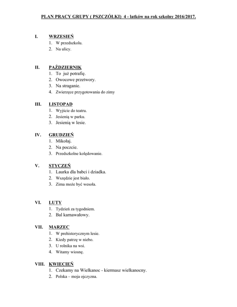 PLAN PRACY GRUPY ( PSZCZÓŁKI) 4 - latków na rok szkolny 2016/2017. I. WRZESIEŃ 1. W przedszkolu. 2. Na ulicy. II. PAŹDZIERNIK 1. To już potrafię. 2. Owocowe przetwory. 3. Na straganie. 4. Zwierzęce przygotowania do zimy III. LISTOPAD 1. Wyjście do teatru. 2. Jesienią w parku. 3. Jesienią w lesie. IV. GRUDZIEŃ 1. Mikołaj. 2. Na poczcie. 3. Przedszkolne kolędowanie. V. STYCZEŃ 1. Laurka dla babci i dziadka. 2. Wszędzie jest biało. 3. Zima może być wesoła. VI. LUTY 1. Tydzień za tygodniem. 2. Bal karnawałowy. VII. MARZEC 1. W prehistorycznym lesie. 2. Kiedy patrzę w niebo. 3. U rolnika na wsi. 4. Witamy wiosnę. VIII. KWIECIEŃ 1. Czekamy na Wielkanoc - kiermasz wielkanocny. 2. Polska – moja ojczyzna. IX. MAJ 1. Dzień Rodzica. 2. Wycieczka. 3. Dbamy o środowisko. X. CZERWIEC 1. Moja ulubiona książka. 2. Kim będę, gdy dorosnę? XI. LIPIEC 1. Zakończenie roku szkolnego. Opracowanie: mgr Katarzyna Raczkiewicz Wrzesień 2016 PLAN PRACY został opracowany w oparciu o program wychowania przedszkolnego „TROPICIELE. Czterolatek”. Nauczyciel zastrzega sobie prawo do wprowadzenia zmian w realizacji niektórych tematów lub zmianie ich kolejności.