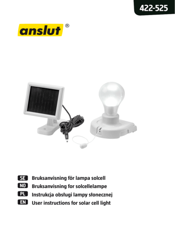 422-525 Bruksanvisning för lampa solcell Bruksanvisning for solcellelampe Instrukcja obsługi lampy słonecznej User instructions for solar cell light SE - NO - PL - EN - Bruksanvisning i original Bruksanvisning i original Instrukcja obsługi w oryginale Operating instructions in original Date of production: 2014-11-25 © Jula AB SVENSKA������������������������������������������������������������������������������������������������������������������ 4 SÄKERHETSANVISNINGAR����������������������������������������������������������������������������������������������������������������������4 TEKNISKA DATA ��������������������������������������������������������������������������������������������������������������������������������������4 Handhavande��������������������������������������������������������������������������������������������������������������������������������������4 Placering��������������������������������������������������������������������������������������������������������������������������������������������������4 Ladda��������������������������������������������������������������������������������������������������������������������������������������������������������4 Användning���������������������������������������������������������������������������������������������������������������������������������������������� 5 Underhåll��������������������������������������������������������������������������������������������������������������������������������������������5 Felsökning������������������������������������������������������������������������������������������������������������������������������������������� 6 NORSK����������������������������������������������������������������������������������������������������������������������8 SIKKERHETSANVISNINGER��������������������������������������������������������������������������������������������������������������������� 8 TEKNISKE DATA��������������������������������������������������������������������������������������������������������������������������������������� 8 Håndtering����������������������������������������������������������������������������������������������������������������������������������������� 8 Plassering ���������������������������������������������������������������������������������������������������