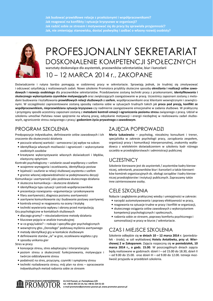 Jak budować prawidłowe relacje z przełożonymi i współpracownikami? Jak reagować na konflikty i sytuacje kryzysowe w organizacji? Jak radzić sobie ze stresem i motywować się do pracy by sprawiała przyjemność? Jak, nie zmieniając stanowiska, dostać podwyżkę i zadbać o własny rozwój osobisty? PROFESJONALNY SEKRETARIAT DOSKONALENIE KOMPETENCJI SPOŁECZNYCH warsztaty doskonalące dla asystentek, pracowników sekretariatów, biur i kancelarii 10 – 12 MARCA 2014 r., ZAKOPANE Doświadczenie i rutyna bardzo pomagają w codziennej pracy w sekretariacie. Sprawiają jednak, że trudniej się zmotywować i odczuwać satysfakcję z realizowanych zadań. Nowe szkolenie Promotora przybliży skuteczne sposoby określania i realizacji celów zawodowych i rozwoju osobistego dla pracowników sekretariatów. Przedstawione zostaną techniki pracy z przekonaniami, identyfikowania i skutecznego wykorzystania czynników motywujących oraz zwiększających zaangażowanie w pracę. Uczestnicy zapoznani zostaną z metodami budowania i kształtowania prawidłowych relacji służbowych z szefem, współpracownikami oraz klientami wewnętrznymi i zewnętrznymi. W szczególności zaprezentowane zostaną sposoby radzenia sobie w sytuacjach trudnych takich jak praca pod presją, konflikt ze współpracownikiem, nieprzewidziana sytuacja kryzysowa czy nadmierne zaangażowanie emocjonalne w zadania służbowe. W praktyczny i przystępny sposób uczestnicy zapoznani zostaną z metodami kontroli emocji i ograniczenia poziomu stresu związanego z pracą. Udział w szkoleniu umożliwi Państwu nowe spojrzenie na własną pracę, odzyskanie motywacji i energii niezbędnej w realizowaniu zadań służbowych, ograniczenie stresu związanego z pracą i godzeniem życia prywatnego z zawodowym. PROGRAM SZKOLENIA ZAJĘCIA POPROWADZI Predyspozycje indywidualne, definiowanie celów zawodowych i ich znaczenie dla skuteczności działania • poczucie własnej wartości - samoocena i jej wpływ na sukces • identyfikacja własnych możliwości i ograniczeń – wykorzystanie osobistych zasobów • kreatywne wykorzystywanie własnych doświadczeń i błędów, elastyczny optymizm Kontrakt psychologiczny – ustalanie zasad współpracy z szefem • wzajemne wymagania i oczekiwania, identyfikacja postaw • lojalność i zaufanie w relacji służbowej asystenta z szefem • granice własnej odpowiedzialności w podejmowaniu decyzji Komunikacja i asertywność jako podstawa skutecznego działania • skuteczna komunikacja – skuteczne działanie • identyfikacja typu sytuacji i potrzeb współpracowników • prezentacja rozwiązania –argumentacja i przekonywanie • filary asertywności, diagnoza poziomu asertywności • asertywne komunikowanie się i budowanie postawy asertywnej • kontrola emocji w reagowaniu na oceny i krytykę • techniki wywierania wpływu i obrony przed manipulacją Gry psychologiczne w kontaktach służbowych • dlaczego gramy? – nieuświadomione metody działania • kluczowe pojęcia w analizie transakcyjnej • w co grają ludzie? – rodzaje i specyfika gier psychologicznych • wewnętrzny głos „Dorosłego” podstawą myślenia asertywnego • metody identyfikacji gry w kontakcie służbowym • definiowanie stanów „Ja” w grze, oczekiwana wypłata z gry • sposoby unikania gier Stres w pracy • koncepcje stresu, stres adaptacyjny i interpretacyjny • poziom stresu a skuteczność funkcjonowania, motywujące i twórcze oddziaływanie stresu • podatność na stres, przyczyny, czynniki i symptomy stresu • techniki rozładowania stresu; mój plan na stres – opracowanie indywidualnych metod radzenia sobie ze stresem Maria Łukasiewicz – psycholog, niezależny konsultant i trener, specjalistka w zakresie psychologii pracy, zarządzania zespołem, organizacji pracy i komunikacji interpersonalnej, znakomity wykładowca z wieloletnim doświadczeniem w szkoleniu kadr różnego szczebla w przedsiębiorstwach i administracji publicznej UCZESTNICY Szkolenie kierowane jest do asystentek / asystentów kadry kierowniczej, sekretarek, pracowników biur i kancelarii a także kierowników komórek organizacyjnych ds. obsługi zarządów i kadry kierowniczej przedsiębiorstw i instytucji publicznych. Zapraszamy także inne zainteresowane osoby. CELE SZKOLENIA Nabycie i pogłębienie praktycznej wiedzy i umiejętności w zakresie: • narzędzi automotywowania i poprawy efektywności w pracy, • reagowania na sytuacje trudne w pracy i konflikt w organizacji, • skutecznego osiągania celów zawodowych z wykorzystaniem kompetencji psychologicznych i społecznych, • radzenia sobie ze stresem, poprawy komfortu psychicznego i samorealizacji w pracy w biurze / sekretariacie. CZAS I MIEJSCE SZKOLENIA Szkolenie odbędzie się w dniach 10 – 12 marca 2014 r. (poniedziałek - środa), w sali wykładowej Hotelu Antałówka, przy ul. Wierchowej 2 w Zakopanem. Zajęcia rozpoczną się w poniedziałek, 10 marca 2014 r., o godz. 15.00. W poszczególnych dniach zajęcia będą realizowane w godzinach: dzień I – od 15.00 do 18.30, dzień II – od 9.00 do 15.00. oraz dzień III – od 9.00 do 12.00. Istnieje możliwość przyjazdu w przeddzień szkolenia. 61-512 Poznań, ul. Pamiątkowa 2/8 tel. +48 61 855 23 14, fax +48 61 224 51 63 e-mail [email protected], www.promotor.poznan.pl PROFESJONALNY SEKRETARIAT DOSKONALENIE KOMPETENCJI SPOŁECZNYCH WARUNKI UCZESTNICTWA Cena uczestnictwa jednej osoby w szkoleniu wynosi 770,- PLN*. Cena obejmuje zajęcia warsztatowe, konsultacje, bogate materiały szkoleniowe, przybory do pisania, imienny certyfikat ukończenia szkolenia, poczęstunek i obiady. Cena nie obejmuje kosztów zakwaterowania. Stałym klientom proponujemy preferencyjne warunki uczestnictwa. Istnieje także możliwość uzyskania zniżki w przypadku zgłoszenia na szkolenie więcej niż jednej osoby z jednostki. Warunkiem przyjęcia na listę uczestników jest przesłanie do biura CEM