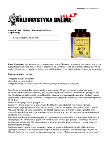 Utworzono: 2017-03-08 06:17:53 Caprylic Acid 600mg - 60 softgels (Kwas Kaprylowy) Cena produktu: 23,90 PLN Kwas Kaprylowy jest kwasem tłuszczowym nasyconym. Skuteczny w walce z kandydozą, skuteczna porcja tej substancji to min. 350mg, w produkcie od SWANSON jest go aż 60mg. Hamuje apetyt na słodycze (częsty przy grzybicy), działa przeciwbakteryjnie, przeciwbiegunkowo oraz przeciwzapalnie. Krótka charakterystyka: ● ● ● Wspiera funkcje trawienne Reguluje środowisko jelit Wspiera walkę z Candidia Albicans, który wywołuje drożdżycę (kandydozę) Caprylic Acid ma szerokie zastosowanie pro-zdrowotne. Skuteczny preparat musi zawierać zmaksymalizowany kwas kaprylowy, tak aby jedna tabletka zawierała już skuteczną porcję ok. 350 mg. Na stabilność i aktywność tego składnika wpływają warunki przechowywania. Szklane ciemne opakowanie zagwarantuje stabilność i pełną potencję preparatu przez cały czas zażywania (optimum 30-50 dni). Zastosowanie preparatu w przypadku: Drożdżycy - kwas łącząc się z komórkami drożdżaków, powoduje ich rozerwanie i śmierć. Systematyczne przyjmowanie kwasu kaprylowego pozwala zmniejszyć ilość drożdżaków (Candida Albicans) nawet o 30-90% po zaledwie 16 dniach suplementacji. Należy jednak pamiętać że w przypadku kandydozy należy go wprowadzać stopniowo, aby zapobiec wydzielaniu się toksycznych substancji z drożdżaków. Zapalenia układu pokarmowego - pobudza regenerację nabłonka jelita grubego i poprawia funkcje absorpcyjne jelit. Przyspiesza gojenie owrzodzeń jelita cienkiego i grubego. Zapobiega zmianom zapalnym w ścianie jelit. Ma zastosowanie w leczeniu zespołu jelita drażliwego i wrzodziejącego zapalenia jelita grubego. Zapalenia bakteryjnego - kwas kaprylowy działa na komórki bakteryjne dzięki właściwościom lipofilnym (skłonności do rozpuszczania się w tłuszczu). Wykazano, że działa silniej hamująco na Shigella (pałeczki czerwonki) niż kwas propionowy i octowy. Zażywanie kwasu kaprylowego może zapobiegać chorobom bakteryjnym przewodu pokarmowego. Badania na University of Connecticut w 2005 roku wykazały, że wrażliwość na kwas kaprylowy prezentowały bakterie: Streptococcus agalactiae, Streptococcus dysgalactiae, Streptococcus uberis, Streptococcus aureus, mniej wrażliwa była Escherichia coli. Jakie są objawy kandydozy? ● ● ● ● ● ● ● Chroniczne zmęczenie, brak energii, ogólne złe samopoczucie, spadek libido Ze strony układu żołądkowo-jelitowego: pleśniawki, wzdęcia i wiatry, skurcze jelit, swędzenie odbytnicy, zmiana czynności jelit Infekcje pochwy, częste infekcje pęcherza Głównie dolegliwości związane z menstruacją Depresja, drażliwość, niezdolność do koncentracji Alergie, nadwrażliwość na substancje chemiczne, spadek odporności Łaknienie produktów bogatych w węglowodany lub drożdże Skład: Porcja: 1 softgel Porcji w opakowaniu: 60 Opakowanie: 60 softgels Składniki aktywne w porcji (1 softgel) Wartość energetyczna 10 kcal Tłuszcz 1g Kwas Kaprylowy (triglicerydy o średniej długości łańcucha) 600 mg Dawkowanie: Zaleca się stosowanie jednej kapsułki dwa razy dziennie, przed posiłkiem, popijając wodą. Adres: http://www.ko.sklep.pl/ Telefon: kom. 782 010 880 Email: [email protected]