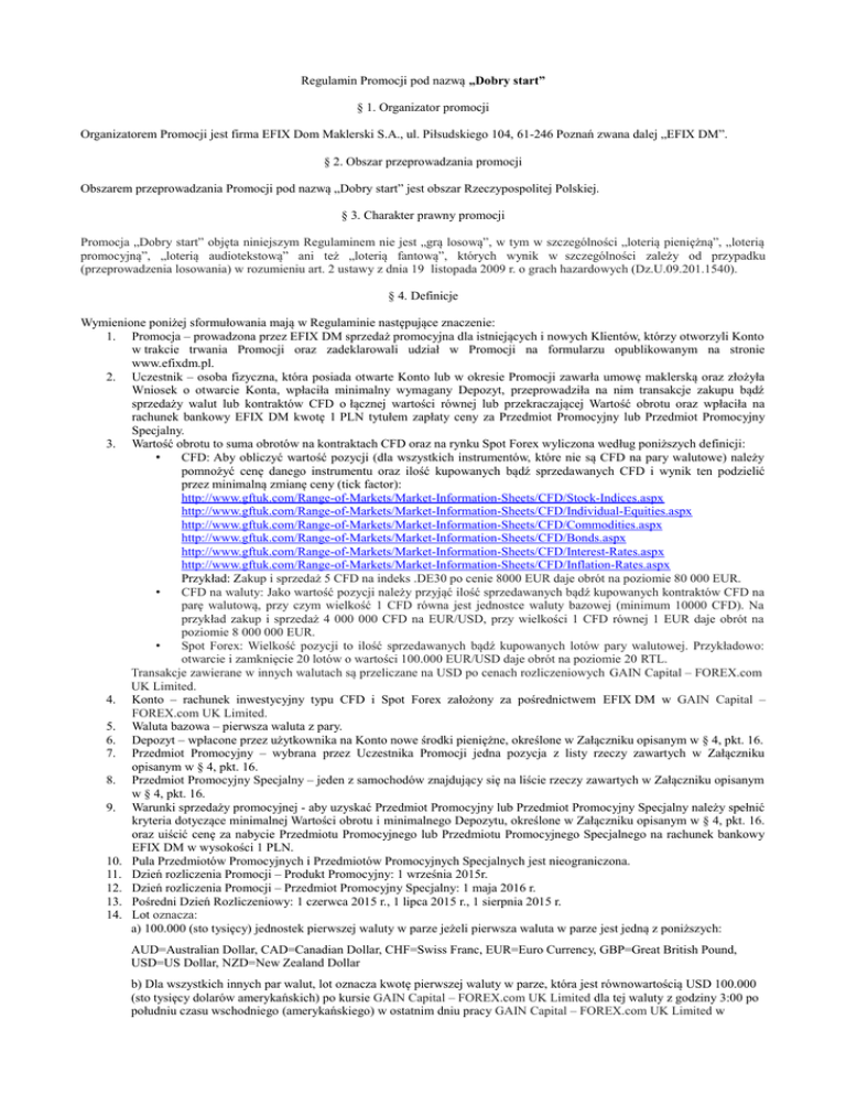 Regulamin Promocji pod nazwą „Dobry start” § 1. Organizator promocji Organizatorem Promocji jest firma EFIX Dom Maklerski S.A., ul. Piłsudskiego 104, 61-246 Poznań zwana dalej „EFIX DM”. § 2. Obszar przeprowadzania promocji Obszarem przeprowadzania Promocji pod nazwą „Dobry start” jest obszar Rzeczypospolitej Polskiej. § 3. Charakter prawny promocji Promocja „Dobry start” objęta niniejszym Regulaminem nie jest „grą losową”, w tym w szczególności „loterią pieniężną”, „loterią promocyjną”, „loterią audiotekstową” ani też „loterią fantową”, których wynik w szczególności zależy od przypadku (przeprowadzenia losowania) w rozumieniu art. 2 ustawy z dnia 19 listopada 2009 r. o grach hazardowych (Dz.U.09.201.1540). § 4. Definicje Wymienione poniżej sformułowania mają w Regulaminie następujące znaczenie: 1. Promocja – prowadzona przez EFIX DM sprzedaż promocyjna dla istniejących i nowych Klientów, którzy otworzyli Konto w trakcie trwania Promocji oraz zadeklarowali udział w Promocji na formularzu opublikowanym na stronie www.efixdm.pl. 2. Uczestnik – osoba fizyczna, która posiada otwarte Konto lub w okresie Promocji zawarła umowę maklerską oraz złożyła Wniosek o otwarcie Konta, wpłaciła minimalny wymagany Depozyt, przeprowadziła na nim transakcje zakupu bądź sprzedaży walut lub kontraktów CFD o łącznej wartości równej lub przekraczającej Wartość obrotu oraz wpłaciła na rachunek bankowy EFIX DM kwotę 1 PLN tytułem zapłaty ceny za Przedmiot Promocyjny lub Przedmiot Promocyjny Specjalny. 3. Wartość obrotu to suma obrotów na kontraktach CFD oraz na rynku Spot Forex wyliczona według poniższych definicji: • CFD: Aby obliczyć wartość pozycji (dla wszystkich instrumentów, które nie są CFD na pary walutowe) należy pomnożyć cenę danego instrumentu oraz ilość kupowanych bądź sprzedawanych CFD i wynik ten podzielić przez minimalną zmianę ceny (tick factor): http://www.gftuk.com/Range-of-Markets/Market-Information-Sheets/CFD/Stock-Indices.aspx http://www.gftuk.com/Range-of-Markets/Market-Information-Sheets/CFD/Individual-Equities.aspx http://www.gftuk.com/Range-of-Markets/Market-Information-Sheets/CFD/Commodities.aspx http://www.gftuk.com/Range-of-Markets/Market-Information-Sheets/CFD/Bonds.aspx http://www.gftuk.com/Range-of-Markets/Market-Information-Sheets/CFD/Interest-Rates.aspx http://www.gftuk.com/Range-of-Markets/Market-Information-Sheets/CFD/Inflation-Rates.aspx Przykład: Zakup i sprzedaż 5 CFD na indeks .DE30 po cenie 8000 EUR daje obrót na poziomie 80 000 EUR. • CFD na waluty: Jako wartość pozycji należy przyjąć ilość sprzedawanych bądź kupowanych kontraktów CFD na parę walutową, przy czym wielkość 1 CFD równa jest jednostce waluty bazowej (minimum 10000 CFD). Na przykład zakup i sprzedaż 4 000 000 CFD na EUR/USD, przy wielkości 1 CFD równej 1 EUR daje obrót na poziomie 8 000 000 EUR. • Spot Forex: Wielkość pozycji to ilość sprzedawanych bądź kupowanych lotów pary walutowej. Przykładowo: otwarcie i zamknięcie 20 lotów o wartości 100.000 EUR/USD daje obrót na poziomie 20 RTL. Transakcje zawierane w innych walutach są przeliczane na USD po cenach rozliczeniowych GAIN Capital – FOREX.com UK Limited. 4. Konto – rachunek inwestycyjny typu CFD i Spot Forex założony za pośrednictwem EFIX DM w GAIN Capital – FOREX.com UK Limited. 5. Waluta bazowa – pierwsza waluta z pary. 6. Depozyt – wpłacone przez użytkownika na Konto nowe środki pieniężne, określone w Załączniku opisanym w § 4, pkt. 16. 7. Przedmiot Promocyjny – wybrana przez Uczestnika Promocji jedna pozycja z listy rzeczy zawartych w Załączniku opisanym w § 4, pkt. 16. 8. Przedmiot Promocyjny Specjalny – jeden z samochodów znajdujący się na liście rzeczy zawartych w Załączniku opisanym w § 4, pkt. 16. 9. Warunki sprzedaży promocyjnej - aby uzyskać Przedmiot Promocyjny lub Przedmiot Promocyjny Specjalny należy spełnić kryteria dotyczące minimalnej Wartości obrotu i minimalnego Depozytu, określone w Załączniku opisanym w § 4, pkt. 16. oraz uiścić cenę za nabycie Przedmiotu Promocyjnego lub Przedmiotu Promocyjnego Specjalnego na rachunek bankowy EFIX DM w wysokości 1 PLN. 10. Pula Przedmiotów Promocyjnych i Przedmiotów Promocyjnych Specjalnych jest nieograniczona. 11. Dzień rozliczenia Promocji – Produkt Promocyjny: 1 września 2015r. 12. Dzień rozliczenia Promocji – Przedmiot Promocyjny Specjalny: 1 maja 2016 r. 13. Pośredni Dzień Rozliczeniowy: 1 czerwca 2015 r., 1 lipca 2015 r., 1 sierpnia 2015 r. 14. Lot oznacza: a) 100.000 (sto tysięcy) jednostek pierwszej waluty w parze jeżeli pierwsza waluta w parze jest jedną z poniższych: AUD=Australian Dollar, CAD=Canadian Dollar, CHF=Swiss Franc, EUR=Euro Currency, GBP=Great British Pound, USD=US Dollar, NZD=New Zealand Dollar b) Dla wszystkich innych par walut, lot oznacza kwotę pierwszej waluty w parze, która jest równowartością USD 100.000 (sto tysięcy dolarów amerykańskich) po kursie GAIN Capital – FOREX.com UK Limited dla tej waluty z godziny 3:00 po południu czasu wschodniego (amerykańskiego) w ostatnim dniu pracy GAIN Capital – FOREX.com UK Limited w miesiącu. Aby określić liczbę transakcji należy podzielić łączną równowartość pierwszych walut w parze przez 100.000 USD. 15. Round Turn Lot (RTL) – otwarcie i zamknięcie pozycji o wielkości jednego lota (100 000 jednostek otwarcie pozycji plus 100 000 jednostek zamknięcie pozycji). 16. Załącznik – wykaz Przedmiotów Promocyjnych oraz Przedmiotów Promocyjnych Specjalnych biorących udział w Promocji wraz z podaną minimalną Wartością obrotu w USD oraz minimalną wielkością Depozytu w USD (lub równowartość w innej walucie)., stanowiący integralną część Regulaminu Promocji pod nazwą „Dobry start”. § 5. Czas trwania Promocji Promocja rozpoczyna się w dniu 1 maja 2015 r. od godz