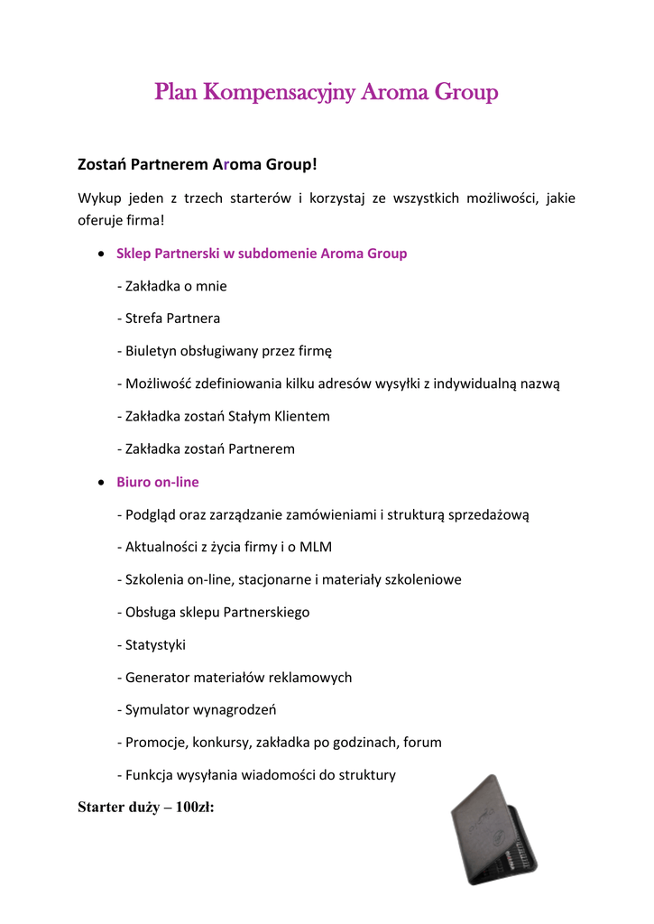 Plan Kompensacyjny Aroma Group Zostań Partnerem Aroma Group! Wykup jeden z trzech starterów i korzystaj ze wszystkich możliwości, jakie oferuje firma! Sklep Partnerski w subdomenie Aroma Group - Zakładka o mnie - Strefa Partnera - Biuletyn obsługiwany przez firmę - Możliwość zdefiniowania kilku adresów wysyłki z indywidualną nazwą - Zakładka zostań Stałym Klientem - Zakładka zostań Partnerem Biuro on-line - Podgląd oraz zarządzanie zamówieniami i strukturą sprzedażową - Aktualności z życia firmy i o MLM - Szkolenia on-line, stacjonarne i materiały szkoleniowe - Obsługa sklepu Partnerskiego - Statystyki - Generator materiałów reklamowych - Symulator wynagrodzeń - Promocje, konkursy, zakładka po godzinach, forum - Funkcja wysyłania wiadomości do struktury Starter duży – 100zł: 100 próbek – 23 olejków i 77 perfum, katalog Starter mały – 39zł: 32 próbki – 7olejków naturalnych , 25 perfum, katalog Starter on-line – 20zł: Spersonalizowany profil Partnerski na facebooku Systemy wynagrodzeń 1. Sprzedaż – 43% narzutu 2. Premia aktywacyjna – 14% wartości starterów 3. Strukturalna premia obrotowa – 16% obrotu struktury 4. Firmowa premia obrotowa – 21% obrotu firmy Sprzedaż: sprzedaż bezpośrednia - narzut 43% sprzedaż przez sklep internetowy – narzut 43% dla stałego klienta – narzut 30% Przykład: Cena hurtowa Cena katalogowa 12,53zł Zysk Cena dla stałego klienta 17,90zł 16,11zł 5,37zł 3,58zł Przykład: Cena hurtowa Cena katalogowa 41,30zł Zysk Cena dla stałego klienta 59,00zł 53,10zł 17,70zł 10,80zł Strukturalna premia obrotowa Punkty osobiste: Punkty własne z zamówienia produktów lub usług. Punkty strukturalne: Suma punktów wszystkich osób z własnej struktury. Punkty skumulowane: Suma punktów wliczanych do danego poziomu zgodnie ze wzorami na konkretnej pozycji. Punkty obrotowe: Suma wszystkich punktów wraz ze strukturami przepiętymi od sponsorów. O poziomie procentowym w strukturalnej premii obrotowej decydują punkty obrotowe. Naliczanie premii z tytułu tego wynagrodzenia działa na zasadzie różnicy procentowej pomiędzy osobami z I linii od ich punktów strukturalnych. Przykład: 4% 1500pkt, 100os. 2% 800pkt. 0% 200pkt 2% 500pkt Obliczenia: 4%- 0%= 4%*200pkt= 8zł 4%- 2%= 2%*500pkt= 10zł 4%- 2%= 2%* 800pkt= 16zł 4%*100zł= 4zł Suma= 38zł Przykład: 10% 6% 3500pkt 11800pkt, 100os. 4% 1200pkt. 8% 7000pkt Obliczenia:10%- 6%= 4%* 3500pkt= 140zł 10%- 8%= 2%* 7000pkt= 140zł 10%- 4%= 6%* 1200pkt= 72zł 10%* 100zł= 10zł Suma= 360zł Przykład: 12% 6% 3500pkt 16800pkt, 100os. 4% 1200pkt. 8% 7000pkt - struktura przepięta od sponsora 6% 5000pkt Obliczenia:12%-6%= 6%*3500pkt= 210zł 12%-8%= 4%*7000pkt= 280zł 12%-4%= 8%*1200pkt= 96zł 12%*100zł= 12zł Suma= 598zł Przykład: 14% 8% 3500pkt 7000pkt ob 3500pkt, 6% 23100pkt, 100os 6% 4000pkt 8% 7000pkt - struktura przepięta od sponsora 6% 5000pkt - Twoja struktura przepięta w głąb Obliczenia:14%-8%= 6%*3500pkt= 210zł 14%-6%= 8%*3500pkt= 280zł 14%-8%= 6%*7000pkt= 420zł 14%-6%=8%*4000pkt= 320zł 14%*100pkt=14zł Suma= 1244zł Firmowa Premia Obrotowa Stały Klient – osoba tylko zarejestrowana (bez startera) - Brak dostępu do biura on-line, brak własnego sklepu partnerskiego - Udział w życiu firmy dzięki biuletynowi – informacje o firmie, nowych produktach, konkursach, promocjach - 10% zniżki na zakupy w Aroma Group Partner Aroma Group – osoba zarejestrowana z wykupionym starterem - Korzysta ze wszystkich przywilejów przygotowanych przez firmę Aroma Group - Własny sklep Partnerski w subdomenie Aroma Group - Dostęp do biura on-line - Zakupy w cenie dystrybutorskiej Kierownik Zespołu - osoba, która zasponsorowała bezpośrednio (w I linii) 4 Partnerów, - 31pkt. osobistych, 1000 pkt. Strukturalnych KZ Kierownik Okręgu - osoba, która ma w różnych gałęziach 2 Kierowników Zespołu - 31 pkt. osobistych, 5000pkt. strukturalnych KO - 4% z obrotu firmy do podziału na wszystkich, którzy w danym miesiącu spełnili ten warunek KZ KZ Punkty strukturalne: za Kierownika Okręgu(1) ≤15 000 pkt Punkty skumulowane(1): ilość Dyrektorów Generalnych * 5 000pkt + ilość Dyrektorów Krajowych * 5 000pkt + ilość Dyrektorów Regionalnych * 5 000pkt + ilość Dyrektorów Okręgu * 5 000pkt + suma (punktów strukturalnych Kierowników Regionalnych ≤ 15 000pkt) + suma (punktów strukturalnych Kierowników Okręgu ≤15 0000pkt) Kierownik Regionalny KR KO - osoba, która ma w różnych gałęziach 2 Kierowników Okręgu, - 31 pkt. osobistych, 15 000 pkt. Strukturalnych + 4% z obrotu firmy do podziału na wszystkich, którzy w danym miesiącu spełnili ten warunek + Klon numeru ID KO Punkty strukturalne: za Kierownika Okręgu(1) ≤ 15 000pkt, za Kierownika Regionalnego(2) ≤ 30 000 Punkty skumulowane(2): ilość Dyrektorów Generalnych * 15 000pkt + ilość Dyrektorów Krajowych * 15 000pkt + ilość Dyrektorów Regionalnych * 15000pkt +suma (punktów strukturalnych Dyrektorów Okręgu ≤ 30 000pkt) + suma (punktów strukturalnych Kierowników Regionalnych ≤ 30 000pkt) Dyrektor Okręgu DO - osoba, która ma w różnych gałęziach 2 Kierowników Regionalnych, - 31 pkt. osobistych, 30 000 pkt. strukturalnych +4% z obrotu firmy do podziału na wszystkich, którzy w danym miesiącu spełnili ten warunek + Klon numeru ID KR KR Punkty strukturalne: za Kierownika Okręgu(1) = 5 000pkt, za Kierownika Regionalnego(2) ≤ 30 000pkt, za Dyrektora Okręgu(3) ≤ 60 000pkt Punkty skumulowane(3): ilość Dyrektorów Generalnych * 30 000pkt + ilość Dyrektorów Krajowych * 30 000pkt + suma (punktów strukturalnych Dyrektorów Regionalnych ≤ 60 000pkt) + suma (punktów strukturalnych Dyrektorów Okręgu ≤ 60 000pkt) Dyrektor Regionalny - osoba, która ma w różnych gałęziach 3 Kierowników Regionalnych, - 31 pkt. osobistych, 60 000 pkt. strukturalnych DR + 4% z obrotu firmy do podziału na wszystkich, którzy w danym miesiącu spełnili waru