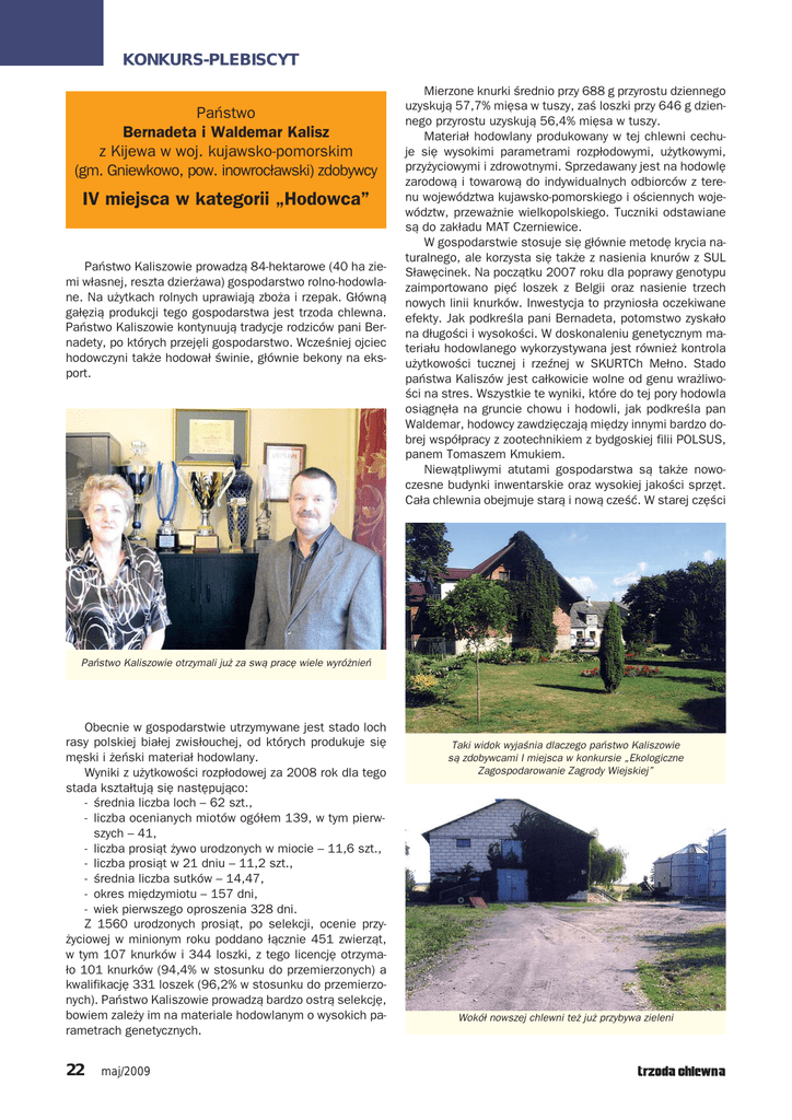 KONKURS-PLEBISCYT Państwo Bernadeta i Waldemar Kalisz z Kijewa w woj. kujawsko-pomorskim (gm. Gniewkowo, pow. inowrocławski) zdobywcy IV miejsca w kategorii „Hodowca” Państwo Kaliszowie prowadzą 84-hektarowe (40 ha ziemi własnej, reszta dzierżawa) gospodarstwo rolno-hodowlane. Na użytkach rolnych uprawiają zboża i rzepak. Główną gałęzią produkcji tego gospodarstwa jest trzoda chlewna. Państwo Kaliszowie kontynuują tradycje rodziców pani Bernadety, po których przejęli gospodarstwo. Wcześniej ojciec hodowczyni także hodował świnie, głównie bekony na eksport. Mierzone knurki średnio przy 688 g przyrostu dziennego uzyskują 57,7% mięsa w tuszy, zaś loszki przy 646 g dziennego przyrostu uzyskują 56,4% mięsa w tuszy. Materiał hodowlany produkowany w tej chlewni cechuje się wysokimi parametrami rozpłodowymi, użytkowymi, przyżyciowymi i zdrowotnymi. Sprzedawany jest na hodowlę zarodową i towarową do indywidualnych odbiorców z terenu województwa kujawsko-pomorskiego i ościennych województw, przeważnie wielkopolskiego. Tuczniki odstawiane są do zakładu MAT Czerniewice. W gospodarstwie stosuje się głównie metodę krycia naturalnego, ale korzysta się także z nasienia knurów z SUL Sławęcinek. Na początku 2007 roku dla poprawy genotypu zaimportowano pięć loszek z Belgii oraz nasienie trzech nowych linii knurków. Inwestycja to przyniosła oczekiwane efekty. Jak podkreśla pani Bernadeta, potomstwo zyskało na długości i wysokości. W doskonaleniu genetycznym materiału hodowlanego wykorzystywana jest również kontrola użytkowości tucznej i rzeźnej w SKURTCh Mełno. Stado państwa Kaliszów jest całkowicie wolne od genu wrażliwości na stres. Wszystkie te wyniki, które do tej pory hodowla osiągnęła na gruncie chowu i hodowli, jak podkreśla pan Waldemar, hodowcy zawdzięczają między innymi bardzo dobrej współpracy z zootechnikiem z bydgoskiej filii POLSUS, panem Tomaszem Kmukiem. Niewątpliwymi atutami gospodarstwa są także nowoczesne budynki inwentarskie oraz wysokiej jakości sprzęt. Cała chlewnia obejmuje starą i nową cześć. W starej części Państwo Kaliszowie otrzymali już za swą pracę wiele wyróżnień Obecnie w gospodarstwie utrzymywane jest stado loch rasy polskiej białej zwisłouchej, od których produkuje się męski i żeński materiał hodowlany. Wyniki z użytkowości rozpłodowej za 2008 rok dla tego stada kształtują się następująco: - średnia liczba loch – 62 szt., - liczba ocenianych miotów ogółem 139, w tym pierwszych – 41, - liczba prosiąt żywo urodzonych w miocie – 11,6 szt., - liczba prosiąt w 21 dniu – 11,2 szt., - średnia liczba sutków – 14,47, - okres międzymiotu – 157 dni, - wiek pierwszego oproszenia 328 dni. Z 1560 urodzonych prosiąt, po selekcji, ocenie przyżyciowej w minionym roku poddano łącznie 451 zwierząt, w tym 107 knurków i 344 loszki, z tego licencję otrzymało 101 knurków (94,4% w stosunku do przemierzonych) a kwalifikację 331 loszek (96,2% w stosunku do przemierzonych). Państwo Kaliszowie prowadzą bardzo ostrą selekcję, bowiem zależy im na materiale hodowlanym o wysokich parametrach genetycznych. 22 maj/2009 Taki widok wyjaśnia dlaczego państwo Kaliszowie są zdobywcami I miejsca w konkursie „Ekologiczne Zagospodarowanie Zagrody Wiejskiej” Wokół nowszej chlewni też już przybywa zieleni KONKURS-PLEBISCYT Budynek mieszkalny i tablica informująca o profilu gospodarstwa Materiał hodowlany odchowywany jest na ściółce mieści się porodówka a w nowej znajduje się kolejna porodówka, dwie odchowalnie i tuczarnia na 200 szt. W najbliższym czasie hodowcy będą modernizować starą porodówkę, aby uzyskać więcej stanowisk porodowych. Osobne pomieszczenie połączone z budynkami chlewni to mieszalnia pasz. Hodowcy sami przygotowują paszę dla świń na bazie koncentratów. Cała chlewnia wyposażona jest w paszociągi i wyciągi do obornika. Obornik składowany jest na 300-metrowej płycie gnojowej, a gnojowica w zbiorniku na 100 m3. Budowa płyty i zbiornika zrealizowana została w 2004 roku bez wykorzystania funduszy unijnych przeznaczonych na ten cel. Sprzęt do upraw polowych to głównie ciągniki, kombajn zbożowy, opryskiwacz nowej generacji i niezbędny sprzęt uprawowo-siewny. W najbliższych planach jest zakup ciągnika z ładowaczem do obornika przy wykorzystaniu środków unijnych z PROW. Gospodarstwo może poszczycić się znaczącymi osiągnięciami, co widać po licznie zgromadzonych pucharach, statuetkach, dyplomach itp. Od wielu już lat zwierzęta państwa Kaliszów zobaczyć można podczas regionalnych wystaw hodowlanych a od dwóch lat także na wystawie krajowej. Analizując wystawy tylko z ubiegłego roku, warto wspomnieć, że na wystawie w Minikowie knurek z tej hodowli otrzymał tytuł czempiona a na Wystawie Krajowej w Poznaniu dwie loszki otrzymały tytuł wiceczempiona. Wielkim sukcesem i wyróżnieniem dla hodowców było zdobycie w 2008 roku pierwszego miejsca w Konkursie „Rolnik Pomorza i Kujaw 2007” w kategorii produkcja zwierzęca. Wcześniej w tym samym konkursie hodowcy otrzymali wyróżnienie. Gospodarstwo jest także zdobywcą I miejsca w konkursie „Ekologiczne Zagospodarowanie Zagrody Wiejskiej”. Pan Waldemar znany jest również z działalności społecznej na rzecz swojego środowiska. Warto tu wspomnieć o jego pracach na rzecz telefonizacji wsi, w której mieszka i pobliskich oraz o działalności na rzecz utrzymania szkoły podstawowej w Kijewie. Był również członkiem rady sołeckiej a od lat związany jest z Pomorsko – Kujawskim Związkiem Hodowców trzody Chlewnej w Bydgoszczy. Za wkład pracy na rzecz tego Związku został odznaczony Brązowym Krzyżem Zasługi. Państwo Kaliszowie mają trzech synów, którzy wspólnie z rodzicami, w miarę wolnego czasu i możliwości, pomagają w gospodarstwie. Najstarszy syn, absolwent poznańskiej uczelni rolniczej (jeden semes