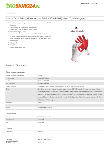 Izabelin 2017-03-08 Karta produktu: Heavy Duty Safety Gloves econ. Brick (HS-04-007), size 10, white-green Seamless heavy duty gloves, meet the requirements of EN420 standard; Cotton-polyester lining, latex impregnated; Coated with a film of latex in the grip part; Flexible ribbing at wrist; Mechanical resistance according to EN388: 3232 standard; To work: in construction (in particular, paving stones, concrete), heavy industry, with abrasive materials, in dry and moist environment; Category: II Size: 10 Colour: white and green Cena 4,49 PLN brutto Basic product parameters Numer produktu w systemie 18418 Nr dostawcy V0106001999100 Nr Celcen 2346-00124-123 Kod kreskowy 8591806154629 Nazwa produktu Heavy Duty Safety Gloves econ. Brick (HS-04-007), size 10, white-green Opis Seamless heavy duty gloves, meet the requirements of EN420 standard;; cotton-polyester lining, latex impregnated;; coated with a film of latex in the grip part;; flexible ribbing at wrist;; mechanical resistance according to EN388: 3232 standard;; to work: in construction (in particular, paving stones, concrete), heavy industry, with abrasive materials, in dry and moist environment;; Category: II; size: 10; colour: white and green Kategoria Gloves Brand FRIDRICH&FRIDRICH Certifications Certifications EN420, EN388:3232 New product Standard Hit Standard Feature Offer from 2013-08 Eko biuro ul Krasińskiego 23a 05-080 Izabelin NIP: 527-000-75-75 22 864 54 84 Izabelin 2017-03-08 Karta katalogowa produktu cd. Heavy Duty Safety Gloves econ. Brick (HS-04-007), size 10, white-green Material Polyester/cotton/latex Type Heavy duty Product Gloves Kind Economy Colour Colour White/red Procurement vocabulary CPV 18141000-9 Dimensions Size 10 Serdecznie zapraszamy do współpracy Eko biuro zespół. Eko biuro ul Krasińskiego 23a 05-080 Izabelin NIP: 527-000-75-75 22 864 54 84