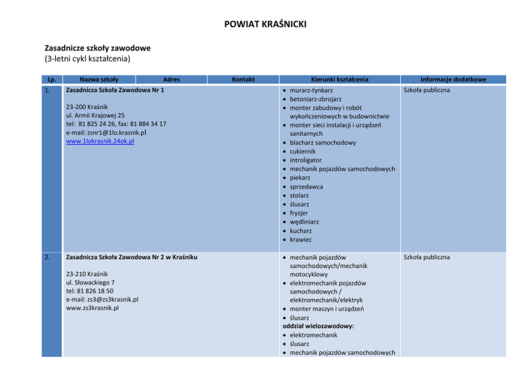 POWIAT KRAŚNICKI Zasadnicze szkoły zawodowe (3-letni cykl kształcenia) Lp. 1. Nazwa szkoły Adres Zasadnicza Szkoła Zawodowa Nr 1 23-200 Kraśnik ul. Armii Krajowej 25 tel: 81 825 24 26, fax: 81 884 34 17 e-mail: [email protected] www.1lokrasnik.24ok.pl 2. Zasadnicza Szkoła Zawodowa Nr 2 w Kraśniku 23-210 Kraśnik ul. Słowackiego 7 tel: 81 826 18 50 e-mail: [email protected] www.zs3krasnik.pl Kontakt Kierunki kształcenia murarz-tynkarz betoniarz-zbrojarz monter zabudowy i robót wykończeniowych w budownictwie monter sieci instalacji i urządzeń sanitarnych blacharz samochodowy cukiernik introligator mechanik pojazdów samochodowych piekarz sprzedawca stolarz ślusarz fryzjer wędliniarz kucharz krawiec mechanik pojazdów samochodowych/mechanik motocyklowy elektromechanik pojazdów samochodowych / elektromechanik/elektryk monter maszyn i urządzeń ślusarz oddział wielozawodowy: elektromechanik ślusarz mechanik pojazdów samochodowych Informacje dodatkowe Szkoła publiczna Szkoła publiczna 3. Zasadnicza Szkoła Wielozawodowa Zakładu Doskonalenia Zawodowego w Lublinie Filia w Kraśniku 23-200 Kraśnik ul. Lubelska 116 tel. 81 825 24 75 e-mail:[email protected] www.szkoly-zdz-krasnik.strefa.pl mechanik monter maszyn i urządzeń blacharz betoniarz-zbrojarz kucharz lakiernik sprzedawca mechanik maszyn i urządzeń drogowych blacharz samochodowy cukiernik elektromechanik pojazdów samochodowych elektryk fryzjer krawiec monter izolacji budowlanych monter konstrukcji budowlanych murarz-tynkarz operator obrabiarek skrawających piekarz wędliniarz kamieniarz stolarz monter sieci instalacji i urządzeń sanitarnych kucharz fryzjer cukiernik monter sieci, instalacji i urządzeń sanitarnych ślusarz elektromechanik elektromechanik pojazdów samochodowych krawiec blacharz samochodowy mechanik pojazdów samochodowych Szkoła niepubliczna z uprawnieniami szkoły publicznej 4. Zasadnicza Szkoła Zawodowa w Annopolu 23-235 Annopol ul. Kościuszki 22 tel: (15) 861 35 82 e-mail: [email protected] www.zs-annopol.cba.pl 5. Zasadnicza Szkoła Zawodowa w Urzędowie cukiernik krawiec kucharz elektryk elektromechanik pojazdów samochodowych ślusarz fryzjer piekarz stolarz sprzedawca rolnik murarz-tynkarz kamieniarz betoniarz-zbrojarz mechanik pojazdów samochodowych blacharz samochodowy monter sieci, instalacji i urządzeń sanitarnych monter zabudowy i robót wykończeniowych w budownictwie operator obrabiarek skrawających mechanik-monter maszyn i urządzeń mechanik automatyki przemysłowej i urządzeń precyzyjnych operator maszyn i urządzeń przemysłu spożywczego Szkoła publiczna sprzedawca Szkoła publiczna cukiernik fryzjer kucharz Szkoła publiczna 23-250 Urzędów ul. Wodna 34 tel: 81 822 52 53, fax: 81 822 52 53 e-mail: [email protected] www.zs-urzedow.pl 6. Zasadnicza Szkoła Zawodowa w Wólce Gościeradowskiej 23-275 Wólka Gościeradowska 7. Wólka Gościeradowska 72A tel: 15 838 11 38, fax: 15 838 11 11 e-mail: [email protected] www.wolkaszkola.pl mechanik pojazdów samochodowych murarz tynkarz ogrodnik rolnik stolarz piekarz monter zabudowy i robót wykończeniowych w budownictwie Zasadnicza Szkoła Zawodowa w Zakrzówku murarz –tynkarz betoniarz -zbrojarz dekarz monter sieci, instalacji i urządzeń sanitarnych monter zabudowy i robót wykończeniowych w budownictwie monter konstrukcji budowlanych elektromechanik pojazdów samochodowych blacharz samochodowy lakiernik mechanik pojazdów samochodowych mechanik- operator pojazdów i maszyn rolniczych elektryk fotograf fryzjer kamieniarz kucharz piekarz cukiernik Wędliniarz sprzedawca 23-213 Zakrzówek ul. Wójtowicza 35 tel/fax: 81 821 51 43 e-mail: [email protected] www.zs1zakrzowek.szkolnastrona.pl Szkoła publiczna Technika (4-letni cykl kształcenia) Lp. 1. Nazwa szkoły Technikum nr 1 w Kraśniku Adres Kontakt Kierunki kształcenia technik informatyk Informacje dodatkowe Szkoła publiczna 23-200 Kraśnik ul. Armii Krajowej 25 tel: 81 825 24 26, fax: 81 884 34 17 e-mail: [email protected] www.1lokrasnik.24ok.pl 2. Technikum nr 2 w Kraśniku technik ekonomista - specjalność: finanse i rachunkowość Szkoła publiczna technik elektryk / technik energetyk technik pojazdów samochodowych technik informatyk / technik teleinformatyk technik mechanik technik hotelarstwa technik urządzeń i systemów energetyki odnawialnej / technik ochrony środowiska technik bhp / technik logistyk technik rachunkowości / technik ekonomista Szkoła publiczna technik żywienia i usług Szkoła niepubliczna z uprawnieniami szkoły publicznej Organ prowadzący - Zakład Doskonalenia Zawodowego w Lublinie Filia w Kraśniku 23-210 Kraśnik ul. Gen. Wł. Sikorskiego 25 tel/fax: 81 825 69 86 e-mail: [email protected] www.rey.edu.pl 3. Technikum nr 3 w Kraśniku 23-210 Kraśnik ul. Słowackiego 7 tel/fax: 81 825 59 68, tel: 81 826 18 50 e-mail: [email protected] www.zs3krasnik.pl 4. Technikum Zakładu Doskonalenia Zawodowego w Lublinie Filia w Kraśniku 23-200 Kraśnik ul. Lubelska 116 tel/fax: 81 825 26 40 gastronomicznych technik usług fryzjerskich z elementami kosmetyki - innowacja pedagogiczna technik ekonomista 5. e-mail: [email protected] www.szkoly-zdz-krasnik.strefa.pl technik handlowiec kelner Technikum w Annopolu technik ekonomista, technik informatyk, technik budownictwa, technik technologii żywności technik logistyki technik organizacji reklamy Szkoła publiczna technik handlowiec-menadżer biznesu technik informatyk-grafika i reklama fototechnik technik organizacji reklamy technik urządzeń i energetyki odnawialnej technik budownictwa technik obsługi turystycznej technik ekonomista technik urządzeń sanitarnych technik księgarstwa technik spedytor technik logistyk technik rolnik technik rolnik technik hodowca koni technik żywienia i usług gastronomicznych technik informatyk technik mechanizacji rolnictwa technik turystyki wiejskiej technik architektury krajobrazu technik geodeta z innowacją – geoinformatyka technik budownic