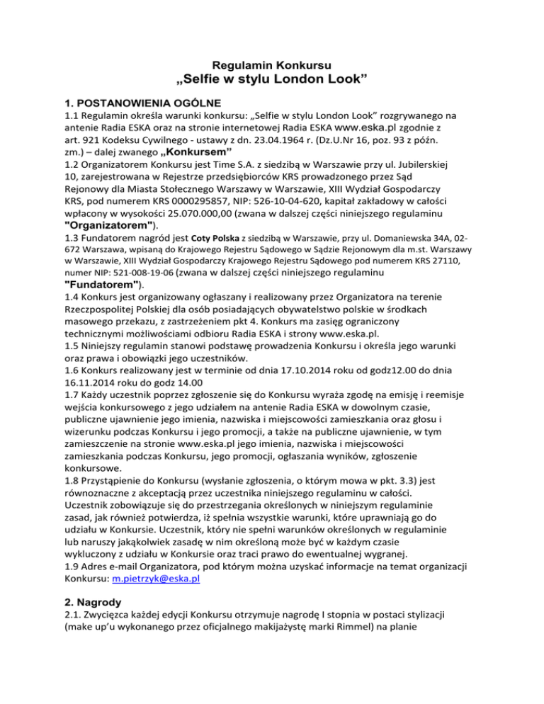 Regulamin Konkursu „Selfie w stylu London Look” 1. POSTANOWIENIA OGÓLNE 1.1 Regulamin określa warunki konkursu: „Selfie w stylu London Look” rozgrywanego na antenie Radia ESKA oraz na stronie internetowej Radia ESKA www.eska.pl zgodnie z art. 921 Kodeksu Cywilnego - ustawy z dn. 23.04.1964 r. (Dz.U.Nr 16, poz. 93 z późn. zm.) – dalej zwanego „Konkursem” 1.2 Organizatorem Konkursu jest Time S.A. z siedzibą w Warszawie przy ul. Jubilerskiej 10, zarejestrowana w Rejestrze przedsiębiorców KRS prowadzonego przez Sąd Rejonowy dla Miasta Stołecznego Warszawy w Warszawie, XIII Wydział Gospodarczy KRS, pod numerem KRS 0000295857, NIP: 526-10-04-620, kapitał zakładowy w całości wpłacony w wysokości 25.070.000,00 (zwana w dalszej części niniejszego regulaminu "Organizatorem"). 1.3 Fundatorem nagród jest Coty Polska z siedzibą w Warszawie, przy ul. Domaniewska 34A, 02672 Warszawa, wpisaną do Krajowego Rejestru Sądowego w Sądzie Rejonowym dla m.st. Warszawy w Warszawie, XIII Wydział Gospodarczy Krajowego Rejestru Sądowego pod numerem KRS 27110, numer NIP: 521-008-19-06 (zwana w dalszej części niniejszego regulaminu "Fundatorem"). 1.4 Konkurs jest organizowany ogłaszany i realizowany przez Organizatora na terenie Rzeczpospolitej Polskiej dla osób posiadających obywatelstwo polskie w środkach masowego przekazu, z zastrzeżeniem pkt 4. Konkurs ma zasięg ograniczony technicznymi możliwościami odbioru Radia ESKA i strony www.eska.pl. 1.5 Niniejszy regulamin stanowi podstawę prowadzenia Konkursu i określa jego warunki oraz prawa i obowiązki jego uczestników. 1.6 Konkurs realizowany jest w terminie od dnia 17.10.2014 roku od godz12.00 do dnia 16.11.2014 roku do godz 14.00 1.7 Każdy uczestnik poprzez zgłoszenie się do Konkursu wyraża zgodę na emisję i reemisje wejścia konkursowego z jego udziałem na antenie Radia ESKA w dowolnym czasie, publiczne ujawnienie jego imienia, nazwiska i miejscowości zamieszkania oraz głosu i wizerunku podczas Konkursu i jego promocji, a także na publiczne ujawnienie, w tym zamieszczenie na stronie www.eska.pl jego imienia, nazwiska i miejscowości zamieszkania podczas Konkursu, jego promocji, ogłaszania wyników, zgłoszenie konkursowe. 1.8 Przystąpienie do Konkursu (wysłanie zgłoszenia, o którym mowa w pkt. 3.3) jest równoznaczne z akceptacją przez uczestnika niniejszego regulaminu w całości. Uczestnik zobowiązuje się do przestrzegania określonych w niniejszym regulaminie zasad, jak również potwierdza, iż spełnia wszystkie warunki, które uprawniają go do udziału w Konkursie. Uczestnik, który nie spełni warunków określonych w regulaminie lub naruszy jakąkolwiek zasadę w nim określoną może być w każdym czasie wykluczony z udziału w Konkursie oraz traci prawo do ewentualnej wygranej. 1.9 Adres e-mail Organizatora, pod którym można uzyskać informacje na temat organizacji Konkursu: [email protected] 2. Nagrody 2.1. Zwycięzca każdej edycji Konkursu otrzymuje nagrodę I stopnia w postaci stylizacji (make up’u wykonanego przez oficjalnego makijażystę marki Rimmel) na planie programu ESKA TV – Przeglądarka o wartości 600 zł (sześćset złotych) oraz zestawu kosmetyków o wartości 102,45 zł (sto dwa złote czterdzieści pięć złotych) (zestaw zawiera maskarę, cień, eyeliner, lakier do paznokci oraz szminkę).Łączna wartość nagrody wynosi 702,45 (siedemset dwa złote czterdzieści pięć groszy) Warunkiem realizacji niniejszej nagrody przez Zwycięzcę Konkursu jest wyrażenie przez niego zgody na udział w programie telewizyjnym oraz wykorzystanie jego wizerunku podczas emisji programu w telewizji. 2.2 Nagranie programu , o którym mowa w pkt. 2.1. odbędzie się w listopadzie – o dokładnej dacie nagrania Zwycięzca zostanie poinformowanyna 5 dni przed nagraniem. 2.3 W trakcie wejść finałowych w każdej edycji, zostaną rozdane dwie nagrody II stopnia w postaci zestawu kosmetyków Rimmel o wartości 102,45 PLN (sto dwa złote czterdzieści pięć złotych) brutto (zestaw zawiera maskarę, cień, eyeliner, lakier do paznokci i szminkę) – przyznanie każdej takiej nagrody oraz ich liczba i uczestnicy, którym będzie ona przyznana zależy od decyzji komisji konkursowej. Na zasady rozdania ewentualnych nagród II stopnia każdy z uczestników przystępując do Konkursu, wyraża zgodę. 2.2 Organizator oświadcza, iż wszystkie nagrody zostaną wydane zgodnie z obowiązującymi przepisami prawa podatkowego. 2.3 Organizator nie ponosi odpowiedzialności za niemożność odbioru lub nieodebranie którejkolwiek nagrody, z jakiejkolwiek przyczyny leżącej po stronie nagrodzonego uczestnika. 2.4 Organizator nie ponosi odpowiedzialności za zmianę miejsca zamieszkania i/lub podanego przez uczestnika Konkursu adresu lub zmianę innych danych – uniemożliwiającą kontakt z tym uczestnikiem lub odebranie przez niego zestawu nagród/nagrody. 2.5 Zwycięzcy zostaną poinformowani o wygranej drogą mailową najpóźniej na 30 dni po zakończeniu każdej edycji. 2.6 Nagrody nie odebrane przez zwycięzcę Konkursu w terminie 30 dni od rozstrzygnięcia Konkursu pozostają własnością Fundatora. 2.7 Przy odbiorze przez Zwycięzcę edycji Konkursu nagrody zobowiązany jest on okazać dokument potwierdzający jego tożsamość lub w przypadku odbioru tej nagrody przez pełnomocnika zwycięzcy zobowiązany jest on okazać pisemne upoważnienie od zwycięzcy, który wygrał daną nagrodę, zawierające następujące informacje: imię nazwisko, adres, numer i seria dowodu osobistego, telefon kontaktowy tego zwycięzcy oraz adnotację o upoważnieniu określonej osoby do odbioru w jego imieniu danej nagrody, jak również podpis tego zwycięzcy wraz z danymi osoby odbierającej czyli imieniem, nazwiskiem, serią i numerem dowodu osobistego oraz telefonem odbiorcy. W przypadku niespełnienia przez osobę podającą się za pełnomocnika zwycięzcy powyższych warunków nagroda nie b