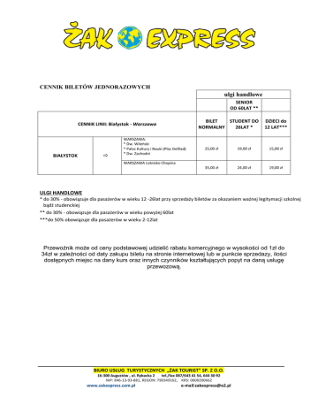 CENNIK BILETÓW JEDNORAZOWYCH ulgi handlowe SENIOR OD 60LAT ** BILET STUDENT DO NORMALNY 26LAT * CENNIK LINII: Białystok - Warszawa BIAŁYSTOK WARSZAWA: * Dw. Wileński * Pałac Kultury i Nauki (Plac Defilad) * Dw. Zachodni DZIECI do 12 LAT*** 25,00 zł 19,00 zł 15,00 zł 35,00 zł 24,00 zł 19,00 zł WARSZAWA Lotnisko Chopina ULGI HANDLOWE * do 30% - obowiązuje dla pasażerów w wieku 12 -26lat przy sprzedaży biletów za okazaniem ważnej legitymacji szkolnej bądź studenckiej ** do 30% - obowiązuje dla pasażerów w wieku powyżej 60lat ***do 50% obowiązuje dla pasażerów w wieku 2-12lat Przewoźnik może od ceny podstawowej udzielić rabatu komercyjnego w wysokości od 1zł do 34zł w zależności od daty zakupu biletu na stronie internetowej lub w punkcie sprzedazy, ilości dostępnych miejsc na dany kurs oraz innych czynników kształtujących popyt na daną usługę przewozową. BIURO USŁUG TURYSTYCZNYCH „ŻAK TOURIST” SP. Z O.O. 16-300 Augustów , ul. Rybacka 2 tel./fax 087/643 41 54, 644 30 92 NIP: 846-13-93-881, REGON: 790349162, KRS: 0000200662 www.zakexpress.com.pl e-mail:[email protected]