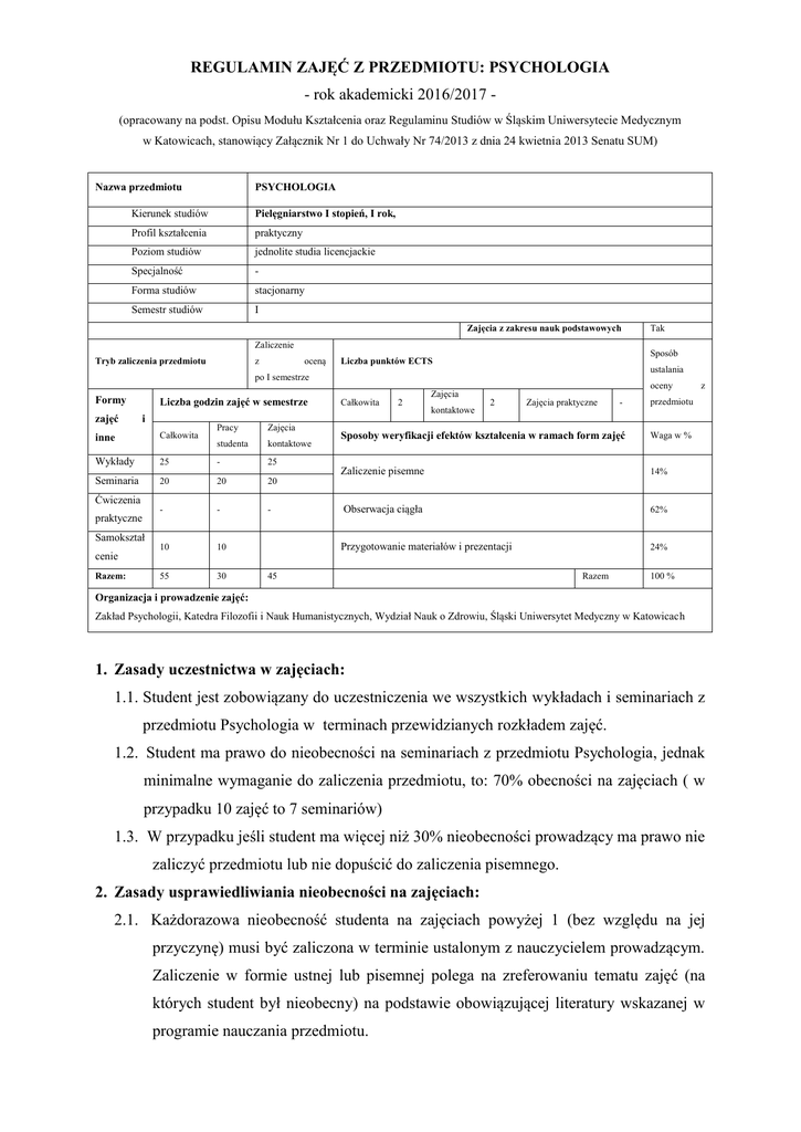 REGULAMIN ZAJĘĆ Z PRZEDMIOTU: PSYCHOLOGIA - rok akademicki 2016/2017 (opracowany na podst. Opisu Modułu Kształcenia oraz Regulaminu Studiów w Śląskim Uniwersytecie Medycznym w Katowicach, stanowiący Załącznik Nr 1 do Uchwały Nr 74/2013 z dnia 24 kwietnia 2013 Senatu SUM) Nazwa przedmiotu PSYCHOLOGIA Kierunek studiów Pielęgniarstwo I stopień, I rok, Profil kształcenia praktyczny Poziom studiów jednolite studia licencjackie Specjalność - Forma studiów stacjonarny Semestr studiów I Zajęcia z zakresu nauk podstawowych Zaliczenie z Tryb zaliczenia przedmiotu oceną Sposób Liczba punktów ECTS ustalania po I semestrze Liczba godzin zajęć w semestrze Formy zajęć i Pracy Zajęcia studenta kontaktowe 25 - 25 20 20 20 - - - 10 10 55 30 inne Całkowita Wykłady Seminaria Ćwiczenia praktyczne Samokształ cenie Razem: Całkowita Zajęcia Tak oceny Zajęcia praktyczne - przedmiotu Sposoby weryfikacji efektów kształcenia w ramach form zajęć Waga w % Zaliczenie pisemne 14% Obserwacja ciągła 62% Przygotowanie materiałów i prezentacji 24% 2 kontaktowe 2 45 Razem z 100 % Organizacja i prowadzenie zajęć: Zakład Psychologii, Katedra Filozofii i Nauk Humanistycznych, Wydział Nauk o Zdrowiu, Śląski Uniwersytet Medyczny w Katowicach 1. Zasady uczestnictwa w zajęciach: 1.1. Student jest zobowiązany do uczestniczenia we wszystkich wykładach i seminariach z przedmiotu Psychologia w terminach przewidzianych rozkładem zajęć. 1.2. Student ma prawo do nieobecności na seminariach z przedmiotu Psychologia, jednak minimalne wymaganie do zaliczenia przedmiotu, to: 70% obecności na zajęciach ( w przypadku 10 zajęć to 7 seminariów) 1.3. W przypadku jeśli student ma więcej niż 30% nieobecności prowadzący ma prawo nie zaliczyć przedmiotu lub nie dopuścić do zaliczenia pisemnego. 2. Zasady usprawiedliwiania nieobecności na zajęciach: 2.1. Każdorazowa nieobecność studenta na zajęciach powyżej 1 (bez względu na jej przyczynę) musi być zaliczona w terminie ustalonym z nauczycielem prowadzącym. Zaliczenie w formie ustnej lub pisemnej polega na zreferowaniu tematu zajęć (na których student był nieobecny) na podstawie obowiązującej literatury wskazanej w programie nauczania przedmiotu. 2.2. W przypadku, gdy student ma powyżej 30% nieobecności, jest on zobowiązany do zaliczenia nieobecności w terminie wyznaczonym zgodnie z planem zajęć i uzgodnionym z prowadzącym zajęcia dydaktyczne, nie później niż do końca zimowej sesji egzaminacyjnej (którą kończy się nauczanie przedmiotu: Psychologia). Za zgodą Dziekana student może przystąpić w terminie późniejszym do zaliczenia nieobecności z przedmiotu nie później, niż do czasu zakończenia zajęć dydaktycznych semestru letniego danego roku akademickiego. 3. Zasady, tryb, forma i terminarz zaliczania 3.1. Student jest zobowiązany do zaliczenia zajęć dydaktycznych w terminie wyznaczonym zgodnie z planem zajęć i uzgodnionym z prowadzącym zajęcia dydaktyczne, nie później niż do końca zimowej sesji egzaminacyjnej (którą kończy się nauczanie przedmiotu: Psychologia). Za zgodą Dziekana student może przystąpić w terminie późniejszym do zaliczenia z przedmiotu nie później, niż do czasu zakończenia zajęć dydaktycznych semestru letniego danego roku akademickiego. 3.2. Zaliczenie pisemne w formie otwartych pytań ustrukturyzowanych obejmuje treści programowe przedmiotu w zakresie seminarium. Program zajęć jest omawiany i udostępniany studentom w trakcie pierwszych zajęć oraz jest stale dostępny na stronie internetowej Zakładu Psychologii SUM oraz w jego siedzibie. 3.3. O terminie zaliczenia pisemnego decyduje prowadzący zajęcia uwzględniając harmonogram zajęć z przedmiotu i szczegółową organizację studiów w danym roku akademickim. 3.4. Studenci są informowani o terminie zaliczenia pisemnego z 4 tygodniowym wyprzedzeniem. 4. Możliwość wglądu do prac pisemnych studenta 4.1. Student ma prawo wglądu do swojej ocenionej pracy zaliczeniowej wraz z przyznaną punktacją, w terminie 14 dni od ogłoszenia wyników zaliczenia. 5. Zasada ustalania oceny przedmiotu 5.1. Student w trakcie trwania przedmiotu Psychologia może uzyskać 20 punktów, w tym za:  prezentację na seminariach - max 8 pkt  zaliczenie pisemne z treści seminariów (na przedostatnim seminarium) - max 8 pkt  odpowiedź pisemną na zagadnienie z treści aktualnego wykładu (na końcu każdego wykładu - od 2-go) – max 4 pkt (za każdy wykład 1 pkt.) 5.2. Sumuje się punkty za: zaliczenia pisemne i prezentację, . Przelicza się sumę punktów na ocenę: 18 - 20 pkt 5,0 17 pkt 4,5 15 - 16 pkt 4,0 14 pkt 3,5 11 - 13 pkt 3,0 0 - 10 pkt 2,0 5.3. Minimalne wymaganie do zaliczenia przedmiotu, to: zaliczenia pisemne, zaliczenie prezentacji i 70% obecności na zajęciach 5.4. Brak zaliczenia pisemnego z treści seminaryjnych na co najmniej 60% pkt lub brak zaliczenia z treści wykładowych na min. 50%, wiąże się z koniecznością pisemnego zaliczenia poprawkowego w terminie wyznaczonym przez osobę prowadzącą. 5.5. Kryteria oceny prezentacji projektu są następujące: korzystanie z literatury podstawowej oraz dodatkowej do przedmiotu, podanej w sylabusie oraz sporządzenie bibliografii do prezentacji (1pkt) zgodność merytoryczna z tematem prezentacji (1 pkt.) aktywizowanie grupy – zadawanie pytań, bycie w kontakcie z grupą (1 pkt.) przygotowanie notatki z treści zawartych w prezentacji oraz wyjaśnienie w notatce najistotniejszych pojęć zawartych w prezentacji (1 pkt.) przygotowanie prezentacji multimedialnej lub innej – plakat, scenki, ulotki (0,5 pkt.) przygotowanie ciekawostki psychologicznej/naukowej (1 pkt.) przygotowanie ćwiczenia do prezentacji ( 1 pkt.) rozumienie prezentowanych treści, poprzez wyjaśnianie pojęć, podawanie przykładów itp.(więcej mówi, niż czyta) (0,5 pkt.) oraz zadbanie o sposób prezentacji – stoi, siedzi, chodzi, jest aktywny (0,5 pkt.) (za o