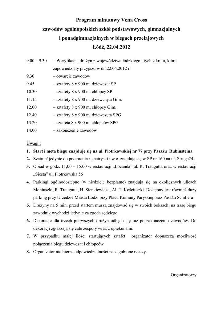 Program minutowy Vena Cross zawodów ogólnopolskich szkół podstawowych, gimnazjalnych i ponadgimnazjalnych w biegach przełajowych Łódź, 22.04.2012 9.00 – 9.30 – Weryfikacja drużyn z województwa łódzkiego i tych z kraju, które zapowiedziały przyjazd w dn.22.04.2012 r. 9.30 – otwarcie zawodów 9.45 – sztafety 8 x 900 m. dziewcząt SP 10.30 – sztafety 8 x 900 m. chłopcy SP 11.15 – sztafety 8 x 900 m. dziewczęta Gim. 12.00 – sztafety 8 x 900 m. chłopcy Gim. 12.40 – sztafety 8 x 900 m. dziewczęta SPG 13.20 – sztafeta 8 x 900 m. chłopców SPG 14.00 – zakończenie zawodów Uwagi : 1. Start i meta biegu znajduje się na ul. Piotrkowskiej nr 77 przy Pasażu Rubinsteina 2. Szatnie/ jedynie do przebrania / , natryski i w.c. znajdują się w SP nr 160 na ul. Struga24 3. Obiad w godz. 11,00 – 15.00 w restauracji „Locanda” ul. R. Traugutta oraz w restauracji „Siesta” ul. Piotrkowska 56 4. Parkingi ogólnodostępne (w niedzielę bezpłatne) znajdują się na okolicznych ulicach Moniuszki, R. Traugutta, H. Sienkiewicza, Al. T. Kościuszki. Dostępny jest również duży parking przy Urzędzie Miasta Łodzi przy Placu Komuny Paryskiej oraz Pasażu Schillera 5. Drużyny na 5 min. przed startem muszą znajdować się w swoich boksach, na trasę biegu zawodnik wychodzi jedynie za zgodą sędziego. 6. Dekoracje dla trzech pierwszych drużyn odbędą się tuż po zakończeniu zawodów. Do dekoracji zgłaszają się całe zespoły wraz z opiekunami. 7. W przypadku małej ilości startujących sztafet organizator dopuszcza możliwość połączenia biegu dziewcząt i chłopców 8. Organizator nie bierze odpowiedzialności za zagubione rzeczy. Organizatorzy