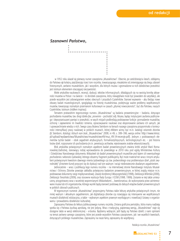 od redakcji Szanowni Państwo, w 1952 roku ukazał się pierwszy numer czasopisma „Muzealnictwo”. Obecnie, po sześćdziesięciu latach, oddajemy do Państwa rąk kolejny, pięćdziesiąty trzeci tom rocznika, towarzyszącego, niezależnie od zmieniającego się biegu zdarzeń historycznych, zarówno muzealnikom, jak i wszystkim, dla których muzea i zgromadzone w nich dziedzictwo przeszłości jest istotnym elementem otaczającej rzeczywistości. Wiele artykułów naukowych, recenzji, dyskusji, tekstów informacyjnych, składających się na swoistą kronikę aktywności muzeów w Polsce i na świecie – to dorobek czasopisma, który niewątpliwie może być powodem do satysfakcji, ale przede wszystkim jest zobowiązaniem wobec obecnych i przyszłych Czytelników. Stanowi wyzwanie – aby śledząc nowe obszary badań muzeologicznych, spoglądając na historię muzealnictwa, podejmując ważne problemy współczesnych muzeów, towarzysząc rozmaitym przemianom kulturowym w czasach „płynnej nowoczesności”, być dla Państwa, naszych Czytelników, istotnym źródłem inspiracji. Tematem przewodnim tegorocznego numeru „Muzealnictwa” są badania proweniencyjne – badania, dotyczące pochodzenia muzealiów, tzw. drogi dzieła (łac. provenire – pochodzić od). Muzea, będąc instytucjami zaufania publicznego i depozytariuszami pamięci o przeszłości, w swych misjach podkreślają podstawowe funkcje: gromadzenie muzealiów, ochronę i zapewnienie im trwałości istnienia, opracowywanie naukowe oraz eksponowanie zarówno ich samych, jak i upowszechnianie wiedzy o nich. Swego czasu Bożena Steinborn na łamach naszego czasopisma przypominała o konieczności intensyfikacji pracy naukowej w polskich muzeach, której efektem winny być m.in. katalogi raisonnés zbiorów (B. Steinborn, Katalogi, których nam brak, „Muzealnictwo” 2008, nr 49, s. 389–396, wersja online: http://www.nimoz. pl/upload/wydawnictwa/Muzealnictwo/muzealnictwo49/muz_49-34-recenzje.pdf). Jednym z podstawowych elementów tychże badań – obok zagadnień atrybucyjnych, formalnostylistycznych, technologicznych etc. – jest historia losów dzieł, rozpoznanie ich pochodzenia (m.in. penetracja archiwów, rejestrowanie znaków własnościowych). Blok artykułów poświęconych rozmaitym aspektom badań proweniencyjnych otwiera krótki artykuł Marii Romanowskiej-Zadrożnej, stanowiący rodzaj wprowadzenia do powstałego w 2010 roku pod egidą Ministerstwa Kultury i Dziedzictwa Narodowego dokumentu Wskazówki do badań proweniencyjnych muzealiów pod kątem ich ewentualnego pochodzenia z własności żydowskiej, którego obszerny fragment publikujemy. Być może materiał ten wraz z innymi artykułami poświęconymi kwestiom dawnego mienia żydowskiego czy tzw. podworskiego oraz problematyce dzieł „sztuki zwyrodniałej” (Entartete Kunst) przyczyni się do dyskusji nad tym ważnym i wciąż niedostatecznie zbadanym zagadnieniem. Jednocześnie – wraz z publikacją tego numeru rocznika – na internetowej stronie Narodowego Instytutu Muzealnictwa i Ochrony Zbiorów powstaje zakładka poświęcona badaniom proweniencyjnym, w której znajdą miejsce m.in. podstawowe dokumenty rangi międzynarodowej: Zasady Konferencji Waszyngtońskiej (1998), Deklaracja Wileńska (2000), Deklaracja Terezińska (2009), oraz stosowne rezolucje Rady Europy i ICOM (1998, 1999). Zostanie w niej także umieszczony, przygotowany wraz z wcześniej wspomnianymi Wskazówkami..., kwestionariusz, do wykorzystania przez zainteresowane muzea lub ich organizatorów, którego wyniki będą stanowić podstawę do dalszych etapów badań proweniencyjnych w polskich zbiorach publicznych. W tegorocznym numerze „Muzealnictwa” proponujemy Państwu także lekturę artykułów poświęconych innym, nie mniej ważnym i aktualnym zagadnieniom, jak digitalizacja zbiorów czy rozwijająca się intensywnie we współczesnych muzeach działalność edukacyjna, a także – wybranym aspektom prawnym wynikającym z nowelizacji Ustawy o organizowaniu i prowadzeniu działalności kulturalnej. Zapraszamy Państwa do lektury jubileuszowego numeru rocznika. Zmiana graficzna periodyku, która mamy nadzieję spotka się z Państwa życzliwą aprobatą, nie jest jedyną. Wraz z tradycyjną, papierową wersją, „Muzealnictwo” staje się dostępne także w wersji elektronicznej – e-booka. Będziemy wdzięczni, jeśli będą się Państwo dzielić z nami opiniami na temat zarówno samego czasopisma, które jest przede wszystkim Państwa czasopismem, jak i we wszelkich kwestiach, dotyczących polskiego muzealnictwa. Zapraszamy na nasze łamy, zapraszamy do współpracy. Redakcja rocznika „Muzealnictwo” UZEALNICTWO 53 7 od redakcji Dear Readers, The first issue of “Muzealnictwo” appeared in 1952. Now, sixty years later, we present a successive, 53rd volume of the annual, accompanying, regardless of the changing course of historical events, both museum experts and all those who regard museums and the heritage of the past amassed therein as an essential element of surrounding reality. Numerous scientific articles, reviews, discussions, and information texts comprising a sui generis chronicle of the activity of museums in Poland and the world constitute the accomplishment of our periodical, undoubtedly a source of considerable satisfaction but, predominantly, an obligation towards present-day and future readers. It also poses a challenge - to become an essential source of inspiration for our readers while observing new domains of museological research, embarking upon prominent problems of contemporary museums, and accompanying assorted cultural transformations at a time of ”liquid modernity”. The leitmotiv of this year’s issue of “Muzealnictwo” are provenance studies concerning the origin of museum exhibits, the so-called paths of an artwork (from the Latin: provenire – to originate). Museums, in their capacity as institutions of public