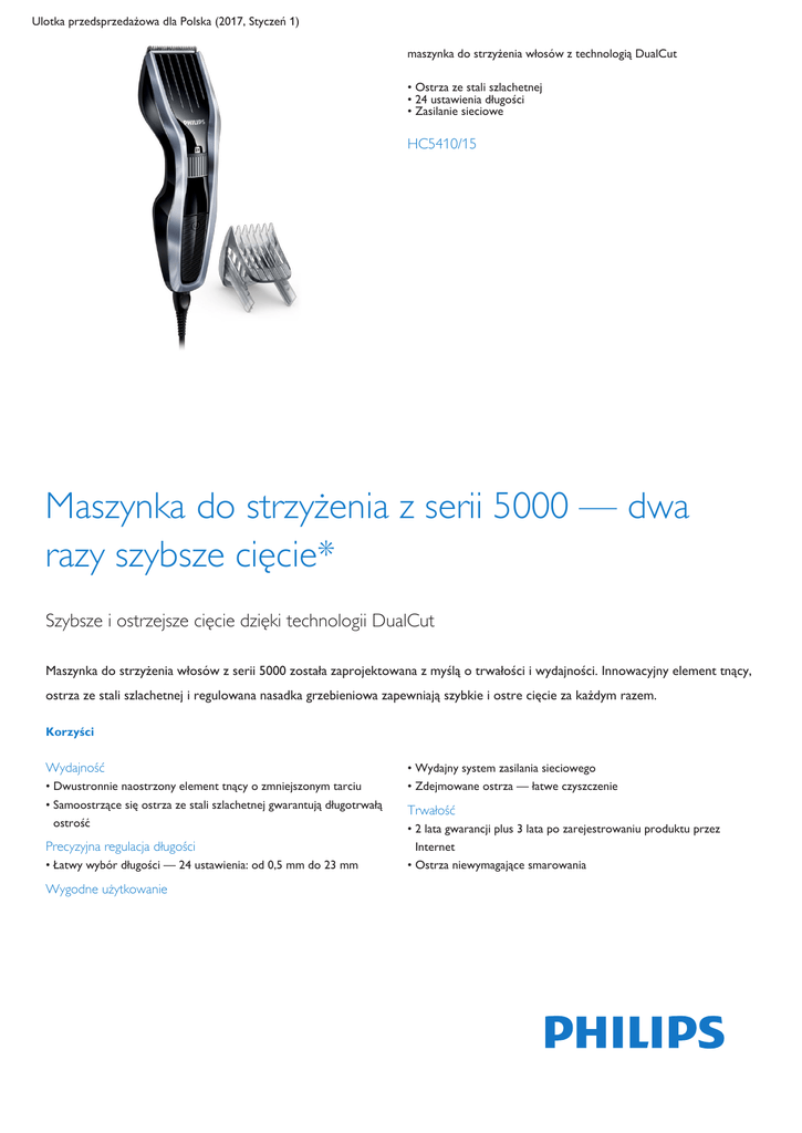 Ulotka przedsprzedażowa dla Polska (2017, Styczeń 1) maszynka do strzyżenia włosów z technologią DualCut • Ostrza ze stali szlachetnej • 24 ustawienia długości • Zasilanie sieciowe HC5410/15 Maszynka do strzyżenia z serii 5000 — dwa razy szybsze cięcie* Szybsze i ostrzejsze cięcie dzięki technologii DualCut Maszynka do strzyżenia włosów z serii 5000 została zaprojektowana z myślą o trwałości i wydajności. Innowacyjny element tnący, ostrza ze stali szlachetnej i regulowana nasadka grzebieniowa zapewniają szybkie i ostre cięcie za każdym razem. Korzyści Wydajność • Dwustronnie naostrzony element tnący o zmniejszonym tarciu • Samoostrzące się ostrza ze stali szlachetnej gwarantują długotrwałą ostrość Precyzyjna regulacja długości • Łatwy wybór długości — 24 ustawienia: od 0,5 mm do 23 mm Wygodne użytkowanie • Wydajny system zasilania sieciowego • Zdejmowane ostrza — łatwe czyszczenie Trwałość • 2 lata gwarancji plus 3 lata po zarejestrowaniu produktu przez Internet • Ostrza niewymagające smarowania Hairclipper series 5000 Cechy Technologia DualCut Łatwe czyszczenie Uporaj się z każdym typem włosów dzięki zaawansowanej technologii DualCut, która stanowi połączenie dwustronnie naostrzonego elementu tnącego i zmniejszonego tarcia. Innowacyjny element tnący został tak skonstruowany, aby obcinać włosy dwa razy szybciej niż zwykłe maszynki do strzyżenia firmy Philips. Ma też solidną obudowę ze stali szlachetnej, która zapewnia większą pewność i trwałość.* Wystarczy kliknąć, aby otworzyć zdejmowaną głowicę i szybko uwolnić, a następnie wyczyścić ostrza. 5-letnia gwarancja ogólnoświatowa Ostrza ze stali szlachetnej Samoostrzące się ostrza ze stali szlachetnej gwarantują długotrwałą ostrość 24 blokowane ustawienia długości Obróć kółko ustawień, aby wybrać i zablokować jedno z 23 ustawień długości — od 1 do 23 mm. Odstęp pomiędzy kolejnymi ustawieniami wynosi dokładnie 1 mm. Można również zdjąć nasadkę i krótko przyciąć włosy na długość 0,5 mm. Wszystkie nasze produkty do toalety męskiej cechują się trwałą konstrukcją. Są objęte ogólnoświatową gwarancją i mają uniwersalny zakres napięć. Wystarczy zarejestrować maszynkę do strzyżenia na stronie www.philips.com/ 5years, aby oprócz standardowej 2-letniej gwarancji firmy Philips otrzymać dodatkowe 3 lata gwarancji, co daje w sumie 5-letnią gwarancję ogólnoświatową. Nie wymaga konserwacji Brak konieczności smarowania — łatwa konserwacja i oszczędność czasu. Wydajna praca przy zasilaniu sieciowym Przewód zasilający zapewnia stałą moc. Specyfikacje Prosimy pamiętać, że jest to ulotka przedsprzedażowa. Treść ulotki jest zgodna z naszą najlepszą wiedzą w momencie publikacji i w odniesieniu do danego kraju (podane powyżej). Treść ulotki może ulec zmianie bez powiadomienia. Firma Philips nie ponosi odpowiedzialności za treść ulotki. System tnący Szerokość nożyka Element tnący Liczba ustawień długości Zakres ustawień długości Precyzja (wielkość odstępów) 41 mm Ostrza ze stali szlachetnej 24 Od 0,5 do 23 mm Co 1 mm Zasilanie Działanie Łatwa obsługa Czyszczenie Nie wymaga konserwacji Ostrza z możliwością mycia w wodzie Nie wymaga konserwacji Serwis 2 lata gwarancji Tak Plus 3 lata po zarejestrowaniu produktu Tylko zasilanie sieciowe Dane wkrótce ulegną zmianie 2017, Styczeń 1 Hairclipper series 5000 Wymiary opakowania Wysokość Szerokość Głębokość Waga netto Waga brutto EAN Liczba produktów w zestawie Kraj pochodzenia Kod towaru według Systemu Zharmonizowanego (HS) 22,40 cm 14,00 cm 7,00 cm 0,26 kg 0,38 kg 08710103653110 1 Karton zewnętrzny Długość Szerokość Wysokość Waga brutto EAN Liczba opakowań konsumenckich ID 851020 29,10 cm 15,10 cm 23,80 cm 1,69 kg 18710103653117 4 * W porównaniu z poprzednim modelem firmy Philips Dane wkrótce ulegną zmianie 2017, Styczeń 1 Version: 11.0.1 EAN: 08710103653110 © 2017 Koninklijke Philips N.V. Wszelkie prawa zastrzeżone Dane mogą ulec zmianie bez uprzedniego powiadomienia. Znak towarowy jest własnością Koninklijke Philips N.V. lub odpowiednich podmiotów . www.philips.com