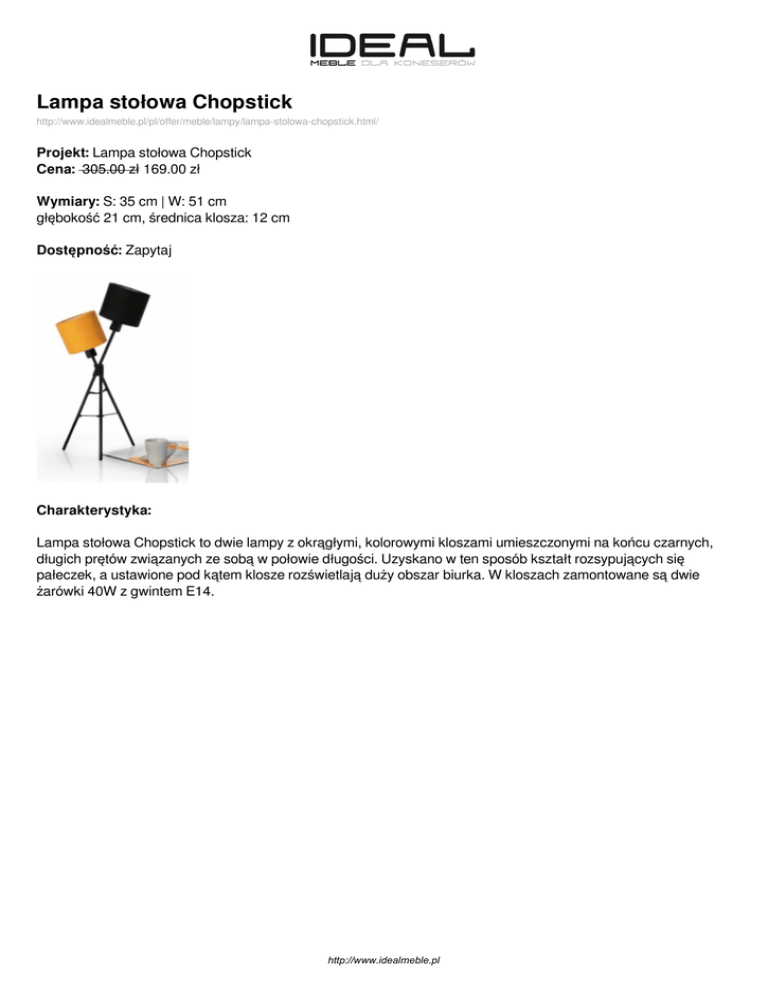 Lampa stołowa Chopstick http://www.idealmeble.pl/pl/offer/meble/lampy/lampa-stolowa-chopstick.html/ Projekt: Lampa stołowa Chopstick Cena: 305.00 zł 169.00 zł Wymiary: S: 35 cm | W: 51 cm głębokość 21 cm, średnica klosza: 12 cm Dostępność: Zapytaj Charakterystyka: Lampa stołowa Chopstick to dwie lampy z okrągłymi, kolorowymi kloszami umieszczonymi na końcu czarnych, długich prętów związanych ze sobą w połowie długości. Uzyskano w ten sposób kształt rozsypujących się pałeczek, a ustawione pod kątem klosze rozświetlają duży obszar biurka. W kloszach zamontowane są dwie żarówki 40W z gwintem E14. http://www.idealmeble.pl http://www.idealmeble.pl Zdjęcia produktu: http://www.idealmeble.pl Powered by TCPDF (www.tcpdf.org)