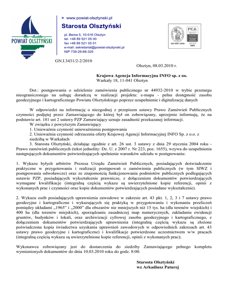 > www.powiat-olsztynski.pl Starosta Olsztyński pl. Bema 5, 10-516 Olsztyn tel. +48 89 521 05 00 fax +48 89 521 05 01 e-mail: [email protected] NIP 739-29-68-325 GN.I.3431/2-2/2010 Olsztyn, 08.03.2010 r. Krajowa Agencja Informacyjna INFO sp. z oo. Warkały 18, 11-041 Olsztyn Dot.: postępowania o udzielenie zamówienia publicznego nr 44932-2010 w trybie przetargu nieograniczonego na usługę doradczą w realizacji projektu: e-mapa - pełna dostępność zasobu geodezyjnego i kartograficznego Powiatu Olsztyńskiego poprzez uzupełnienie i digitalizację danych W odpowiedzi na informację o niezgodnej z przepisem ustawy Prawo Zamówień Publicznych czynności podjętej przez Zamawiającego do której był on zobowiązany, uprzejmie informuję, Ŝe na podstawie art. 181 ust 2 ustawy PZP Zamawiający uznaje zasadność przekazanej informacji. W związku z powyŜszym Zamawiający 1. UniewaŜnia czynność uniewaŜnienia postępowania 2. UniewaŜnia czynność odrzucenia oferty Krajowej Agencji Informacyjnej INFO Sp. z o.o. z siedzibą w Warkałach 3. Starosta Olsztyński, działając zgodnie z art. 26 ust. 3 ustawy z dnia 29 stycznia 2004 roku Prawo zamówień publicznych (tekst jednolity: Dz. U. z 2007 r. Nr 223, poz. 1655), wzywa do uzupełnienia następujących dokumentów potwierdzających spełnienie warunków udziału w postępowaniu: 1. Wykazu byłych arbitrów Prezesa Urzędu Zamówień Publicznych, posiadających doświadczenie praktyczne w przygotowaniu i realizacji postępowań o zamówienia publicznych (w tym SIWZ i postępowania odwoławcze) oraz ze znajomością funkcjonowania podmiotów publicznych podlegających ustawie PZP, posiadających wykształcenie prawnicze, z dołączeniem dokumentów potwierdzających wymagane kwalifikacje (integralną częścią wykazu są uwierzytelnione kopie referencji, opinii z wykonanych prac i czynności oraz kopie dokumentów potwierdzających posiadane wykształcenie). 2. Wykazu osób posiadających uprawnienia zawodowe w zakresie art. 43 pkt. 1, 2, 3 i 7 ustawy prawo geodezyjne i kartograficzne i wykazujących się praktyką w przygotowaniu i wykonaniu przeliczeń pomiędzy układami „1965” i „2000” dla obszarów nie mniejszych niŜ 15 tys. ha (dla terenów wiejskich) i 400 ha (dla terenów miejskich), sporządzaniu zasadniczej map numerycznych, zakładaniu ewidencji gruntów, budynków i lokali, oraz archiwizacji cyfrowej zasobu geodezyjnego i kartograficznego, z dołączeniem dokumentów potwierdzających uprawnienia (integralną częścią wykazu są złoŜone poświadczona kopia świadectwa uzyskania uprawnień zawodowych w odpowiednich zakresach art. 43 ustawy prawo geodezyjne i kartograficzne) i kwalifikacje potwierdzone uczestnictwem w/w pracach (integralną częścią wykazu są uwierzytelnione kopie referencji, opinii z wykonanych prac); Wykonawca zobowiązany jest do dostarczenia do siedziby Zamawiającego pełnego kompletu wymienionych dokumentów do dnia 10.03.2010 roku do godz. 8:00. Starosta Olsztyński wz Arkadiusz Paturej
