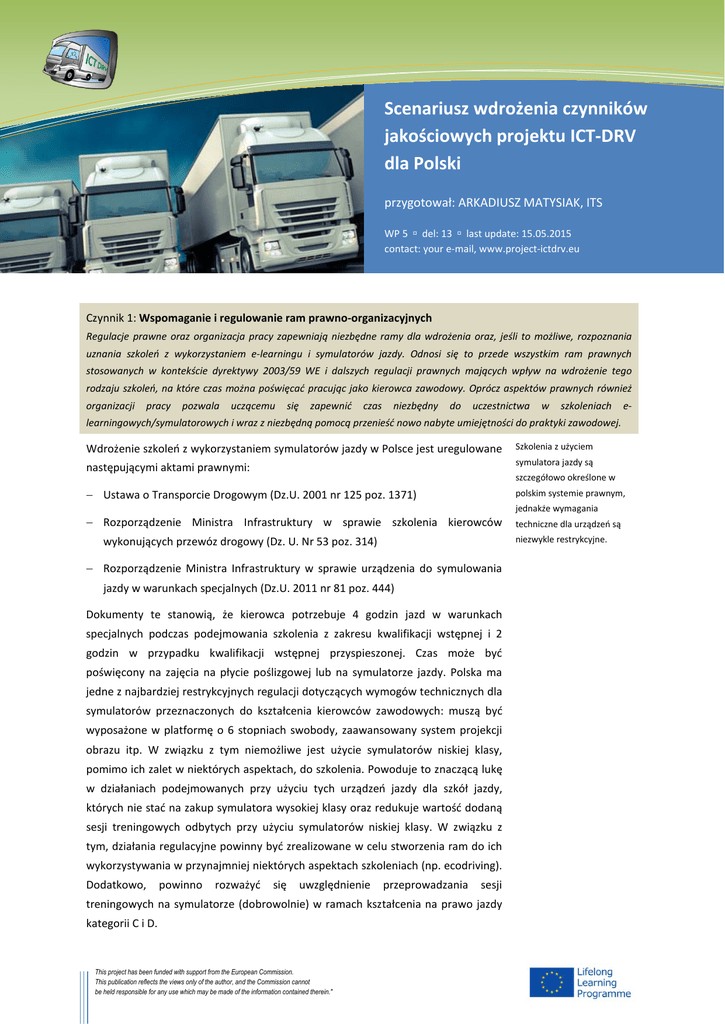 Scenariusz wdrożenia czynników jakościowych projektu ICT-DRV dla Polski przygotował: ARKADIUSZ MATYSIAK, ITS WP 5 del: 13 last update: 15.05.2015 contact: your e-mail, www.project-ictdrv.eu Czynnik 1: Wspomaganie i regulowanie ram prawno-organizacyjnych Regulacje prawne oraz organizacja pracy zapewniają niezbędne ramy dla wdrożenia oraz, jeśli to możliwe, rozpoznania uznania szkoleń z wykorzystaniem e-learningu i symulatorów jazdy. Odnosi się to przede wszystkim ram prawnych stosowanych w kontekście dyrektywy 2003/59 WE i dalszych regulacji prawnych mających wpływ na wdrożenie tego rodzaju szkoleń, na które czas można poświęcać pracując jako kierowca zawodowy. Oprócz aspektów prawnych również organizacji pracy pozwala uczącemu się zapewnić czas niezbędny do uczestnictwa w szkoleniach e- learningowych/symulatorowych i wraz z niezbędną pomocą przenieść nowo nabyte umiejętności do praktyki zawodowej. Wdrożenie szkoleń z wykorzystaniem symulatorów jazdy w Polsce jest uregulowane Szkolenia z użyciem następującymi aktami prawnymi: symulatora jazdy są − Ustawa o Transporcie Drogowym (Dz.U. 2001 nr 125 poz. 1371) polskim systemie prawnym, − Rozporządzenie Ministra Infrastruktury w sprawie szkolenia kierowców techniczne dla urządzeń są szczegółowo określone w niezwykle restrykcyjne. wykonujących przewóz drogowy (Dz. U. Nr 53 poz. 314) − Rozporządzenie Ministra Infrastruktury w sprawie urządzenia do symulowania jazdy w warunkach specjalnych (Dz.U. 2011 nr 81 poz. 444) Dokumenty te stanowią, że kierowca potrzebuje 4 godzin jazd w warunkach specjalnych podczas podejmowania szkolenia z zakresu kwalifikacji wstępnej i 2 godzin w przypadku kwalifikacji wstępnej przyspieszonej. Czas może być poświęcony na zajęcia na płycie poślizgowej lub na symulatorze jazdy. Polska ma jedne z najbardziej restrykcyjnych regulacji dotyczących wymogów technicznych dla symulatorów przeznaczonych do kształcenia kierowców zawodowych: muszą być wyposażone w platformę o 6 stopniach swobody, zaawansowany system projekcji obrazu itp. W związku z tym niemożliwe jest użycie symulatorów niskiej klasy, pomimo ich zalet w niektórych aspektach, do szkolenia. Powoduje to znaczącą lukę w działaniach podejmowanych przy użyciu tych urządzeń jazdy dla szkół jazdy, których nie stać na zakup symulatora wysokiej klasy oraz redukuje wartość dodaną sesji treningowych odbytych przy użyciu symulatorów niskiej klasy. W związku z tym, działania regulacyjne powinny być zrealizowane w celu stworzenia ram do ich wykorzystywania w przynajmniej niektórych aspektach szkoleniach (np. ecodriving). Dodatkowo, powinno rozważyć się uwzględnienie przeprowadzania sesji treningowych na symulatorze (dobrowolnie) w ramach kształcenia na prawo jazdy kategorii C i D. This project has been funded with support from the European Commission. This publication reflects the views only of the author, and the Commission cannot be held responsible for any use which may be made of the information contained therein." jednakże wymagania 2 Szkolenia realizowane przy użyciu e-learningu zostały zaaprobowane jako pełnoprawna forma szkolenia kierowców zgodnie z zapisami Ustawy o Kierujących Pojazdami (Dz. U. 2011 nr 30 poz. 151). Art. 23, paragraf 3 tejże ustawy wskazuje, że możliwe jest przeprowadzenie szkolenia na odległość z wykorzystaniem Internetu i Szkolenia e-learningowe mają już umiejscowienie w polskim systemie prawnym, ale dzięki ogólnie sformułowanym przepisom pod nadzorem ośrodka szkolenia kierowców. Ilość godzin, którą należy poświęcić na istnieje szeroka swoboda w takie szkolenie jest taka sama jak w przypadku kursów na salach wykładowych i definiowaniu programów obejmuje ten sam zakres materiału. Niestety, polskie przepisy nie odnoszą się do zapotrzebowania kursantów na bezpośredni dostęp do instruktora/wykładowcy. W nauczania. Regulacjom brakuje szczegółowych wymagań w tym zakresie. rezultacie brak jest kursów e-learningowych prowadzonych przez kompetentnych wykładowców, w ramach których kursanci mogą uzyskać porady drogą elektroniczną (oprócz informacji obecnej na platformie internetowej). Powoduje to znaczący brak wartości dydaktycznej tego rodzaju szkoleń. Aby zmienić obecny stan rzeczy proponuje się wprowadzenie dedykowanych zapisów prawnych, które jednakże nie będą mogły być wprowadzone bez szerokiego poparcia ośrodków nauki jazdy, wynikającego ze zwiększonej świadomości jakości edukacyjnej szkoleń e-learningowych. Czynnik 2: Wszechstronna informacja i doradztwo Zapewnione są środki przekazu i środki doradcze pozwalające na: • obiektywne informowanie użytkowników końcowych i decydentów nt. szkoleń z użyciem e-learningu/symulatorów jazdy, • umożliwienie kursantom, pracodawcowm i instytucjom decydowania o tym, czy oferta szkoleń spełnia ich wymagania, • umożlwienie kursantom i pracodawcom decydowania o tym, czy format szkolenia e-learningowego/symulatorowego jest odpowiedni dla konkretnego uczeni i/lub konkretnej potrzeby, • wybranie i adaptację kursów do indywidualnych potrzeb treningowych ucznia i/lub firmy, • zapewnienie uczniom i osobom kontaktowym w ich firmach niezbędnego doradztwa przed, w trakcie i po uczestniczeniu/wdrozeniu szkolenia. Obecnie brak jest w Polsce konkretnych akcji dla zapewniania informacji i doradztwa w zakresie szkoleń multimedialnych interesariuszom. Wszelkie publicznie dostępne informacje w tym zakresie(poza artykułami naukowymi i materiałami wytworzonymi w projektach badawczych) zostały stworzone przez W związku z brakiem działań informacyjnych podjętych w Polsce w celu przedstawienia zalet, postępu i innowacji w obrębie e-learningu/ ośrodki szkolenia kierowców w formie folderów reklamowych. Zmiana w tym symulatorów jazdy zakresie może być zapewniona poprzez zaangażowanie w działania przedstawicieli konieczne 