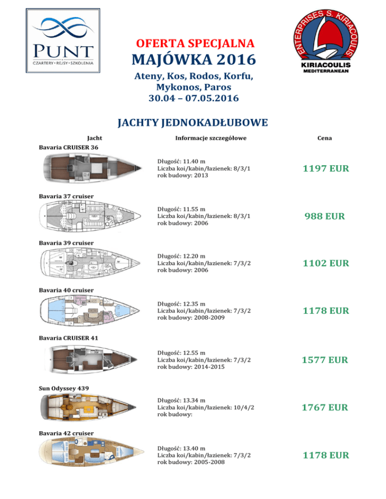 OFERTA SPECJALNA MAJÓWKA 2016 Ateny, Kos, Rodos, Korfu, Mykonos, Paros 30.04 – 07.05.2016 JACHTY JEDNOKADŁUBOWE Jacht Informacje szczegółowe Cena Bavaria CRUISER 36 Długość: 11.40 m Liczba koi/kabin/łazienek: 8/3/1 rok budowy: 2013 1197 EUR Długość: 11.55 m Liczba koi/kabin/łazienek: 8/3/1 rok budowy: 2006 988 EUR Długość: 12.20 m Liczba koi/kabin/łazienek: 7/3/2 rok budowy: 2006 1102 EUR Długość: 12.35 m Liczba koi/kabin/łazienek: 7/3/2 rok budowy: 2008-2009 1178 EUR Długość: 12.55 m Liczba koi/kabin/łazienek: 7/3/2 rok budowy: 2014-2015 1577 EUR Długość: 13.34 m Liczba koi/kabin/łazienek: 10/4/2 rok budowy: 1767 EUR Długość: 13.40 m Liczba koi/kabin/łazienek: 7/3/2 rok budowy: 2005-2008 1178 EUR Bavaria 37 cruiser Bavaria 39 cruiser Bavaria 40 cruiser Bavaria CRUISER 41 Sun Odyssey 439 Bavaria 42 cruiser Sun Odyssey 44i Długość: 13.75 m Liczba koi/kabin/łazienek: 10/4/2 rok budowy: 1672 EUR Długość: 13.95 m Liczba koi/kabin/łazienek: 9/4/2 rok budowy: 2002-2004 1216 EUR Długość: 14.20 m Liczba koi/kabin/łazienek: 9/4/2 rok budowy: 2005-2008 1539 EUR Długość: 15.57 m Liczba koi/kabin/łazienek: 10/5/3 rok budowy: 2014-2015 2793 EUR Bavaria 44 Bavaria 46 cruiser Bavaria CRUISER 51 KATAMARANY Lagoon 400 Długość: 11.97 m Liczba koi/kabin/łazienek: 10/6/4 rok budowy: 2010 2223 EUR Długość: 13.96 m Liczba koi/kabin/łazienek: 10/6/4 rok budowy: 2012 3648 EUR Lagoon 450 Płatne dodatkowo: sprzątanie po rejsie: 95 EUR / jachty 3-kabinowe 115 EUR / jachty 4-kabinowe i Lagoon 400 135 EUR / jachty 5-kabinowe i Lagoon 450 silnik do pontonu: 90 EUR Płatność: 50% ceny płatne w PLN według kursu sprzedaży NBP podczas podpisywania umowy, pozostała część płatna najpóźniej na pięć tygodni przed zaokrętowaniem. Kaucja: 2000 EUR / jachty do 40 stóp 3000 EUR / jachty powyżej 40 stóp lub ubezpieczenie kaucji 25 EUR / dzień UWAGA: możliwość dopasowania terminu czarteru do daty przelotu i rozpoczęcie / zakończenie czarteru w dowolnym dniu tygodnia! Oferta jest ograniczona. Zastrzegamy sobie możliwość zmiany cen. tel. 22 446 83 80, fax 22 894 00 42, e-mail: [email protected], http://www.punt.pl
