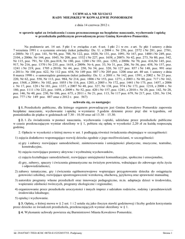 UCHWAŁA NR XI/124/12 RADY MIEJSKIEJ W KOWALEWIE POMORSKIM z dnia 14 czerwca 2012 r. w sprawie opłat za świadczenia i czasu przeznaczonego na bezpłatne nauczanie, wychowanie i opiekę w przedszkolu publicznym prowadzonym przez Gminę Kowalewo Pomorskie. Na podstawie art. 14 ust. 5 pkt 1 w związku z art. 6 ust. 1 pkt 2 i w zw. z art. 5c pkt 1 ustawy z dnia 7 września 1991 r. o systemie oświaty (tekst jednolity: Dz. U. z 2004 r. Nr 256, poz. 2572 i Nr 281, poz. 2781, z 2005r. Nr 17, poz. 141, Nr 94, poz. 788, Nr 122, poz. 1020, Nr 131, poz. 1091, Nr 167, poz. 1400 i Nr 249, poz. 2104, z 2006r. Nr 144, poz. 1043, Nr 208, poz. 1532 i Nr 227, poz. 1658, z 2007r. Nr 42, poz. 273, Nr 80, poz. 542, Nr 115, poz. 791, Nr 120, poz.818, Nr 180, poz. 1280 i Nr 181, poz. 1292, z 2008r. Nr 70, poz. 416,Nr 145, poz. 917, Nr 216, poz. 1370 i Nr 235, poz. 1618, z 2009r. Nr 6, poz. 33, Nr 31, poz. 206, Nr 56, poz. 458, Nr 157, poz. 1241 i Nr 219, poz. 1705 z 2010r. Nr 44, poz. 250, Nr 54, poz. 320, Nr 127 poz. 857 i Nr 148, poz. 991 oraz z 2011r. Nr 106 poz. 622, Nr 112 poz. 654, Nr 149 poz. 887 i Nr 205 poz. 1206 oraz art. 40 ust. 1 ustawy z dnia 8 marca 1990 r. o samorządzie gminnym (tekst jednolity: Dz. U. z 2001 r. Nr 142, poz. 1591, z 2002 r. Nr 23 poz. 220, Nr 62, poz. 558, Nr 113, poz. 984, Nr 214, poz. 1806 i Nr 153, poz. 1271, z 2003 r. Nr 80, poz. 717 i Nr 162, poz. 1568, z 2004 r. Nr 102, poz. 1055 i Nr 116, poz. 1203, z 2005 r. Nr 172, poz. 1441 i Nr 175, poz. 1457, z 2006 r. Nr 17, poz. 128 i Nr 181, poz. 1337, z 2007 Nr 48, poz. 327, Nr 138, poz. 974 i Nr 173, poz. 1218, z 2008 r. Nr 180, poz. 1111 i Nr 223, poz. 1458, z 2009 r. Nr 52, poz. 420 i Nr 157, poz. 1241, z 2010 r. Nr 28, poz. 142, Nr 28, poz. 146, Nr 40, poz. 230, Nr 106, poz. 675, z 2011 r. Nr 21, poz. 113, Nr 117 poz. 679, Nr 217, poz. 1281, Nr 134, poz. 777 i Nr 149 poz. 887 oraz z 2012 r. poz. 567) uchwala się, co następuje: § 1. Przedszkole publiczne, dla którego organem prowadzącym jest Gmina Kowalewo Pomorskie zapewnia bezpłatne nauczanie, wychowanie i opiekę w wymiarze 5 godzin dziennie przez pięć dni w tygodniu, od poniedziałku do piątku w godzinach od 7.30 - 10.30 oraz od 13.30 – 15.30. § 2. 1. Za świadczenia w postaci nauczania, wychowania i opieki, udzielane przez przedszkole publiczne w czasie przekraczającym wymiar określony w § 1, pobiera się opłatę w wysokości 2,20 zł za każdą rozpoczętą godzinę. 2. Opłacie w wysokości o której mowa w ust. 1 podlegają również świadczenia obejmujące w szczególności: 1) zajęcia dodatkowo wspomagające rozwój dziecka zgodnie z jego możliwościami, w szczególności: a) gry i zabawy rozwijające samodzielność, zainteresowania i umiejętności plastyczne, muzyczne, teatralne, konstrukcyjne, b) zajęcia rozwijające postawy aktywne i wyobraźnię wychowanków, c) zajęcia kształtujące samodzielność, rozwijające umiejętności komunikacyjne, społeczne i emocjonalne, d) gry, zabawy, spacery i ćwiczenia gimnastyczne na świeżym powietrzu, wdrażające do zdrowego stylu życia i odpowiedzialności, 2) zabawy tematyczne, gry i ćwiczenia ogólnorozwojowe wspierające przygotowanie dziecka do osiągnięcia gotowości szkolnej, rozwijające spostrzegawczość wzrokową, słuchową, językową oraz sprawność manualną; 3) autorskie programy własne przedszkoli oraz innowacje pedagogiczne, m.in. adaptacja dzieci w środowisku, wspieranie zdolności twórczych, programy ekologiczne i regionalne; 4) organizowanie przez przedszkola uroczystości i innych imprez z udziałem rodziców, rodziny i przedstawicieli środowiska lokalnego; 5) opiekę i wychowanie. § 3. Opłatę, o której mowa w § 2 ust. 1 i 2 ustala się jako iloczyn stawki godzinowej i liczby godzin korzystania przez dziecko ze świadczeń przedszkola, przekraczających wymiar określony w § 1. § 4. Wykonanie uchwały powierza się Burmistrzowi Miasta Kowalewo Pomorskie. ————————————————————————————————————————————————————————— Id: 29A97687-7FE0-4C0C-907D-E15252855755. Podpisany Strona 1 § 5. 1. Uchwała wchodzi w życie po upływie 14 dni od ogłoszenia w Dzienniku Urzędowym Województwa Kujawsko-Pomorskim. 2. Uchwała ma zastosowanie do świadczeń udzielanych od dnia 1 września 2012 r. Przewodniczący Rady Jerzy Orłowski ————————————————————————————————————————————————————————— Id: 29A97687-7FE0-4C0C-907D-E15252855755. Podpisany Strona 2 Uzasadnienie Na podstawie art. 14 ust. 5 ustawy z dnia 7 września 1991 r. o systemie oświaty (Dz.U. z 2004 r. Nr 256, poz. 2572 z późn. zm.) opłaty za świadczenia przedszkoli prowadzonych przez gminę ustala rada gminy z uwzględnieniem bezpłatnego nauczania, wychowania i opieki w czasie ustalonym przez organ prowadzący, nie krótszym niż 5 godzin dziennie. Ustawodawca wprowadził zmianę do ustawy o systemie oświaty, z której wynika konieczność podjęcia przez gminy nowych uchwał w sprawie opłat za świadczenia udzielane przez przedszkola publiczne (art. 2 ustawy z dnia 5 sierpnia 2010 r. o zmianie ustawy o systemie oświaty Dz.U. z 2010 r. Nr 148, poz. 991) Organ prowadzący ustala wysokość opłat za świadczenia udzielane przez przedszkola w czasie przekraczającym zapewnione bezpłatne nauczanie, wychowanie i opiekę. W przedłożonym projekcie uchwały określono czas, w którym świadczenia realizowane przez przedszkola są bezpłatne w wymiarze 5 godzin, 5 dni w tygodniu, od poniedziałku do piątku. Uchwała zakłada wprowadzenie opłaty za każdą godzinę korzystania przez dziecko ze świadczeń przekraczających bezpłatny pobyt w przedszkolu w wysokości 2,20 zł za każdą rozpoczętą godzinę świadczeń. Za podstawę wyliczenia tej stawki przyjęto miesięczny koszt za wynagrodzen