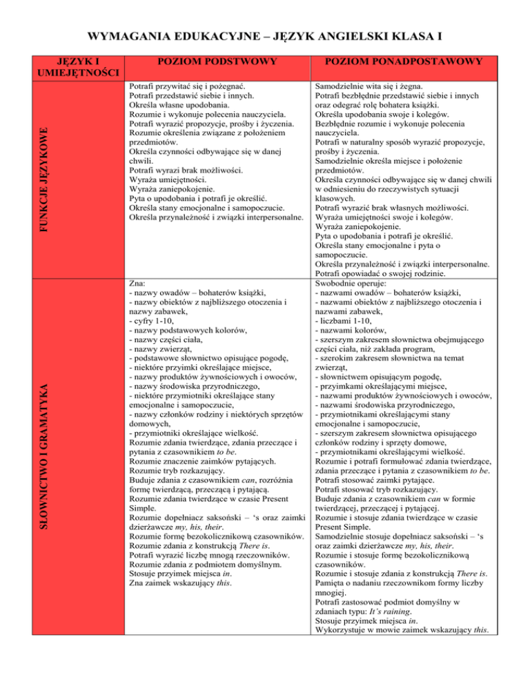 WYMAGANIA EDUKACYJNE – JĘZYK ANGIELSKI KLASA I SŁOWNICTWO I GRAMATYKA FUNKCJE JĘZYKOWE JĘZYK I UMIEJĘTNOŚCI POZIOM PODSTWOWY POZIOM PONADPOSTAWOWY Potrafi przywitać się i pożegnać. Potrafi przedstawić siebie i innych. Określa własne upodobania. Rozumie i wykonuje polecenia nauczyciela. Potrafi wyrazić propozycje, prośby i życzenia. Rozumie określenia związane z położeniem przedmiotów. Określa czynności odbywające się w danej chwili. Potrafi wyrazi brak możliwości. Wyraża umiejętności. Wyraża zaniepokojenie. Pyta o upodobania i potrafi je określić. Określa stany emocjonalne i samopoczucie. Określa przynależność i związki interpersonalne. Samodzielnie wita się i żegna. Potrafi bezbłędnie przedstawić siebie i innych oraz odegrać rolę bohatera książki. Określa upodobania swoje i kolegów. Bezbłędnie rozumie i wykonuje polecenia nauczyciela. Potrafi w naturalny sposób wyrazić propozycje, prośby i życzenia. Samodzielnie określa miejsce i położenie przedmiotów. Określa czynności odbywające się w danej chwili w odniesieniu do rzeczywistych sytuacji klasowych. Potrafi wyrazić brak własnych możliwości. Wyraża umiejętności swoje i kolegów. Wyraża zaniepokojenie. Pyta o upodobania i potrafi je określić. Określa stany emocjonalne i pyta o samopoczucie. Określa przynależność i związki interpersonalne. Potrafi opowiadać o swojej rodzinie. Swobodnie operuje: - nazwami owadów – bohaterów książki, - nazwami obiektów z najbliższego otoczenia i nazwami zabawek, - liczbami 1-10, - nazwami kolorów, - szerszym zakresem słownictwa obejmującego części ciała, niż zakłada program, - szerokim zakresem słownictwa na temat zwierząt, - słownictwem opisującym pogodę, - przyimkami określającymi miejsce, - nazwami produktów żywnościowych i owoców, - nazwami środowiska przyrodniczego, - przymiotnikami określającymi stany emocjonalne i samopoczucie, - szerszym zakresem słownictwa opisującego członków rodziny i sprzęty domowe, - przymiotnikami określającymi wielkość. Rozumie i potrafi formułować zdania twierdzące, zdania przeczące i pytania z czasownikiem to be. Potrafi stosować zaimki pytające. Potrafi stosować tryb rozkazujący. Buduje zdania z czasownikiem can w formie twierdzącej, przeczącej i pytającej. Rozumie i stosuje zdania twierdzące w czasie Present Simple. Samodzielnie stosuje dopełniacz saksoński – ‘s oraz zaimki dzierżawcze my, his, their. Rozumie i stosuje formę bezokolicznikową czasowników. Rozumie i stosuje zdania z konstrukcją There is. Pamięta o nadaniu rzeczownikom formy liczby mnogiej. Potrafi zastosować podmiot domyślny w zdaniach typu: It’s raining. Stosuje przyimek miejsca in. Wykorzystuje w mowie zaimek wskazujący this. Zna: - nazwy owadów – bohaterów książki, - nazwy obiektów z najbliższego otoczenia i nazwy zabawek, - cyfry 1-10, - nazwy podstawowych kolorów, - nazwy części ciała, - nazwy zwierząt, - podstawowe słownictwo opisujące pogodę, - niektóre przyimki określające miejsce, - nazwy produktów żywnościowych i owoców, - nazwy środowiska przyrodniczego, - niektóre przymiotniki określające stany emocjonalne i samopoczucie, - nazwy członków rodziny i niektórych sprzętów domowych, - przymiotniki określające wielkość. Rozumie zdania twierdzące, zdania przeczące i pytania z czasownikiem to be. Rozumie znaczenie zaimków pytających. Rozumie tryb rozkazujący. Buduje zdania z czasownikiem can, rozróżnia formę twierdzącą, przeczącą i pytającą. Rozumie zdania twierdzące w czasie Present Simple. Rozumie dopełniacz saksoński – ‘s oraz zaimki dzierżawcze my, his, their. Rozumie formę bezokolicznikową czasowników. Rozumie zdania z konstrukcją There is. Potrafi wyrazić liczbę mnogą rzeczowników. Rozumie zdania z podmiotem domyślnym. Stosuje przyimek miejsca in. Zna zaimek wskazujący this. KRYTERIA OCENIANIA – JĘZYK ANGIELSKI KLASA I W klasie I uczeń nabywa sprawności mówienia i rozumienia ze słuchu. Poziom wiadomości / Ocena Bardzo wysoki / 6 Wysoki / 5 Średni / 4 Niski / 3 Bardzo niski / 2 Najniższy / 1 Zakres umiejętności i wiadomości Rozumie wszystkie polecenia używane w klasie, bezbłędnie na nie reaguje, potrafi wydawać kolegom polecenia w języku angielskim. Bezbłędnie wymawia i intonuje wszystkie poznane na lekcjach słówka. Przypomina sobie dawno poznane słowa. Bezbłędnie recytuje/śpiewa z pamięci wszystkie poznane na lekcjach wierszyki, rymowanki i piosenki. Rozumie ze szczegółami wszystkie poznane na lekcjach historyjki. Ze szczególną starannością wykonuje wszystkie zadania w zeszycie ćwiczeń. Wzorowo prowadzi zeszyt przedmiotowy. Rozumie wszystkie polecenia używane w klasie, prawidłowo na nie reaguje. Zna w mowie wszystkie poznane na lekcjach słówka, a wymawiając je popełnia tylko nieliczne błędy. Recytuje/śpiewa z pamięci wszystkie poznane na lekcjach wierszyki, rymowanki i piosenki nie popełniając przy tym istotnych błędów. Rozumie ogólny sens wszystkich poznanych na lekcjach historyjek, gdy są one wspierane obrazkami, gestami, przedmiotami. Starannie wykonuje wszystkie zadania w zeszycie ćwiczeń. Bardzo starannie prowadzi zeszyt przedmiotowy. Rozumie większość poleceń używanych w klasie, poprawnie na nie reaguje. Zna większość poznanych na lekcjach słówek, a wymawiając je popełnia tylko nieliczne błędy. Recytuje/śpiewa z pamięci większość wierszyków, rymowanek i piosenek popełniając przy tym nieliczne błędy. Rozumie ogólny sens większości poznanych na lekcjach historyjek, gdy są one wspierane obrazkami, gestami, przedmiotami. Starannie wykonuje większość zadań w zeszycie ćwiczeń, popełniając nieliczne błędy. Stara się jak najlepiej prowadzić zeszyt przedmiotowy. Rozumie niektóre polecenia używane w klasie i stara się na nie reagować. Zna większość poznanych na lekcjach słówek lecz pope