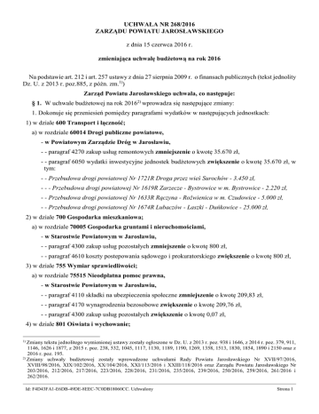 UCHWAŁA NR 268/2016 ZARZĄDU POWIATU JAROSŁAWSKIEGO z dnia 15 czerwca 2016 r. zmieniająca uchwałę budżetową na rok 2016 Na podstawie art. 212 i art. 257 ustawy z dnia 27 sierpnia 2009 r. o finansach publicznych (tekst jednolity Dz. U. z 2013 r. poz.885, z późn. zm.1)) Zarząd Powiatu Jarosławskiego uchwala, co następuje: § 1. W uchwale budżetowej na rok 20162) wprowadza się następujące zmiany: 1. Dokonuje się przeniesień pomiędzy paragrafami wydatków w następujących jednostkach: 1) w dziale 600 Transport i łączność; a) w rozdziale 60014 Drogi publiczne powiatowe, - w Powiatowym Zarządzie Dróg w Jarosławiu, - - paragraf 4270 zakup usług remontowych zmniejszenie o kwotę 35.670 zł, - - paragraf 6050 wydatki inwestycyjne jednostek budżetowych zwiększenie o kwotę 35.670 zł, w tym: - - Przebudowa drogi powiatowej Nr 1721R Droga przez wieś Surochów - 3.450 zł, - - - Przebudowa drogi powiatowej Nr 1619R Zarzecze - Bystrowice w m. Bystrowice - 2.220 zł, - - Przebudowa drogi powiatowej Nr 1633R Rączyna - Roźwienica w m. Czudowice - 5.000 zł, - - Przebudowa drogi powiatowej Nr 1674R Lubaczów - Laszki - Duńkowice - 25.000 zł, 2) w dziale 700 Gospodarka mieszkaniowa; a) w rozdziale 70005 Gospodarka gruntami i nieruchomościami, - w Starostwie Powiatowym w Jarosławiu, - - paragraf 4300 zakup usług pozostałych zmniejszenie o kwotę 800 zł, - - paragraf 4610 koszty postepowania sądowego i prokuratorskiego zwiększenie o kwotę 800 zł, 3) w dziale 755 Wymiar sprawiedliwości; a) w rozdziale 75515 Nieodpłatna pomoc prawna, - w Starostwie Powiatowym w Jarosławiu, - - paragraf 4110 składki na ubezpieczenia społeczne zmniejszenie o kwotę 209,83 zł, - - paragraf 4170 wynagrodzenia bezosobowe zwiększenie o kwotę 209,76 zł, - - paragraf 4300 zakup usług pozostałych zwiększenie o kwotę 0,07 zł, 4) w dziale 801 Oświata i wychowanie; Zmiany tekstu jednolitego wymienionej ustawy zostały ogłoszone w Dz. U. z 2013 r. poz. 938 i 1646, z 2014 r. poz. 379, 911, 1146, 1626 i 1877, z 2015 r. poz. 238, 532, 1045, 1117, 1130, 1189, 1190, 1269, 1358, 1513, 1830, 1854, 1890 i 2150 oraz z 2016 r. poz. 195. 2) Zmiany uchwały budżetowej zostały wprowadzone uchwałami Rady Powiatu Jarosławskiego Nr XVII/97/2016, XVIII/98/2016, XIX/102/2016, XX/104/2016, XXI/113/2016 i XXIII/118/2016 oraz Zarządu Powiatu Jarosławskiego Nr 203/2016, 212/2016, 217/2016, 223/2016, 228/2016, 231/2016, 235/2016, 239/2016, 250/2016, 259/2016, 261/2016 i 262/2016. 1) Id: F4D43FA1-E6DB-49DE-8EEC-7C0DB18060CC. Uchwalony Strona 1 a) w rozdziale 80102 Szkoły podstawowe specjalne, - w Specjalnym Ośrodku Szkolno - Wychowawczym w Jarosławiu, - - paragraf 4010 wynagrodzenia osobowe pracowników zwiększenie o kwotę 10.000 zł, - - paragraf 4110 składki na ubezpieczenia społeczne zwiększenie o kwotę 2.224 zł, - - paragraf 4430 różne opłaty i składki zmniejszenie o kwotę 2.299 zł, - - paragraf 4510 opłaty na rzecz budżetu państwa zwiększenie o kwotę 75 zł, b) w rozdziale 80111 Gimnazja specjalne, - w Specjalnym Ośrodku Szkolno - Wychowawczym w Jarosławiu, - - paragraf 4010 wynagrodzenia osobowe pracowników zmniejszenie o kwotę 10.000 zł, c) w rozdziale 80130 Szkoły zawodowe, - w Zespole Szkół Spożywczych, Chemicznych i Ogólnokształcących w Jarosławiu, - - paragraf 4270 zakup usług remontowych zmniejszenie o kwotę 1.000 zł, - - paragraf 4360 opłaty z tytułu zakupu usług telekomunikacyjnych zmniejszenie o kwotę 1.000 zł, - - paragraf 4410 podróże służbowe krajowe zmniejszenie o kwotę 1.000 zł, - - paragraf 4430 różne opłaty i składki zmniejszenie o kwotę 2.000 zł, - - paragraf 4950 różnice kursowe zwiększenie o kwotę 5.000 zł - w Zespole Szkół Spożywczych, Chemicznych i Ogólnokształcących w Jarosławiu / projekt „Mobilność uczniów - sposobem na lepszy start zawodowy i życiowy”/, - - paragraf 4211 zakup materiałów i wyposażenia zwiększenie o kwotę 599,60 zł, - - paragraf 4301 zakup usług pozostałych zwiększenie o kwotę 1.710,74 zł, - - paragraf 4411 podróże służbowe krajowe zwiększenie o kwotę 316,48 zł, - - paragraf 4421 podróże służbowe zagraniczne zmniejszenie o kwotę 1.027,22 zł, - - paragraf 4431 różne opłaty i składki zmniejszenie o kwotę 1.599,60 zł, 5) w dziale 852 Pomoc społeczna; a) w rozdziale 85203 Ośrodki wsparcia, - w Powiatowym Centrum Pomocy Rodzinie w Jarosławiu, - - paragraf 4270 zakup usług remontowych zwiększenie o kwotę 12.000 zł, - - paragraf 4300 zakup usług pozostałych zmniejszenie o kwotę 10.500 zł, - - paragraf 4360 opłaty z tytułu zakupu usług telekomunikacyjnych zmniejszenie o kwotę 1.500 zł, b) w rozdziale 85205 Zadania w zakresie przeciwdziałania przemocy w rodzinie, - w Powiatowym Centrum Pomocy Rodzinie w Jarosławiu, - - paragraf 4170 wynagrodzenia bezosobowe zmniejszenie o kwotę 1.000 zł, - - paragraf 4210 zakup materiałów i wyposażenia zwiększenie o kwotę 1.000 zł, 6) w dziale 853 Pozostałe zadania w zakresie polityki społecznej, a) w rozdziale 85321 Zespoły do spraw orzekania o niepełnosprawności, - w Powiatowym Zespole Do Spraw Orzekania o Niepełnosprawności w Jarosławiu, - - paragraf 4010 wynagrodzenia osobowe pracowników zmniejszenie o kwotę 15.000 zł, Id: F4D43FA1-E6DB-49DE-8EEC-7C0DB18060CC. Uchwalony Strona 2 - - paragraf 4110 składki na ubezpieczenia społeczne zmniejszenie o kwotę 5.000 zł, - - paragraf 4300 zakup usług pozostałych zwiększenie o kwotę 20.000 zł. § 2. Wykonanie uchwały powierza się Przewodniczącemu Zarządu. § 3. Uchwała wchodzi w życie z dniem podjęcia. Przewodniczący Zarządu Powiatu Jarosławskiego Tadeusz Chrzan Id: F4D43FA1-E6DB-49DE-8EEC-7C0DB18060CC. Uchwalony Strona 3