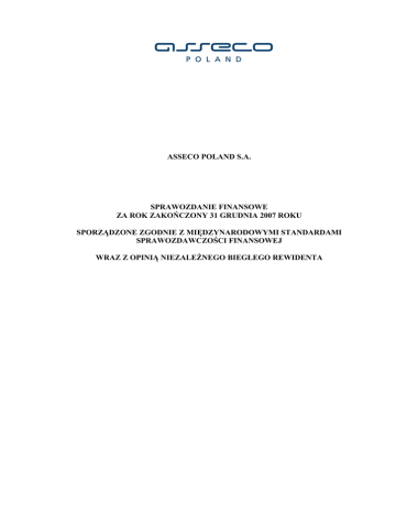 ASSECO POLAND S.A. SPRAWOZDANIE FINANSOWE ZA ROK ZAKOŃCZONY 31 GRUDNIA 2007 ROKU SPORZĄDZONE ZGODNIE Z MIĘDZYNARODOWYMI STANDARDAMI SPRAWOZDAWCZOŚCI FINANSOWEJ WRAZ Z OPINIĄ NIEZALEŻNEGO BIEGŁEGO REWIDENTA ASSECO POLAND S.A. Sprawozdanie finansowe za rok zakończony 31 grudnia 2007 roku Wszystkie kwoty wyrażono w tysiącach złotych (PLN), chyba że stwierdzono inaczej SPRAWOZDANIE FINANSOWE ASSECO POLAND S.A. ZA ROK ZAKOŃCZONY 31 GRUDNIA 2007 ROKU WRAZ Z OPINIĄ NIEZALEŻNEGO BIEGŁEGO REWIDENTA Spis treści Strona OPINIA NIEZALEŻNEGO BIEGŁEGO REWIDENTA............................................................................................................. 3 RACHUNEK ZYSKÓW I STRAT............................................................................................................................................... 5 BILANS ........................................................................................................................................................................................ 6 SPRAWOZDANIE ZE ZMIAN W KAPITALE WŁASNYM ..................................................................................................... 8 RACHUNEK PRZEPŁYWÓW PIENIĘŻNYCH ......................................................................................................................... 9 DODATKOWE INFOMACJE I OBJAŚNIENIA....................................................................................................................... 10 I. INFORMACJE OGÓLNE................................................................................................................................................... 10 II. ZASADY RACHUNKOWOŚCI ZASTOSOWANE PRZY SPORZĄDZANIU SPRAWOZDANIA FINANSOWEGO................................................................................................................................................................ 18 III. NOTY OBJAŚNIAJĄCE DO SPRAWOZDANIA FINANSOWEGO............................................................................... 35 Sprawozdanie zawiera 92 kolejno ponumerowane strony, od strony 1 do 92. Niniejsze sprawozdanie finansowe zostało zatwierdzone do publikacji przez Zarząd Asseco Poland S.A. dnia 22 kwietnia 2008 roku. Zarząd: Adam Góral Prezes Zarządu Przemysław Borzestowski Wiceprezes Zarządu Piotr Jeleński Wiceprezes Zarządu Marek Panek Wiceprezes Zarządu Zbigniew Pomianek Wiceprezes Zarządu Adam Rusinek Wiceprezes Zarządu Przemysław Sęczkowski Wiceprezes Zarządu Robert Smułkowski Wiceprezes Zarządu Tadeusz Dyrga Wiceprezes Zarządu Krzysztof Kardaś Wiceprezes Zarządu Włodzimierz Serwiński Wiceprezes Zarządu Osoba odpowiedzialna za prowadzenie ksiąg rachunkowych: Danuta Stec Główny Księgowy 2 OPINIA NIEZALEŻNEGO BIEGŁEGO REWIDENTA 3 OPINIA NIEZALEŻNEGO BIEGŁEGO REWIDENTA 4 ASSECO POLAND S.A. Sprawozdanie finansowe za rok zakończony 31 grudnia 2007 roku Wszystkie kwoty wyrażono w tysiącach złotych (PLN), chyba że stwierdzono inaczej RACHUNEK ZYSKÓW I STRAT ASSECO POLAND S.A. Nr Noty objaśniającej do sprawozdania finansowego 12 miesięcy do 31 grudnia 2007 (badane) 12 miesięcy do 31 grudnia 2006 (badane) Działalność kontynuowana Przychody ze sprzedaży 1 443 434 301 117 Koszt własny sprzedaży 2 (253 092) (212 133) 190 342 88 984 (21 448) (35 446) (6 642) (30 748) 133 448 51 594 1 289 (1 039) 855 (3 809) 133 698 48 640 71 513 (76 529) 78 062 (66 457) 128 682 60 245 5 (23 051) (2 484) 6 62 0 105 693 57 761 2,29 2,29 2,29 2,29 Zysk brutto ze sprzedaży Koszty sprzedaży (-) 2 Koszty ogólnego zarządu (-) 2 Zysk netto ze sprzedaży Pozostałe przychody operacyjne 3 Pozostałe koszty operacyjne (-) 3 Zysk z działalności operacyjnej Przychody finansowe 4 Koszty finansowe (-) 4 Zysk brutto Podatek dochodowy (bieżące i odroczone obciążenie podatkowe) Działalność zaniechana Zysk za rok obrotowy z działalności zaniechanej Zysk za okres sprawozdawczy Zysk netto z działalności kontynuowanej przypadający na jedną akcję (w złotych) podstawowy z zysku netto za okres sprawozdawczy (w złotych) 7 rozwodniony z zysku netto za okres sprawozdawczy (w złotych) 7 Dodatkowe informacje i objaśnienia do sprawozdania finansowego załączone na stronach od 10 do 92 stanowią jego integralną część 5 ASSECO POLAND S.A. Sprawozdanie finansowe za rok zakończony 31 grudnia 2007 roku Wszystkie kwoty wyrażono w tysiącach złotych (PLN), chyba że stwierdzono inaczej BILANS ASSECO POLAND S.A. Nr Noty objaśniającej do sprawozdania finansowego 31 grudnia 2007 (badane) 31 grudnia 2006 (badane) 1 769 316 310 239 12 18 278 8 225 859 041 819 366 18 824 0 14 119 190 694 15 551 498 14 900 30 114 31 104 1 737 10 000 52 385 22 583 1 136 684 239 302 626 14 14 012 14 862 104 212 156 094 208 620 14 699 11 575 18 608 106 119 44 231 7 980 4 478 15 71 139 83 572 20 100 601 26 063 2 453 555 612 865 AKTYWA Aktywa trwałe Rzeczowe aktywa trwałe Nieruchomości inwestycyjne Wartości niematerialne Inwestycje w jednostkach zależnych i stowarzyszonych Długoterminowe aktywa finansowe wyceniane w wartościach godziwych przez wynik finansowy Długoterminowe pożyczki Należności długoterminowe Aktywa z tytułu odroczonego podatku dochodowego Długoterminowe rozliczenia międzyokresowe 9 10 11 19 5 16 Aktywa obrotowe Zapasy Rozliczenia międzyokresowe Należności z tytułu dostaw i usług Inne należności Aktywa finansowe utrzymywane do terminu wymagalności Pożyczki Aktywa finansowe wyceniane w wartościach godziwych przez wynik finansowy Środki pieniężne i depozyty krótkoterminowe SUMA AKTYWÓW 17 16 19 19 13 Dodatkowe informacje i objaśnienia do sprawozdania finansowego załączone na stronach od 10 do 92 stanowią jego integralną część 6 ASSECO POLAND S.A. Sprawozdanie finansowe za rok zakończony 31 grudnia 2007 roku Wszystkie kwoty wyrażono w tysiącach złotych (PLN), chyba że stwierdzono inaczej BILANS ASSECO POLAND S.A. Nr Noty objaśniającej d
