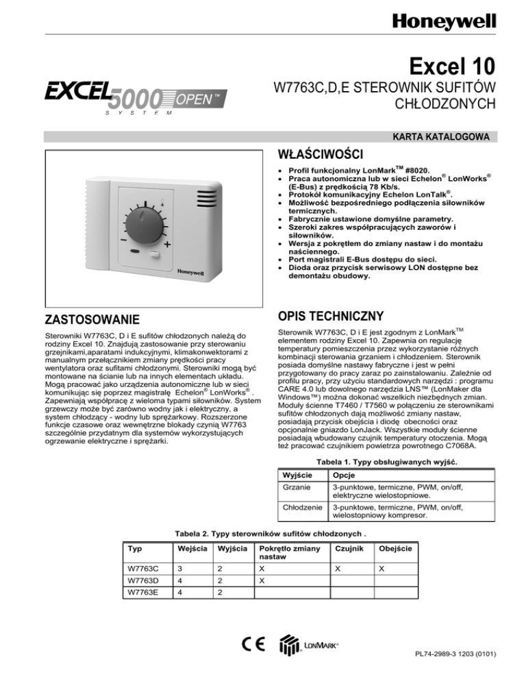 Excel 10 W7763C,D,E STEROWNIK SUFITÓW CHŁODZONYCH KARTA KATALOGOWA WŁAŚCIWOŚCI • Profil funkcjonalny LonMarkTM #8020. • Praca autonomiczna lub w sieci Echelon® LonWorks® (E-Bus) z prędkością 78 Kb/s. • Protokół komunikacyjny Echelon LonTalk®. • Możliwość bezpośredniego podłączenia siłowników termicznych. • Fabrycznie ustawione domyślne parametry. • Szeroki zakres współpracujących zaworów i siłowników. • Wersja z pokrętłem do zmiany nastaw i do montażu naściennego. • Port magistrali E-Bus dostępu do sieci. • Dioda oraz przycisk serwisowy LON dostępne bez demontażu obudowy. ZASTOSOWANIE OPIS TECHNICZNY Sterowniki W7763C, D i E sufitów chłodzonych należą do rodziny Excel 10. Znajdują zastosowanie przy sterowaniu grzejnikami,aparatami indukcyjnymi, klimakonwektorami z manualnym przełącznikiem zmiany prędkości pracy wentylatora oraz sufitami chłodzonymi. Sterowniki mogą być montowane na ścianie lub na innych elementach układu. Mogą pracować jako urządzenia autonomiczne lub w sieci komunikując się poprzez magistralę Echelon® LonWorks® . Zapewniają współpracę z wieloma typami siłowników. System grzewczy może być zarówno wodny jak i elektryczny, a system chłodzący - wodny lub sprężarkowy. Rozszerzone funkcje czasowe oraz wewnętrzne blokady czynią W7763 szczególnie przydatnym dla systemów wykorzystujących ogrzewanie elektryczne i sprężarki. Sterownik W7763C, D i E jest zgodnym z LonMarkTM elementem rodziny Excel 10. Zapewnia on regulację temperatury pomieszczenia przez wykorzystanie różnych kombinacji sterowania grzaniem i chłodzeniem. Sterownik posiada domyślne nastawy fabryczne i jest w pełni przygotowany do pracy zaraz po zainstalowaniu. Zależnie od profilu pracy, przy użyciu standardowych narzędzi : programu CARE 4.0 lub dowolnego narzędzia LNS™ (LonMaker dla Windows™) można dokonać wszelkich niezbędnych zmian. Moduły ścienne T7460 / T7560 w połączeniu ze sterownikami sufitów chłodzonych dają możliwość zmiany nastaw, posiadają przycisk obejścia i diodę obecności oraz opcjonalnie gniazdo LonJack. Wszystkie moduły ścienne posiadają wbudowany czujnik temperatury otoczenia. Mogą też pracować czujnikiem powietrza powrotnego C7068A. Tabela 1. Typy obsługiwanych wyjść. Wyjście Opcje Grzanie 3-punktowe, termiczne, PWM, on/off, elektryczne wielostopniowe. Chłodzenie 3-punktowe, termiczne, PWM, on/off, wielostopniowy kompresor. Tabela 2. Typy sterowników sufitów chłodzonych . Typ Wejścia Wyjścia Pokrętło zmiany nastaw Czujnik Obejście W7763C 3 2 X X X W7763D 4 2 X W7763E 4 2 PL74-2989-3 1203 (0101) W7763C,D,E STEROWNIKI SUFITÓW CHŁODZONYCH Charakterystyki pracy Otwarte okno Jeżeli sterownik jest skonfigurowany na wykrywanie otwarcia okna, to automatycznie uniemożliwia włączenie grzania lub chłodzenia, aż do zamknięcia okna. Zabezpieczenie przeciwzamrożeniowe pozostaje aktywne. Charakterystyki grzania i chłodzenia mogą być wybierane jako aktywne lub nie, dając w sumie cztery różne kombinacje sterowania: - Tylko grzanie - Tylko chłodzenie - Zmiana grzanie/chłodzenie - Sekwencja grzania i chłodzenia Zabezpieczenie przeciwzamrożeniowe Jeśli temperatura spadnie poniżej 8°C, sterownik załącza obwód grzania jako zabezpieczenie przed zamrożeniem. Awaria wentylatora Przy wykorzystaniu czujnika przepływu sterownik może wyłączyć instalację przy awarii wentylatora (w klimakonwektorach z ręczną zmianą prędkości). PASMO ENERGII ZEROWEJ ZAPOTRZEBOWANIE CIEPŁA ZAPOTRZEBOWANIE CHŁODU SYGNAŁ WYJŚCIOWY (%) Przełączanie Sterownik może sterować pracą klimakonwektorów dwururowych z wejściem przełączania trybu pracy. Punkt rosy Przy wykorzystaniu czujnika temperatury wody chłodzącej, sterownik może zamknąć zawór, gdy jej temperatura spadnie poniżej punktu rosy. Wartość punktu rosy może być stała lub wyliczana na podstawie sygnału z czujnika wilgotności. NASTAWA GRZANIA ZAKRES PROPORCJONALNOŚCI GRZANIA NASTAWA CHŁODZENIA ZAKRES PROPORCJONALNOŚCI CHŁODZENIA TEMPERATURA POMIESZCZENIA Kondensacja Przy wykorzystaniu czujnika kondensacji sterownik zamknie zawór wody chłodzącej, gdy zostanią wykryte skropliny. Rys. 1. Charakterystyki pracy. STEROWNIK W7763E Tryby pracy CZUJNIK TEMPERATURY WODY CHŁODZĄCEJ Sterownik posiada następujące tryby pracy. Tryb Zajęty Są to normalne warunki pracy dla pomieszczenia lub strefy gdy jest ona zajęta. Sterownik może zostać przełączony w ten tryb przez sygnał z sieci, czujnika obecności lub przyciskiem znajdującym się na module ściennym. MODUŁ ŚCIENNY Z CZUJNIKIEM TEMPERATURY KONTAKT OKIENNY CZUJNIK WILGOTNOŚCI Tryb Dyżurny Tryb czuwania oszczędza energię redukując grzanie lub chłodzenie gdy osoby są w pomieszczeniu chwilowo nieobecne. Tryb Pusty Przez dłuższy czas nikt nie jest obecny w pomieszczeniu jak np. dni wolne, noce, okresy wakacyjne. Rys. 2. Typowe zastosowanie. Tabela 3. Dane techniczne wejść/wyjść. Wejścia: Binarne Numer pinu 4 Parametry zamknięte ≤ 400 Ω, otwarte ≥ 10 KΩ Binarne1,2 Analogowe Analogowe Analogowe1 Funkcja Okno/zajętość/przełączanie pracy/przepływ powietrza/kondensacja Ręczne przesterowanie Czujnik wilgotności Czujnik temperatury Zmiana nastawy 7 1 3,9 8 zamknięte ≤ 400 Ω, otwarte ≥ 3.3 KΩ 0 .. 10 V DC 20 KΩ NTC (25°C) 10 KΩ Wyjścia: Binarne1 Triakowe(2 pary)3 Obejście LED Grzanie i chłodzenie 6 14,15 17,18 0 / 5 V DC (I < 10 mA) 24 V AC, 250 mA max ciągły, 650 mA max impuls (≤ 30 sec) 1 Tylko podłączenia modułu ściennego. Nie można używać modułów ściennych z przełącznikami prędkości pracy wentylatora. 3 Patrz Tabela 1 opcje typów wyjść. 2 PL74-2989-3 1203 (0101) 2 W7763C,D,E STEROWNIKI SUFITÓW CHŁODZONYCH DANE TECHNICZNE Profil funkcjonalny LonMarkTM Sterowniki sufitów chłodzonych W7763 odpowiadają profilowi funkcjonalnemu LonMark #8020 “Fan Coil Unit Controller”, wers
