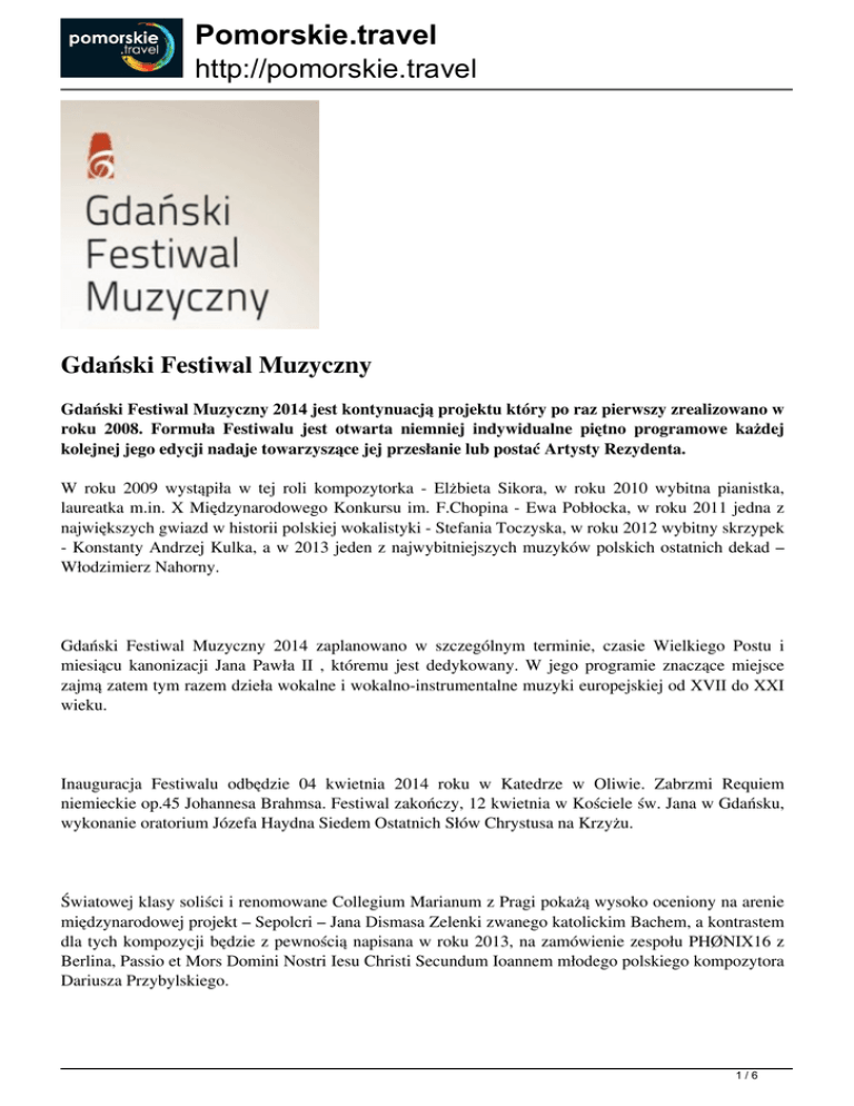 Pomorskie.travel http://pomorskie.travel Gdański Festiwal Muzyczny Gdański Festiwal Muzyczny 2014 jest kontynuacją projektu który po raz pierwszy zrealizowano w roku 2008. Formuła Festiwalu jest otwarta niemniej indywidualne piętno programowe każdej kolejnej jego edycji nadaje towarzyszące jej przesłanie lub postać Artysty Rezydenta. W roku 2009 wystąpiła w tej roli kompozytorka - Elżbieta Sikora, w roku 2010 wybitna pianistka, laureatka m.in. X Międzynarodowego Konkursu im. F.Chopina - Ewa Pobłocka, w roku 2011 jedna z największych gwiazd w historii polskiej wokalistyki - Stefania Toczyska, w roku 2012 wybitny skrzypek - Konstanty Andrzej Kulka, a w 2013 jeden z najwybitniejszych muzyków polskich ostatnich dekad – Włodzimierz Nahorny. Gdański Festiwal Muzyczny 2014 zaplanowano w szczególnym terminie, czasie Wielkiego Postu i miesiącu kanonizacji Jana Pawła II , któremu jest dedykowany. W jego programie znaczące miejsce zajmą zatem tym razem dzieła wokalne i wokalno-instrumentalne muzyki europejskiej od XVII do XXI wieku. Inauguracja Festiwalu odbędzie 04 kwietnia 2014 roku w Katedrze w Oliwie. Zabrzmi Requiem niemieckie op.45 Johannesa Brahmsa. Festiwal zakończy, 12 kwietnia w Kościele św. Jana w Gdańsku, wykonanie oratorium Józefa Haydna Siedem Ostatnich Słów Chrystusa na Krzyżu. Światowej klasy soliści i renomowane Collegium Marianum z Pragi pokażą wysoko oceniony na arenie międzynarodowej projekt – Sepolcri – Jana Dismasa Zelenki zwanego katolickim Bachem, a kontrastem dla tych kompozycji będzie z pewnością napisana w roku 2013, na zamówienie zespołu PHØNIX16 z Berlina, Passio et Mors Domini Nostri Iesu Christi Secundum Ioannem młodego polskiego kompozytora Dariusza Przybylskiego. 1/6 Pomorskie.travel http://pomorskie.travel Wydarzeniem Festiwalu będzie również koncert Moskiewskiej Orkiestry Symfonicznej(MSO) pod dyrekcją Arthura Arnolda z udziałem znakomitego pianisty Mikhaila Petukhova, recital izraelskiego pianisty, laureata Konkursu im. L. van Beethovena Ishay’a Shaer’a i występ jednego z najsłynniejszych kwartetów smyczkowych świata Emmerson String Quartet. Stałym elementem programu Gdańskiego Festiwalu Muzycznego są koncerty muzyki gdańskiej zarówno dawnej jak i współczesnej oraz koncerty poza obszarem Gdańska m.in. w Sopocie, Gdyni, Starogardzie Gdańskim, Elblągu, Trąbkach Wielkich i Pruszczu Gdańskim. Piątek, 04 kwietnia 2014r. Inauguracja Gdańskiego Festiwalu Muzycznego - Koncert Papieski godz. 20.00 Miejsce: Katedra w Oliwie Inauguracja Festiwalu J. Brahms – Requiem niemieckie Julia Novikova – sopran Vladimir Gromov – baryton Chór Filharmonii w Mińsku Orkiestra Symfoniczna Polskiej Filharmonii Bałtyckiej Ernst van Tiel – dyrygent Sobota, 05 kwietnia 2014r. Nowe Brzmienia Gdańskie godz. 18.00 Miejsce: Sala Koncertowa Akademii Muzycznej w Gdańsku Nowe Brzmienia Gdańskie Sinfonietta Pomerania Tadeusz Dixa – dyrygent 2/6 Pomorskie.travel http://pomorskie.travel Niedziela, 06 kwietnia 2014r. NADZWYCZAJNY KONCERT SYMFONICZNY godz. 18.00 Miejsce: Sala Koncertowa Polskiej Filharmonii Bałtyckiej w Gdańsku Nadzwyczajny koncert symfoniczny Mikhail Petukhow – fortepian Moskiewska Orkiestra Symfoniczna ( MSO ) Arthur Arnold – dyrygent M.Glinka - Uwertura do opery Rusłan i Ludmiła A.Rubinstein - IV Koncert fortepianowy P.Czajkowski - V Symfonia Poniedziałek, 07 kwietnia 2014r. MUZYKA ROSYJSKA I NIE TYLKO godz. 19.00 Miejsce: Sala Koncertowa Polskiej Filharmonii Bałtyckiej w Gdańsku Dawne Brzmienia Europy - J.D.Zelenka / Sepolcri Hana Blazikova – sopran Markéta Cukrová – alt Čeněk Svoboda – tenor Roman Hoza – bas Jana Semerádová – flet, dyrektor artystyczny Collegium Marianum Praga Jan Dismas Zelenka (1679 - 1745) Immisit Dominus pestilentiam ZWV 58 (1709) Attendite et videte ZWV 59 (1712) Deus Dux fortissime ZWV 60 (1716) Wtorek, 08 kwietnia 2014r. MUZYCZNE VARIÉTÉS - ORGANY I FLET W ROLI GŁÓWNEJ godz. 18.00 Miejsce: Dwór Artusa w Gdańsku 3/6 Pomorskie.travel http://pomorskie.travel Dawne Brzmienia Gdańskie Hevelius Brass Paweł Hulisz – trąbka Piotr Kowalkowski – trąbka Michał Szczerba – waltornia Bogdan Kwiatek puzon Łukasz Gruba – tuba godz. 19.00 Miejsce: Sala Koncertowa Polskiej Filharmonii Bałtyckiej w Gdańsku Łukasz Długosz – flet Roman Perucki- organy 20.00 Miejsce: Bazylika św.Mikołaja w Gdańsku Dariusz Przybylski - Passio et Mors Domini Nostri Iesu Christi Secundum Ioannem PHØNIX16 Berlin Środa, 09 kwietnia 2014r. NADZWYCZAJNY RECITAL FORTEPIANOWY godz. 19.00 Miejsce: Sala Koncertowa Polskiej Filharmonii Bałtyckiej w Gdańsku Nadzwyczajny recital fortepianowy Ishay Shaer – fortepian R. Schumann - Novelette Op. 21 No. 8 M.Ravel - Jeux d'eau J.S.Bach / J.Brahms - Chaconne for the left hand B.Bartók - Out of doors, Sz. 81 M.Mussorgsky - Pictures at an Exhibition Czwartek, 10 kwietnia 2014r. ARCYDZIEŁA KAMERALISTYKI godz.17.00 Miejsce: Studio Koncertowe Radia Gdańsk im. Janusza Hajduna 4/6 Pomorskie.travel http://pomorskie.travel Recital fortepianowy Laureat Estrady Młodych i nagrody im.J.Waldorffa 47 Festiwalu Pianistyki Polskiej w Słupsku Adam Piórkowski - fortepian godz. 19.00 Miejsce: Sala Koncertowa Polskiej Filharmonii Bałtyckiej w Gdańsku Arcydzieła kameralistyki Emmerson String Quartet Piątek, 11 kwietnia 2014r. WOJCIECH KILAR IN MEMORIAM godz.19.00 Miejsce: Sala Koncertowa Polskiej Filharmonii Bałtyckiej w Gdańsku Wojciech Kilar in memoriam Orkiestra Symfoniczna Filharmonii Pomorskiej w Bydgoszczy Tadeusz Wojciechowski – dyrygent Sobota, 12 kwietnia 2013r. Józef Haydn - Siedem Ostatnich Słów Chrystusa Na Krzyżu godz.19.00 Miejsce: Kościół św. Jana w Gdańsku Zakończenie Festiwalu Józef Haydn - Siedem Ostatnich Słów Chrystusa Na Krzyżu Polski Chór Kameralny Polska Filharmonia Sopot Jan Łukaszewski - dyrygent Na koncerty w Polskiej Filharmonii Bałtyckiej obowiązują bilety. 5/6 Pomorskie.tra
