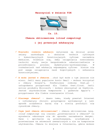 Nauczyciel w świecie TIK Cz. 15. Chmura obliczeniowa (cloud computing) i jej potencjał edukacyjny Kierunki rozwoju edukacji wytyczane są dzisiaj przez zmiany zachodzące z obszarze technik cyfrowych i komunikacyjnych konstruujących cyfrowe narzędzia medialne. Oczekuje się, żeby osiągnięcia nowoczesnej techniki miały swoje bezpośrednie odzwierciedlenie w projektowaniu procesu dydaktyczno-wychowawczego. W rozważaniach nad edukacją wspomaganą cyfrowo bierze się pod uwagę osiągnięcia nauk kognitywnych i wskazania konstruktywizmu. A może jesteś w chmurze...choć być może o tym jeszcze nie wiesz. Jeśli masz popularne konto Gmail - możesz korzystać z chmury Google'a. Preferujesz rodzimy Onet.pl usługodawca przygotował dla Ciebie Onet.Cloud. Jeśli wolisz produkty Microsofu - możesz skorzystać ze OneDrive. Jesteś użytkownikiem komputerów i gadżetów Apple'a przygotowano dla Ciebie rozwiązanie iCloud. Dlaczego chmura? – dawno temu, kiedy powstał Internet i informatycy chcieli przystępnie wytłumaczyć w jaki sposób urządzenia łączą się z siecią posłużyli się rysunkiem chmury. Czym jest chmura obliczeniowa? - chmura obliczeniowa (ang. cloud computing) czy inaczej „przetwarzanie w chmurze” to wyrażenia odnoszące się do sposobu zarządzania danymi. Dane i aplikacje są przechowywane, uruchamiane i przetwarzane na serwerach zewnętrznych a nie na komputerze użytkownika. Chmura to miejsce w Internecie, gdzie możesz 1 przechowywać różnego rodzaju: dokumenty tekstowe, prezentacje, zdjęcia, muzykę, filmy a potem łatwo uzyskać do nich dostęp za pomocą komputera, telefonu, tabletu i innego urządzenia połączonego z Internetem. Dostęp do chmury realizowany jest za pomącą łączy internetowych, a praca zasobami najczęściej odbywa się przez przeglądarkę internetową. Nie musisz kupować żadnych licencji oprogramowania czy instalować kopii zapasowych na swoim komputerze. Chmura to ogromne centra przetwarzania danych. Planowanie pracy w chmurze: -określamy cel (należy zastanowić się po co i dlaczego chcemy korzystać z tego rozwiązania), -określamy zakres usługi – analizujemy dostępne możliwości i jak je możemy wykorzystać; praca w chmurze daje wiele możliwości - niekoniecznie musimy od razu, jednocześnie wdrażać wszystkie jej elementy; pracujmy z kilkoma funkcjonalnościami, żeby poznać pracę w nowym środowisku -wybieramy dostawcę – wiarygodny dostawca powinien zapewnić płynność pracy chmury, czyli zapewnić urządzenia i technologie oraz pełną bieżącą obsługę i pomoc; powinien 2 zapewnić ochronę i bezpieczeństwo danych oraz podążać za innowacjami wprowadzając na bieżąco nowe rozwiązania. Zalety i wady pracy w chmurze: Zalety Wady -mamy dostęp do swoich danych z każdego miejsca -używamy najnowszych wersji aplikacji -aplikacje dostępne w chmurze działają na dowolnym urządzeniu wyposażonym w przeglądarkę internetową (komórka, iPad, laptop, komputer stacjonarny) - jest bezpieczniej(wirusy, programy szpiegowskie, złośliwe oprogramowania) -ograniczenie możliwości w przypadku korzystania z oprogramowania biurowego -ryzyko awarii serwera lub awarii sieci (małe z uwagi na zabezpieczenia) - naruszenie prywatności (daje się zauważyć, że treść maili w usłudze Gmail wpływa na charakter otrzymywanych reklam) -możliwość zmiany zasad działania usługi (nie mamy pewności czy dostawca usługi nie wprowadzi odpłatności za serwis, który wcześniej był bezpłatny) -znacznie większe bezpieczeństwo danych (archiwizacja, kopie danych tworzone automatycznie) -udogodnienie w pracy grupowej(wspólne edytowanie dokumentów, prezentacji, komunikowanie się, dzielenie zadaniami, widać kto i kiedy wprowadził zmiany) -niezależność od systemu operacyjnego - redukcja kosztów (użytkowanie chmury i narzędzi jest darmowe, nie wymaga zakupu drogiego oprogramowania) Dostawcy usług chmurowych – przykłady: Nazwa Opis GG dysk Polski produkt oferujący 5GB powierzchni – miejsce w Internecie , gdzie można przechowywać 3 swoje pliki. Mamy do nich zawsze dostęp, niezależnie gzie się znajdujemy i z jakiego komputera korzystamy. Przy jego pomocy można się dzielić swoimi plikami z innymi osobami. http://www.gg.pl/info/ggdysk Dropbox OneDrive (dawniej SkyDrive) Microsoft Office 365 Usługa świadczona przez firmę Dropbox.Inc. Polegająca na udostępnianiu przestrzeni dyskowej (podstawowa darmowa wersja 2GB)na serwerach formy, Wgrywanie, przeglądanie, pobieranie odbywa się przez zwykłą przeglądarkę lub aplikacje zainstalowana na komputerze. Większą powierzchnię można darmowo zdobywać na różne sposoby np. poprzez połączenie konta z kontem na FB czy Twitterze. http://www.dropbox.com Usługa Microsoftu oferująca 15 GB przestrzeni dyskowej do przechowywania i edytowania plików za pośrednictwem Internetu. Umożliwia współpracę z plikami Microsoftu Office na komputerach PC, Mac, w Internecie http://onedrive.live.com/about/pl-pl Usługa subskrypcji oprogramowania biurowego wzbogacona o usługi w chmurze, zaproponowana bezpłatnie (plan E1) przez Microsoft szkołom i instytucjom edukacyjnym. To zbiór aplikacji i usług dostępnych z serwerów Microsoftu: poczta, kontakty, witryny, kalendarze, Word, Excel, PowerPoint, OneNote, Outlook, przechowywanie i edycje dokumentów online dla personelu, kadry i uczniów. Dostępna jest usługa Sway – tworzenie prostych i szybkich stron WWW (metodą upuśćprzeciągnij) oraz Yammer – wewnętrzny portal społecznościowy danej szkoły. Przydatne może okazać się SharePoint Online – miejsce do tworzenia i udostępniania witryn pracy grupowej(możemy zrobić sobie za jego pomocą wirtualny pokój nauczycielski dostępny po zalogowaniu, albo miejsce pracy wspólnej zespołów uczniowskich. Do dyspozycji mamy również portal wideo tylko dla naszej szkoły – możemy prezentować efekty pracy uczniów np. film, który pows