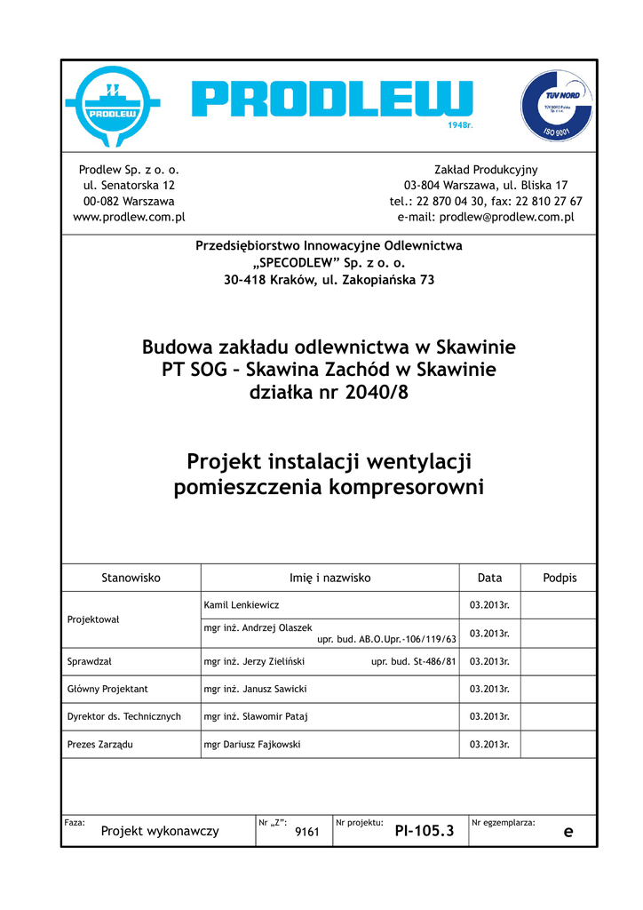 Prodlew Sp. z o. o. ul. Senatorska 12 00-082 Warszawa www.prodlew.com.pl Zakład Produkcyjny 03-804 Warszawa, ul. Bliska 17 tel.: 22 870 04 30, fax: 22 810 27 67 e-mail: [email protected] Przedsiębiorstwo Innowacyjne Odlewnictwa „SPECODLEW” Sp. z o. o. 30-418 Kraków, ul. Zakopiańska 73 Budowa zakładu odlewnictwa w Skawinie PT SOG – Skawina Zachód w Skawinie działka nr 2040/8 Projekt instalacji wentylacji pomieszczenia kompresorowni Stanowisko Imię i nazwisko Data Kamil Lenkiewicz Projektował 03.2013r. mgr inż. Andrzej Olaszek upr. bud. AB.O.Upr.-106/119/63 mgr inż. Jerzy Zieliński Główny Projektant mgr inż. Janusz Sawicki 03.2013r. Dyrektor ds. Technicznych mgr inż. Sławomir Pataj 03.2013r. Prezes Zarządu mgr Dariusz Fajkowski 03.2013r. Projekt wykonawczy Nr „Z”: 9161 upr. bud. St-486/81 03.2013r. Sprawdzał Faza: Podpis Nr projektu: PI-105.3 03.2013r. Nr egzemplarza: e Projekt instalacji wentylacji pomieszczenia kompresorowni PI-105.3 Strona 2z6 Zawartość projektu 1 2 3 4 PODSTAWA OPRACOWANIA......................................................................................................................... 3 ZAKRES OPRACOWANIA.............................................................................................................................. 3 UWAGI OGÓLNE........................................................................................................................................... 3 OPIS PROJEKTOWANYCH ROZWIĄZAŃ....................................................................................................... 3 4.1 Założenia projektowe......................................................................................................................... 3 4.2 Projektowane rozwiązania................................................................................................................. 3 4.2.1 Założenia obliczeniowe..............................................................................................................................4 4.2.2 Opis projektowanych rozwiązań.............................................................................................................4 4.2.3 Wytyczne wykonania i eksploatacji instalacji.....................................................................................6 4.2.4 Wytyczne międzybranżowe.......................................................................................................................6 4.2.4.1 Wytyczne budowlane........................................................................................................................................ 6 4.3 Uwagi końcowe................................................................................................................................... 6 Spis rysunków 1 INSTALACJA WENTYLACJI MECHANICZNEJ POMIESZCZENIA KOMPRESOROWNI .................... PI-105.3.1 Projekt instalacji wentylacji pomieszczenia kompresorowni PI-105.3 Strona 3z6 Opis techniczny 1 Podstawa opracowania • Umowa z Inwestorem nr 04/TTP/9161/10 z dnia 12 czerwca 2010 roku. • Projekt budowlany (nr arch. PB-131) z 2012 roku, wykonany przez Prodlew Sp. z o. o. • Rozporządzenie Ministra Infrastruktury z dnia 12 kwietnia 2002 roku (z późniejszymi zmianami) w sprawie warunków technicznych, jakim powinny odpowiadać budynki i ich usytuowanie. • Normy i normatywy techniczne projektowania. • Uzgodnienia branżowe. • Wytyczne Inwestora. • Wytyczne dostawcy kompresorów. 2 Zakres opracowania Opracowanie niniejsze jest projektem wykonawczym rozwiązań w zakresie instalacji wentylacji mechanicznej pomieszczenia kompresorowni zlokalizowanego w hali projektowanej odlewni. 3 Uwagi ogólne Wszelkie zmiany w projekcie wymagają pisemnej zgody jego autora. Dokonywanie na etapie wykonawczym samowolnych odstępstw od rozwiązań opisanych w niniejszym opracowaniu może spowodować zdjęcie z Projektanta odpowiedzialności za prawidłową pracę instalacji. W przypadku zmiany urządzeń może zaistnieć konieczność wykonania dokumentacji zamiennej. 4 Opis projektowanych rozwiązań 4.1 Założenia projektowe Objęte niniejszym opracowaniem pomieszczenie zlokalizowane będzie w hali odlewni w pobliżu słupa 10-F. Pomieszczenie to ma jedną ścianę wspólną z zewnętrzną ścianą hali produkcyjnej. W pomieszczeniu znajdować się będą dwa kompresory sprężonego powietrza. 4.2 Projektowane rozwiązania Pomieszczenie będzie miało zapewnioną wentylację mechaniczną wywiewną. Powietrze będzie usuwane z pomieszczenia przez kompresory. Powietrze świeże dostarczane będzie za pośrednictwem czerpni powietrza zlokalizowanej w przegrodzie zewnętrznej pomieszczenia. Szczegóły rozwiązania według projektu architektoniczno-budowlanego Projekt instalacji wentylacji pomieszczenia kompresorowni PI-105.3 Strona 4z6 o numerze PB-164 wykonanym przez frmę Prodlew Sp. z o. o. Instalację projektuje się według założeń dostawcy kompresorów – frmy CompAir Polska Sp. z o. o. z siedzibą w Krakowie przy ulicy Pachońskiego 65, zarejestrowanej w KRS pod numerem 0000000940963. 4.2.1 Założenia obliczeniowe Ilość powietrza usuwana przez kompresor L 110: 120375 m3/h Ilość powietrza usuwana przez kompresor L 55: 6140 m3/h 4.2.2 Opis projektowanych rozwiązań Powietrze pobierane będzie z pomieszczenia przez kompresory i usuwane odpowiednio instalacją W7 przez kompresor L 110 oraz instalacją W8 przez kompresor L 55. Instalacja W7 pozwala na usuwanie powietrza do atmosfery poprzez wyrzutnię dachową w okresie letnim, a także do hali produkcyjnej poprzez wyrzutnię ścienną w okresie zimowym. Wybór sposobu wywiewu powietrza z pomieszczenia realizowany będzie poprzez odpowiednie ustawienie przepustnic zlokalizowanych na kanałach wywiewnych. Instalacją W8 powietrze będzie usuwane do atmosfery poprzez wyrzutnię dachową zlokalizowaną na dachu hali. Powietrze świeże dostarczane będzie za pośrednictwem c