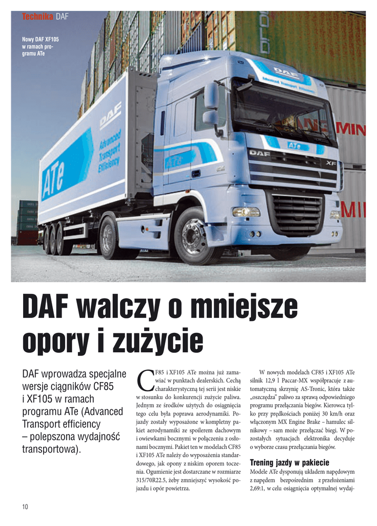 Technika DAF Nowy DAF XF105 w ramach programu ATe DAF walczy o mniejsze opory i zużycie DAF wprowadza specjalne wersje ciągników CF85 i XF105 w ramach programu ATe (Advanced Transport efficiency – polepszona wydajność transportowa). 10 C F85 i XF105 ATe można już zamawiać w punktach dealerskich. Cechą charakterystyczną tej serii jest niskie w stosunku do konkurencji zużycie paliwa. Jednym ze środków użytych do osiągnięcia tego celu była poprawa aerodynamiki. Pojazdy zostały wyposażone w kompletny pakiet aerodynamiki ze spoilerem dachowym i owiewkami bocznymi w połączeniu z osłonami bocznymi. Pakiet ten w modelach CF85 i XF105 ATe należy do wyposażenia standardowego, jak opony z niskim oporem toczenia. Ogumienie jest dostarczane w rozmiarze 315/70R22.5, żeby zmniejszyć wysokość pojazdu i opór powietrza. W nowych modelach CF85 i XF105 ATe silnik 12,9 l Paccar-MX współpracuje z automatyczną skrzynię AS-Tronic, która także „oszczędza” paliwo za sprawą odpowiedniego programu przełączania biegów. Kierowca tylko przy prędkościach poniżej 30 km/h oraz włączonym MX Engine Brake – hamulec silnikowy – sam może przełączać biegi. W pozostałych sytuacjach elektronika decyduje o wyborze czasu przełączania biegów. Trening jazdy w pakiecie Modele ATe dysponują układem napędowym z napędem bezpośrednim z przełożeniami 2,69:1, w celu osiągnięcia optymalnej wydaj- ności paliwowej. Poza tym opcjonalnie dostępna jest wersja z przełożeniem 2,53:1 dla lekkiego transportu i lekkich zastosowań. Modele ATe są dostarczane z tempomatem adaptacyjnym, który również przyczynia się do obniżenia zużycia paliwa. Biorąc pod uwagę, że proces oszczędzania paliwa wymaga biegłego wykorzystania możliwości linii modeli ATe, DAF proponuje w pakiecie do wszystkich modeli trening jazdy DAFEcoDriver. Ten rodzaj treningu trwale redukuje rzeczywiste zużycie paliwa oraz emisję dwutlenku węgla, przeciętnie o 3-5 procent. Nowe modele CF85 i XF105 ATe jako część programu ATe zawierają pakiet inteligentnych rozwiązań, które przyczyniają się do dalszej redukcji zużycia paliwa i emisji dwutlenku węgla, a przez to zwiększają wydajność pojazdu ciężarowego. Silniki w modelach ATe po pięciu minutach na wolnym biegu automatycznie przełączają bieg, a fabrycznie ustawiona prędkość maksymalna ograniczona jest na 85 km/h zamiast na 89, w celu obniżenia o 2-3 procent zużycia paliwa i emisji dwutlenku węgla. Kierowca non stop jest informowany o chwilowym i średnim zużyciu paliwa poprzez dane edytowane teraz na głównym wyświetlaczu deski rozdzielczej. Polepszone prowadzenie powietrza Modele CF85 i XF105 ATe są wyposażone w silnik 12,9 l Paccar MX o mocy 460 KM (340 kW). W ofercie jest także superekologiczna wersja EEV. W tym silniku wprowadzono w ostatnim czasie szereg nowinek technicznych, wpływających na mniejsze zużycie paliwa – nowe tłoki i pierścienie tłokowe, zmniejszające tarcie, a zwiększające wydajność silnika. Zoptymalizowano także system wtrysku paliwa i smarowania olejem oraz zmodyfikowano system zarządzania silnikiem. DAF jest pierwszym producentem pojazdów ciężarowych, który stosuje izolację nie tylko przy turbosprężarce, lecz także przy kolektorze wydechowym. – Ta ważna i nowatorska modyfikacja daje najwięcej korzyści przy częściowym obciążeniu silnika, czyli w sytuacji normalnego użytkowania jed- nostki napędowej. Najważniejszą zmianą jest to, że przy niższym obciążeniu silnika temperatura gazów spalinowych, napędzających łopatki turbiny, jest większa. Przy tym samym obciążeniu uzyskujemy jakby większe obroty turbosprężarki, czyli poprawiamy współczynnik napełniania cylindrów, a w efekcie proces spalania mieszanki jest bardziej wydajny. Poprzez tę modyfikację odrobinę zredukowano ilość wtryskiwanego AdBlue. W sumie wszystkie zmiany zastosowane w tym silniku dają 3-4% redukcji zużycia paliwa – tłumaczy Zbigniew Kołodziejek, szef marketingu DAF Trucks Polska. – Samochód wyposażony jest w skrzynię AS TRONIC, 12-biegową, z biegiem bezpośrednim. Zostały opracowane nowe pochwy mostów napędowych. Jest w nich nieco niższy poziom oleju, mniejsze opory wewnętrzne – dodaje Zbigniew Kołodziejek. Modyfikacje w silniku dają wymierne korzyści podczas eksploatacji – o około 3-4 procent jest mniejsze zużycie paliwa i emisja dwutlenku węgla. DAF dostarcza ciągniki 4x2 typu CF85 i XF105 ATe w połączeniu z przestronną kabiną Space Cab. Ger 11