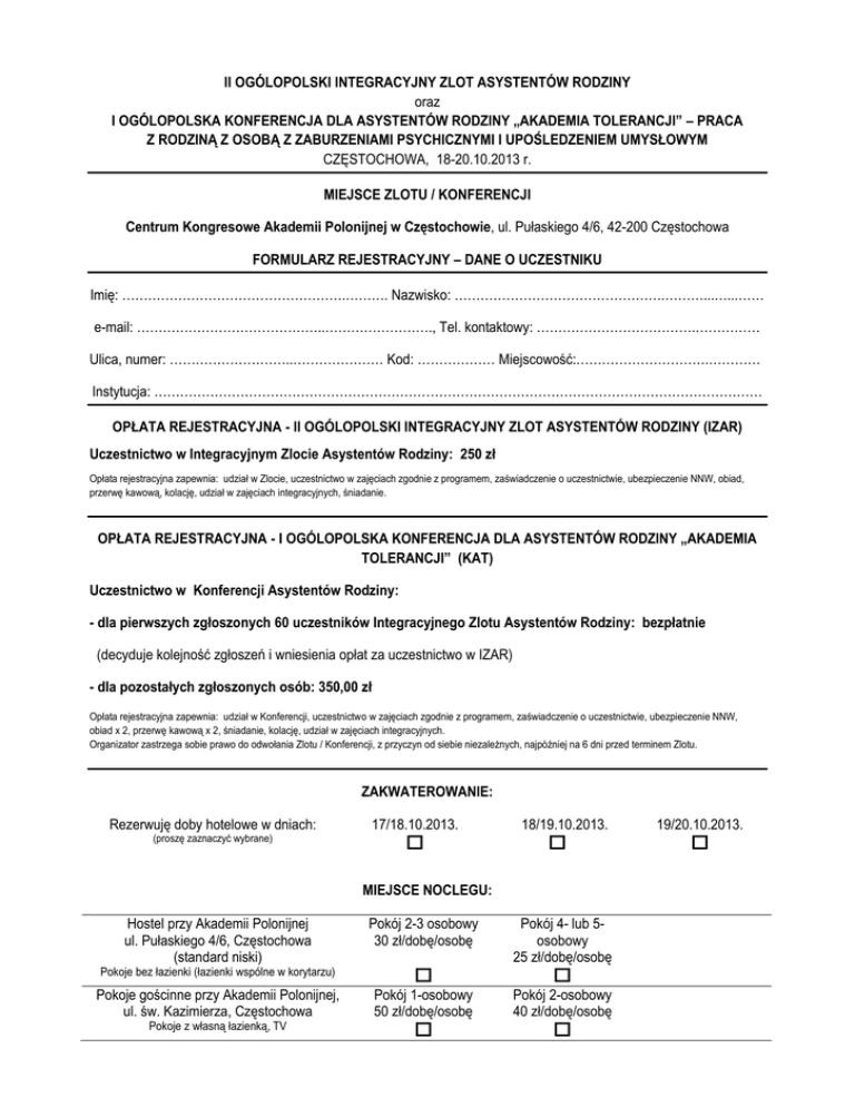 II OGÓLOPOLSKI INTEGRACYJNY ZLOT ASYSTENTÓW RODZINY oraz I OGÓLOPOLSKA KONFERENCJA DLA ASYSTENTÓW RODZINY „AKADEMIA TOLERANCJI” – PRACA Z RODZINĄ Z OSOBĄ Z ZABURZENIAMI PSYCHICZNYMI I UPOŚLEDZENIEM UMYSŁOWYM CZĘSTOCHOWA, 18-20.10.2013 r. MIEJSCE ZLOTU / KONFERENCJI Centrum Kongresowe Akademii Polonijnej w Częstochowie, ul. Pułaskiego 4/6, 42-200 Częstochowa FORMULARZ REJESTRACYJNY – DANE O UCZESTNIKU Imię: …………………………………………….………. Nazwisko: ………………………………………….………...…...…… e-mail: ……………………………………..……………………., Tel. kontaktowy: ……………………………….…………… Ulica, numer: ………………………..………………… Kod: ……………… Miejscowość:………………………….………… Instytucja: …………………………………………………………………………………………………………………………… OPŁATA REJESTRACYJNA - II OGÓLOPOLSKI INTEGRACYJNY ZLOT ASYSTENTÓW RODZINY (IZAR) Uczestnictwo w Integracyjnym Zlocie Asystentów Rodziny: 250 zł Opłata rejestracyjna zapewnia: udział w Zlocie, uczestnictwo w zajęciach zgodnie z programem, zaświadczenie o uczestnictwie, ubezpieczenie NNW, obiad, przerwę kawową, kolację, udział w zajęciach integracyjnych, śniadanie. OPŁATA REJESTRACYJNA - I OGÓLOPOLSKA KONFERENCJA DLA ASYSTENTÓW RODZINY „AKADEMIA TOLERANCJI” (KAT) Uczestnictwo w Konferencji Asystentów Rodziny: - dla pierwszych zgłoszonych 60 uczestników Integracyjnego Zlotu Asystentów Rodziny: bezpłatnie (decyduje kolejność zgłoszeń i wniesienia opłat za uczestnictwo w IZAR) - dla pozostałych zgłoszonych osób: 350,00 zł Opłata rejestracyjna zapewnia: udział w Konferencji, uczestnictwo w zajęciach zgodnie z programem, zaświadczenie o uczestnictwie, ubezpieczenie NNW, obiad x 2, przerwę kawową x 2, śniadanie, kolację, udział w zajęciach integracyjnych. Organizator zastrzega sobie prawo do odwołania Zlotu / Konferencji, z przyczyn od siebie niezależnych, najpóźniej na 6 dni przed terminem Zlotu. ZAKWATEROWANIE: Rezerwuję doby hotelowe w dniach: (proszę zaznaczyć wybrane) 17/18.10.2013. 18/19.10.2013. MIEJSCE NOCLEGU: Hostel przy Akademii Polonijnej ul. Pułaskiego 4/6, Częstochowa (standard niski) Pokój 2-3 osobowy 30 zł/dobę/osobę Pokoje bez łazienki (łazienki wspólne w korytarzu) Pokoje gościnne przy Akademii Polonijnej, ul. św. Kazimierza, Częstochowa Pokój 1-osobowy 50 zł/dobę/osobę Pokoje z własną łazienką, TV Pokój 4- lub 5osobowy 25 zł/dobę/osobę Pokój 2-osobowy 40 zł/dobę/osobę 19/20.10.2013. Pokoje gościnne „Pod klasztorem” ul. św. Barbary 13, Częstochowa Pokój 1-osobowy 70 zł/dobę/osobę Pokój 3-osobowy 50 zł/dobę/osobę Pokoje z własną łazienką, TV, Wi-Fi, własny parking Pokój 2-osobowy 50 zł/dobę/osobę Hotel SEKWANA, ul. Wieluńska 24, Częstochowa Pokój 1-osobowy 110zł/dobę/osobę Pokój 2-osobowy 65 zł/dobę/osobę Pokój 3-osobowy 55 zł/dobę/osobę Pokoje z łazienką, TV, Wi-Fi, własny parking UWAGA: Warunkiem przyjęcia rezerwacji jest przesłanie do 10.10.2013 na konto organizatora Zlotu/Konferencji pełnej opłaty hotelowej. W przypadku wyczerpania miejsc rezerwowanych w danym hostelu/hotelu organizator zastrzega sobie możliwość zaproponowania innego hostelu/hotelu. ZLOT/KONFERENCJA Wartość opłaty rejestracyjnej IZAR: ………..………… zł Wartość opłaty rejestracyjnej KAT: ..………………… zł Wartość rezerwacji noclegów: ..………………… zł Opłatę rejestracyjną prosimy przesłać najpóźniej do dnia 10 października 2013 r. na konto: Stowarzyszenie Pomocy Osobom z Zaburzeniami Psychicznymi i Ich Rodzinom „YAVA” ul. Lakowa 101, 42-280 Częstochowa Numer rachunku: 36 1440 1387 0000 0000 1368 1929 Razem do zapłaty: ….………………… zł W polu tytułem prosimy o wpisanie informacji: IZAR/KAT 18-20.10.2013 + imię i nazwisko uczestnika Wszystkie ceny zawierają podatek VAT. W przypadku rezygnacji z uczestnictwa w Zlocie / Konferencji do 14.10.2013 r. zwracamy 100% opłat (rezygnację z uczestnictwa należy przesłać mailowo na adres: [email protected], lub faksem na numer 34 34 387 12 39). W razie rezygnacji dokonanej od 14.10.2013 r. do 16.10.2013 r., zwracamy 50% opłaty rejestracyjnej i 80% opłaty za nocleg. W przypadku rezygnacji dokonanej po 16.10.2013 r. nie przewidujemy zwrotów. OŚWIADCZENIE Upoważniam Stowarzyszenie Pomocy Osobom z Zaburzeniami Psychicznymi i Ich Rodzinom „YAVA” ul. Lakowa 101, 42-280 Częstochowa, do wystawienia faktury VAT za koszty uczestnictwa w Zlocie / Konferencji bez podpisu odbiorcy dla: Nazwa płatnika: ………………………………………………………………………..………………………………………… Adres: ……………………………………………………………………………………………………………………………… Numer NIP: …………………………………………………………….. pieczęć firmy podpis i pieczęć osoby upoważnionej Data: …………………………… Uwagi:……………………………………………………………………………………………………………………………… OŚWIADCZENIE: Wyrażam zgodę na wykorzystywanie moich danych osobowych w zakresie przesyłania informacji organizacyjnych IZAR i KAT 2013 oraz informacji o innych organizowanych szkoleniach i konferencjach. Podpis osoby wypełniającej formularz rejestracyjny: ……………………………………………………………………… WYPEŁNIONY FORMULARZ REJESTRACYJNY PROSIMY ODESŁAĆ: e-mail: [email protected] faks: 34 387 12 39 Polski Instytut Mediacji i Integracji Społecznej, BIURO: Al. Wojska Polskiego 124 lok. 3, 42-207 Częstochowa