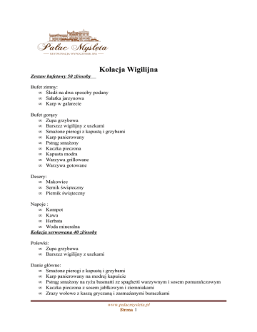 Kolacja Wigilijna Zestaw bufetowy 50 zł/osoby Bufet zimny: • Śledź na dwa sposoby podany • Sałatka jarzynowa • Karp w galarecie Bufet gorący • Zupa grzybowa • Barszcz wigilijny z uszkami • Smażone pierogi z kapustą i grzybami • Karp panierowany • Pstrąg smażony • Kaczka pieczona • Kapusta modra • Warzywa grillowane • Warzywa gotowane Desery: • Makowiec • Sernik świąteczny • Piernik świąteczny Napoje : • Kompot • Kawa • Herbata • Woda mineralna Kolacja serwowana 40 zł/osoby Polewki: • Zupa grzybowa • Barszcz wigilijny z uszkami Danie główne: • Smażone pierogi z kapustą i grzybami • Karp panierowany na modrej kapuście • Pstrąg smażony na ryżu basmatti ze spaghetti warzywnym i sosem pomarańczowym • Kaczka pieczona z sosem jabłkowym i ziemniakami • Zrazy wołowe z kaszą gryczaną i zasmażanymi buraczkami www.palacmysleta.pl Strona 1 Desery: • Makowiec • Sernik świąteczny • Piernik świąteczny www.palacmysleta.pl Strona 2