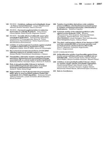VOL. 129 REVIEW Cytokines, epilepsy and antiepileptic drugs is there a mutual influence? Justyna M³odzikowska- Albrecht, Barbara Steinborn, Marcin ¯arowski 139 150 REVIEW Hormonal supplementation in endocrine dysfunction in critically ill patients. Anna Du³awa, £ukasz Bu³dak, Robert Krysiak, Bogus³aw Okopieñ REVIEW Versatile effects of sildenafil: recent phar- macological applications. Subramaniam Uthayathas, Senthilkumar S. Karuppagounder, Bessy M. Thrash, Kodeeswaran Parameshwaran, Vishnu Suppiramaniam, Muralikrishnan Dhanasekaran 164 Inhibitor of cyclooxygenase-2 protects against amyloid > peptide-evoked memory impairment in mice. Magdalena C¹ka³a, Anna R. Malik, Joanna B. Strosznajder 173 Neurochemical and behavioral effects of 8-OH-DPAT following exposure to restraint stress in rats. Noreen Samad, Farhat Batool, Darakhshan J. Haleem 181 Theophylline, adenosine receptor antagonist prevents behavioral, biochemical and neurochemical changes associated with an animal model of tardive dyskinesia. Mahendra Bishnoi, Kanwaljit Chopra, Shrinivas K. Kulkarni 192 Role of phosphoinositide 3-kinase in ischemic postconditioning-induced attenuation of cerebral ischemia-evoked behavioral deficits in mice. Ashish K. Rehni, Nirmal Singh 199 Polymorphism in the P-glycoprotein drug transporter MDR1 gene in renal transplant patients treated with cyclosporin A in a Polish population. Katarzyna Kotrych, Tadeusz Sulikowski, Leszek Domañski, Monika Bia³ecka, Marek Drodzik 59 NUMBER 2 2007 206 Toxicity of pyrimidine derivatives under oxidative stress conditions: chemiluminescence-based assays in systems containing erythrocytes, mitochondria or blood plasma. Waldemar Sajewicz 216 Cytotoxic activity of the selected pyridinium salts against murine leukemia L1210. Marzena Wieczorkowska, Piotr Szajerski, Rados³aw Michalski, Jan Adamus, Andrzej Marcinek, Jerzy Gêbicki, Ewa Ciesielska , Leszek Szmigiero, Ewa Lech-Marañda, Anna Szmigielska-Kap³on, Tadeusz Robak 224 The short- and long-term effects of two isomers of DDT and their metabolite DDE on hormone secretion and survival of human choriocarcinoma JEG-3 cells. Anna K. Wójtowicz, Katarzyna Augustowska, Ewa £. Gregoraszczuk SHORT COMMUNICATIONS 233 Antiproliferative activity of parthenolide against three human cancer cell lines and human umbilical vein endothelial cells. Jolanta Parada-Turska, Roman Paduch, Maria Majdan, Martyna Kandefer-Szerszeñ, Wojciech Rzeski 238 Inhibitors of phosphatidylinositide 3-kinase: effects on reactive oxygen species and platelet aggregation. Sheikh Arshad Saeed, John Dennis Connor, Imran, Javeria Quadri, Shumaila Tasneem, Sagheer Ahmed, Muhammad Ahmed Mesaik, Muhammad Iqbal Choudhary 244 Note to Contributors