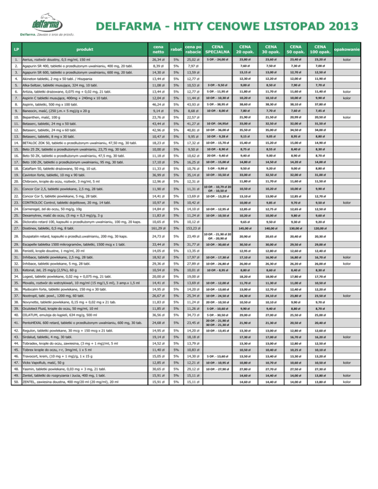 DELFARMA - HITY CENOWE LISTOPAD 2013 LP produkt cena netto rabat cena po CENA rabacie SPECJALNA CENA 20 opak. CENA 30 opak. CENA 50 opak. CENA opakowanie 100 opak. 1. Aerius, roztwór doustny, 0,5 mg/ml, 150 ml 26,34 zł 5% 25,02 zł 23,80 zł 23,60 zł 23,40 zł 23,20 zł 2. Agapurin SR 400, tabletki o przedłużonym uwalnianiu, 400 mg, 20 tabl. 8,39 zł 5% 7,97 zł 7,60 zł 7,50 zł 7,30 zł 7,00 zł 3. Agapurin SR 600, tabletki o przedłużonym uwalnianiu, 600 mg, 20 tabl. 14,30 zł 5% 13,59 zł 13,15 zł 13,00 zł 12,70 zł 12,50 zł 4. Akineton tabletki, 2 mg x 50 tabl. / Hiszpania 13,44 zł 5% 12,77 zł 12,30 zł 12,20 zł 12,00 zł 11,90 zł 5. Alka-Seltzer, tabletki musujące, 324 mg, 10 tabl. 11,08 zł 5% 10,53 zł 3 OP. - 9,50 zł 9,00 zł 8,50 zł 7,90 zł 7,70 zł 6. Artizia, tabletki drażowane, 0,075 mg + 0,02 mg, 21 tabl. 13,44 zł 5% 12,77 zł 5 OP. - 11,95 zł 11,80 zł 11,70 zł 11,60 zł 11,40 zł kolor 7. Aspirin C tabletki musujące, 400mg + 240mg x 10 tabl. 12,04 zł 5% 11,44 zł 10 OP. - 10,30 zł 10,20 zł 10,10 zł 10,00 zł 9,90 zł kolor 8. Aspirin, tabletki, 500 mg x 100 tabl. 46,24 zł 5% 43,93 zł 5 OP. - 38,95 zł 38,60 zł 38,30 zł 38,10 zł 37,80 zł 10 OP. - 8,00 zł 9. Baneocin, maść, (250 j.m.+ 5 mg)/g x 20 g 9,14 zł 5% 8,68 zł 10. Bepanthen, maść, 100 g 23,76 zł 5% 22,57 zł 11. Betaserc, tabletki, 24 mg x 50 tabl. 43,44 zł 5% 41,27 zł 12. Betaserc, tabletki, 24 mg x 60 tabl. 42,96 zł 5% 13. Betaserc, tabletki, 8 mg x 30 tabl. 10,47 zł 5% 14. BETALOC ZOK 50, tabletki o przedłużonym uwalnianiu, 47,50 mg, 30 tabl. 18,23 zł 5% 15. Beto 25 ZK, tabletki o przedłużonym uwalnianiu, 23,75 mg, 30 tabl. 10,00 zł 16. Beto 50 ZK, tabletki o przedłużonym uwalnianiu, 47,5 mg, 30 tabl. 11,18 zł 17. Beto 100 ZK, tabletki o przedłużonym uwalnianiu, 95 mg, 30 tabl. 18. 19. 5 OP. - 24,00 zł kolor 7,80 zł 7,70 zł 7,60 zł 7,45 zł 21,90 zł 21,50 zł 20,99 zł 20,50 zł 10 OP. -34,95zł 33,00 zł 32,50 zł 32,00 zł 31,50 zł 40,81 zł 10 OP. - 36,00 zł 35,50 zł 35,00 zł 34,50 zł 34,00 zł 9,95 zł 10 OP. - 9,28 zł 9,15 zł 9,05 zł 8,95 zł 8,80 zł 17,32 zł 10 OP. - 15,70 zł 15,40 zł 15,20 zł 15,00 zł 14,90 zł 5% 9,50 zł 10 OP. - 8,90 zł 8,75 zł 8,55 zł 8,40 zł 8,30 zł 5% 10,62 zł 20 OP. - 9,40 zł 9,40 zł 9,00 zł 8,90 zł 8,70 zł 17,10 zł 5% 16,25 zł 10 OP. - 15,00 zł 14,80 zł 14,50 zł 14,20 zł 14,00 zł Cataflam 50, tabletki drażowane, 50 mg, 10 szt. 11,33 zł 5% 10,76 zł 5 OP. - 9,99 zł 9,50 zł 9,20 zł 9,00 zł 8,80 zł Cavinton forte, tabletki, 10 mg x 90 tabl. 36,99 zł 5% 35,14 zł 10 OP. - 33,50 zł 33,00 zł 32,50 zł 32,00 zł 31,00 zł 20. Chibroxin, krople do oczu, roztwór, 3 mg/ml, 5 ml 12,96 zł 5% 12,31 zł 11,80 zł 11,70 zł 11,60 zł 11,50 zł 21. Concor Cor 2,5, tabletki powlekane, 2,5 mg, 28 tabl. 11,90 zł 5% 11,31 zł 10 OP. - 10,79 zł 20 OP. - 10,50 zł 10,50 zł 10,20 zł 10,00 zł 9,90 zł 22. Concor Cor 5, tabletki powlekane, 5 mg, 28 tabl. 14,41 zł 5% 13,69 zł 10 OP. - 13,20 zł 13,10 zł 13,00 zł 12,85 zł 12,70 zł 23. CONTROLOC Control, tabletki dojelitowe, 20 mg, 14 tabl. 10,97 zł 5% 10,42 zł 10,00 zł 9,85 zł 9,70 zł 9,50 zł 24. Corneregel, żel do oczu, 50 mg/g, 10g 14,84 zł 5% 14,10 zł 10 OP. - 12,95 zł 12,85 zł 12,75 zł 12,65 zł 12,50 zł 25. Dexamytrex, maść do oczu, (5 mg + 0,3 mg)/g, 3 g 11,83 zł 5% 11,24 zł 10 OP. - 10,50 zł 10,20 zł 10,00 zł 9,80 zł 9,60 zł 26. Dicloratio retard 100, kapsułki o przedłużonym uwalnianiu, 100 mg, 20 kaps. 10,65 zł 5% 10,12 zł 9,65 zł 9,50 zł 9,30 zł 9,20 zł 27. Dostinex, tabletki, 0,5 mg, 8 tabl. 161,29 zł 5% 153,23 zł 145,00 zł 140,00 zł 130,00 zł 120,00 zł 28. Duspatalin retard, kapsułki o przedłuż.uwalnianiu, 200 mg, 30 kaps. 24,73 zł 5% 23,49 zł 10 OP. - 21,90 zł 20 OP. - 20,90 zł 20,90 zł 20,65 zł 20,40 zł 20,30 zł 29. Escapelle tabletka 1500 mikrogramów, tabletki, 1500 mcg x 1 tabl. 33,44 zł 5% 31,77 zł 10 OP. - 30,60 zł 30,50 zł 30,00 zł 29,50 zł 29,00 zł 30. Fenistil, krople doustne, 1 mg/ml, 20 ml 14,05 zł 5% 13,35 zł 12,95 zł 12,80 zł 12,60 zł 12,40 zł 31. Inhibace, tabletki powlekane, 2,5 mg, 28 tabl. 18,92 zł 5% 17,97 zł 10 OP. - 17,30 zł 17,10 zł 16,90 zł 16,80 zł 16,70 zł kolor 32. Inhibace, tabletki powlekane, 5 mg, 28 tabl. 29,36 zł 5% 27,89 zł 10 OP. - 26,80 zł 26,00 zł 26,30 zł 26,20 zł 26,00 zł kolor 33. Ketonal, żel, 25 mg/g (2,5%), 60 g 10,54 zł 5% 10,01 zł 10 OP. - 8,95 zł 8,80 zł 8,60 zł 8,40 zł 8,30 zł 34. Logest, tabletki powlekane, 0,02 mg + 0,075 mg, 21 tabl. 20,00 zł 5% 19,00 zł 18,20 zł 18,00 zł 17,80 zł 17,70 zł 35. Movalis, roztwór do wstrzykiwań, 10 mg/ml (15 mg/1,5 ml), 3 amp.x 1,5 ml 14,41 zł 5% 13,69 zł 10 OP. - 12,00 zł 11,70 zł 11,30 zł 11,00 zł 10,50 zł 36. Mydocalm forte, tabletki powlekane, 150 mg x 30 tabl. 14,95 zł 5% 14,20 zł 10 OP. - 13,60 zł 13,00 zł 12,70 zł 12,40 zł 12,20 zł 37. Nootropil, tabl. powl., 1200 mg, 60 tabl. 26,67 zł 5% 25,34 zł 10 OP. - 24,50 zł 24,30 zł 24,10 zł 23,80 zł 23,50 zł 38. Novynette, tabletki powlekane, 0,15 mg + 0,02 mg x 21 tab. 11,83 zł 5% 11,24 zł 20 OP. - 10,50 zł 10,50 zł 10,10 zł 9,90 zł 9,70 zł 39. Oculotect Fluid, krople do oczu, 50 mg/ml, 10 ml 11,85 zł 5% 11,26 zł 5 OP. - 10,60 zł 9,90 zł 9,40 zł 8,80 zł 8,70 zł 40. OILATUM, emulsja do kąpieli, 634 mg/g, 500 ml 36,56 zł 5% 34,73 zł 5 OP. - 30,50 zł 29,00 zł 27,00 zł 25,50 zł 25,00 zł 41. PentoHEXAL 600 retard, tabletki o przedłużonym uwalnianiu, 600 mg, 30 tab. 24,68 zł 5% 23,45 zł 20 OP. - 21,90 zł 30 OP. - 21,30 zł 21,90 zł 21,30 zł 20,50 zł 20,40 zł 42. Regulon, tabletki powlekane, 30 mcg + 150 mcg x 21 tabl. 14,95 zł 5% 14,20 zł 10 OP. - 13,45 zł 13,30 zł 13,00 zł 12,80 zł 12,60 zł 43. Sirdalud, tabletki, 4 mg, 30 tabl. 19,14 zł 5% 18,18 zł 17,30 zł 17,00 zł 16,70 zł 16,20 zł 44. Tobradex, krople do oczu, zawiesina, (3 mg + 1 mg)/ml, 5 ml 14,52 zł 5