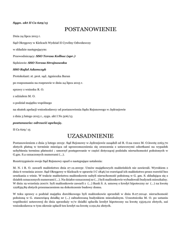 Sygn. akt II Ca 629/15 POSTANOWIENIE Dnia 24 lipca 2015 r. Sąd Okręgowy w Kielcach Wydział II Cywilny Odwoławczy w składzie następującym: Przewodniczący: SSO Teresa Kołbuc (spr.) Sędziowie: SSO Teresa Strojnowska SSO Rafał Adamczyk Protokolant: st. prot. sąd. Agnieszka Baran po rozpoznaniu na rozprawie w dniu 24 lipca 2015 r. sprawy z wniosku R. O. z udziałem M. O. o podział majątku wspólnego na skutek apelacji wnioskodawcy od postanowienia Sądu Rejonowego w Jędrzejowie z dnia 3 lutego 2015 r., sygn. akt I Ns 506/13 postanawia: odrzucić apelację. II Ca 629/ 15 UZASADNIENIE Postanowieniem z dnia 3 lutego 2015r. Sąd Rejonowy w Jędrzejowie zasądził od R. O.na rzecz M. O.kwotę 2163,70 złotych płatną w terminie miesiąca od uprawomocnienia się orzeczenia z ustawowymi odsetkami na wypadek uchybienia terminu płatności ; umorzył postępowanie w części dotyczącej podziału nieruchomości położonych w G.gm. S.a oznaczonych numerami (...). Rozstrzygniecie swoje Sąd Rejonowy oparł o następujące ustalenia: M. N. i R. O. zawarli małżeństwo dnia 27.12.2003r. Umów majątkowych małżeńskich nie zawierali. Wyrokiem z dnia 6 września 2010r. Sąd Okręgowy w Kielcach w sprawie I C 1846/10 rozwiązał ich małżeństwo przez rozwód bez orzekania o winie. W trakcie małżeństwa małżonkowie nabyli nieruchomość położoną w G. gm. S. składająca się z działek oznaczonych numerami (...). Na działce oznaczonej nr (...) byli małżonkowie wybudowali budynek mieszkalny. W dniu 19 września 2007r. byli małżonkowie zawarli z (...) Bank S. A. umowę o kredyt hipoteczny nr (...) na kwotę 122839,89 złotych przeznaczeniem na dokończenie budowy domu. W toku sprawy o podział majątku dorobkowego byli małżonkowie sprzedali w dniu 8.07.2014r. nieruchomość położoną w G. stanowiącą działkę nr (...) zabudowaną budynkiem mieszkalnym. Uczestniczka M. O. po ustaniu wspólności ustawowej do dnia sprzedaży w/w działki spłaciła kredyt hipoteczny na kwotę 15519,02 złotych, zaś wnioskodawca w tym okresie spłacił ten kredyt na kwotę 11191,62 złotych. W dniu 28.05.2014r. wnioskodawca i uczestniczka dokonali umownego częściowego podziału majątku dorobkowego w ten sposób, że nieruchomość położona w G.i oznaczona nr (...) przypadła na wyłączną własność uczestniczki. W czasie trwania małżeństwa wnioskodawca bez wiedzy i zgody uczestniczki zawarł umowy pożyczki gotówkowej: - w dniu 2.04.2008r. w (...) Banku S. A. na kwotę 40560,87 złotych, - w dniu 5.06.2008r. w (...) Banku S. A. na kwotę 12001,88 złotych, - w dniu 23.09.2008r. w (...) Banku S. A. na kwotę 7891,88 złotych. Pieniądze z tych pożyczek przeznaczył na własne potrzeby. Po rozwodzie wnioskodawca spłacił: - pożyczkę z dnia 2.04.2008r. w kwocie 24600 złotych, - pożyczkę z dnia 5.06.2008r. w kwocie 5008,22 złote, - pożyczkę z dnia 23.09.2008r. w kwocie 3641,80 złotych. W tak ustalonym stanie faktycznym Sąd Rejonowy uznał wniosek o podział majątku wspólnego za zasadny. Wobec cofnięcia wniosku o podział majątku w przedmiocie nieruchomości stanowiących działki oznaczone nr (...) Sąd Rejonowy umorzył postępowanie na podstawie art. 355 k.p.c. w zw. Z art. 13 § 2 k.p.c. Sąd uznał za zasadne rozliczenie kwot spłaconych przez wnioskodawcę i uczestniczkę po ustaniu wspólności ustawowej z tytułu spłaty kredytu hipotecznego. Umowę tego kredytu byli małżonkowie zawarli razem i pieniądze z tego kredytu przeznaczyli na wykończenie ich wspólnego domu. Wnioskodawca w/w okresie spłacił z powyższego kredytu kwotę 11191,62 złote zaś uczestniczka – kwotę 15519,02 złote. Skoro małżonkowie mają równe udziały w majątku wspólnym to w takim samym stopniu są odpowiedzialni za spłatę długów po ustaniu wspólności ustawowej a zaciągniętych w czasie trwania małżeństwa. Zatem wnioskodawca może domagać się od uczestniczki z tego tytułu 5595.81 złotych zaś uczestniczka od wnioskodawcy 7759.51 złotych. Zdaniem Sądu skoro uczestniczka spłaciła większą kwotę to należało zasądzić od wnioskodawcy na rzecz uczestniczki kwotę 2163,70 złotych. Za niezasadny Sąd Rejonowy uznał wniosek wnioskodawcy o rozliczenie pozostałych długów jakie były zaciągnięte w czasie trwania małżeństwa tj. z pożyczek zaciągniętych w dniach: 2.04.2008r, 5.06.2008r. i 23.09.2008r. a spłaconych już po rozwodzie. Pożyczki te zostały wprawdzie zawarte w czasie trwania małżeństwa lecz na ich zaciągniecie uczestniczka nie miała żadnego wpływu jak również kwoty z tych pożyczek nie były spożytkowane na wspólne potrzeby małżonków. Apelację od rozstrzygnięcia zawartego w punkcie I ( pierwszym) postanowienia wniósł wnioskodawca, który domagał się jego zmiany przez uwzględnienie w rozliczeniu między byłymi małżonkami kwot pożyczek w wysokości 16625 złotych zużytych na majątek wspólny i spłaconych przez wnioskodawcę po ustaniu wspólności ustawowej lub uchylenia zaskarżonego postanowienia i przekazania sprawy sądowi pierwszej instancji do ponownego rozpoznania. Zarzucił naruszenie: 1. przepisów prawa materialnego a to art. 45 k.r.o. poprzez jego niezastosowanie w sytuacji, gdy zaciągnięte przez wnioskodawcę w czasie trwania wspólności ustawowej długi zostały zużyte na majątek wspólny a następnie zostały samodzielnie przez niego spłacone w okresie pomiędzy ustaniem wspólności ustawowej a podziałem majątku wspólnego, 2. przepisów prawa procesowego tj. - art. 229 k.p.c. w zw. Z art. 233 § 1 k.p.c. poprzez pominięcie faktu przyznanego przez uczestniczkę, że wiedziała o kredycie z dnia 23.09.2008r. co mogło mieć wpływ na wynik sprawy przez nieuwzględnienie we wzajemnych rozliczeniach kwoty 3641,90 złotych zużytej na majątek wspólny i spłaconej przez wnioskodawcę po ustaniu wspólności ustawowej, - art. 233 k.p.c. w zw. z art. 328 k.p.c. poprzez przekroczenie granic sw