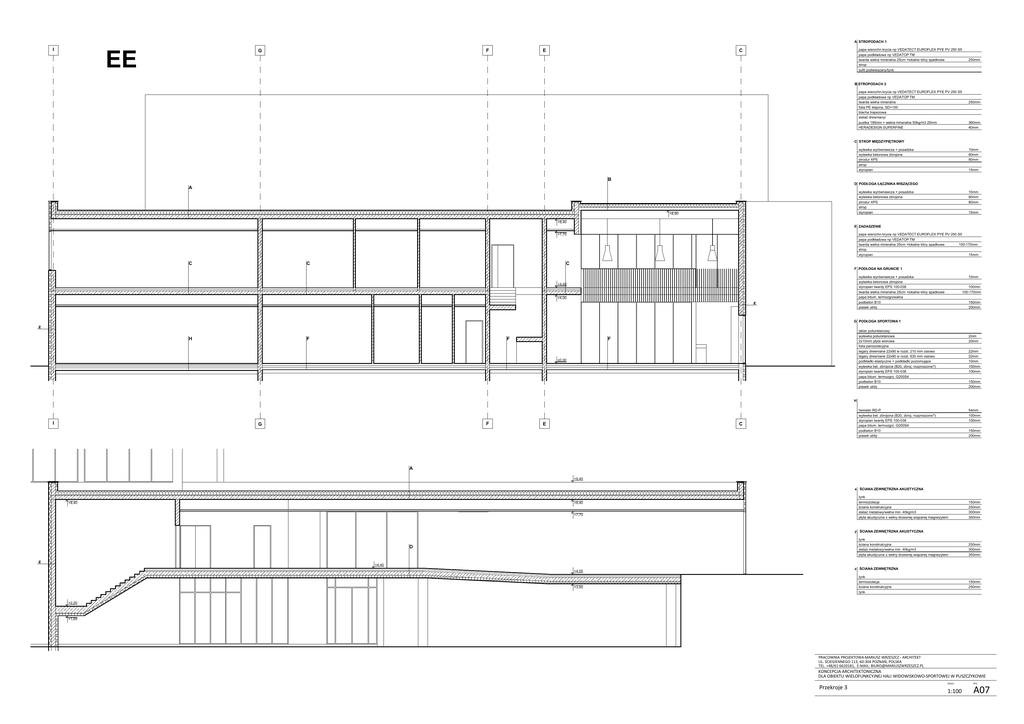 A STROPODACH 1 EE I F G E papa wierzchn.krycia np VEDATECT EUROFLEX PYE PV 250 S5 papa podkładowa np VEDATOP TM twarda wełna mineralna 25cm +lokalne kliny spadkowe strop sufit podwieszany/tynk C 250mm B STROPODACH 2 papa wierzchn.krycia np VEDATECT EUROFLEX PYE PV 250 S5 papa podkładowa np VEDATOP TM twarda wełna mineralna folia PE klejona, SD=100 blacha trapezowa stelaż drewniany/ pustka 195mm + wełna mineralna 50kg/m3 25mm HERADESIGN SUPERFINE 250mm 360mm 40mm C STROP MIĘDZYPIĘTROWY wylewka wyrównawcza + posadzka wylewka betonowa zbrojona strodur XPS strop styropian B 10mm 80mm 80mm 15mm D PODŁOGA ŁĄCZNIKA WISZĄCEGO A wylewka wyrównawcza + posadzka wylewka betonowa zbrojona strodur XPS strop styropian +8,90 10mm 80mm 80mm 15mm +8,40 E ZADASZENIE +7,70 C C papa wierzchn.krycia np VEDATECT EUROFLEX PYE PV 250 S5 papa podkładowa np VEDATOP TM twarda wełna mineralna 25cm +lokalne kliny spadkowe 100-170mm strop styropian 15mm C F PODŁOGA NA GRUNCIE 1 wylewka wyrównawcza + posadzka wylewka betonowa zbrojona styropian twardy EPS 100-038 twarda wełna mineralna 25cm +lokalne kliny spadkowe papa bitum. termozgrzwalna podbeton B10 piasek ubity +4,40 +4,00 z 10mm 100mm 100-170mm 150mm 200mm G PODŁOGA SPORTOWA 1 z H F F lakier poliuretanowy wylewka poliuretanowa 2x10mm płyta wiórowa folia paroizolacyjna legary drewniane 22x90 w rozst. 210 mm osiowo legary drewniane 22x90 w rozst. 630 mm osiowo podkładki elastyczne + podkładki poziomujące wylewka bet. zbrojona (B20, zbroj. rozproszone?) styropian twardy EPS 100-038 papa bitum. termozgrz. G200S4 podbeton B10 piasek ubity F ±0,00 2mm 20mm 22mm 22mm 10mm 100mm 100mm 150mm 200mm H I F G E hemetin RD-P wylewka bet. zbrojona (B20, zbroj. rozproszone?) styropian twardy EPS 100-038 papa bitum. termozgrz. G200S4 podbeton B10 piasek ubity C 54mm 100mm 100mm 150mm 200mm A +9,40 x ŚCIANA ZEWNĘTRZNA AKUSTYCZNA +8,40 tynk termoizolacja ściana konstrukcyjna stelaż metalowy/wełna min. 40kg/m3 płyta akustyczna z wełny drzewnej wiązanej magnezytem +8,40 +7,70 150mm 250mm 300mm 350mm y ŚCIANA ZEWNĘTRZNA AKUSTYCZNA tynk ściana konstrukcyjna stelaż metalowy/wełna min. 40kg/m3 płyta akustyczna z wełny drzewnej wiązanej magnezytem D z +4,40 250mm 300mm 350mm z ŚCIANA ZEWNĘTRZNA +4,05 tynk termoizolacja ściana konstrukcyjna tynk +3,50 150mm 250mm +2,20 +1,65 PRACOWNIA PROJEKTOWA MARIUSZ WRZESZCZ - ARCHITEKT UL. ŚCIEGIENNEGO 113, 60-304 POZNAŃ, POLSKA TEL. +48/61 6620181, E-MAIL: [email protected] KONCEPCJA ARCHITEKTONICZNA DLA OBIEKTU WIELOFUNKCYJNEJ HALI WIDOWISKOWO-SPORTOWEJ W PUSZCZYKOWIE Przekroje 3 SKALA RYS. 1:100 A07