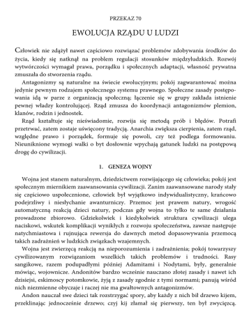 PRZEKAZ 70 EWOLUCJA RZĄDU U LUDZI Człowiek nie zdążył nawet częściowo rozwiązać problemów zdobywania środków do życia, kiedy się natknął na problem regulacji stosunków międzyludzkich. Rozwój wytwórczości wymagał prawa, porządku i społecznych adaptacji, własność prywatna zmuszała do stworzenia rządu. Antagonizmy są naturalne na świecie ewolucyjnym; pokój zagwarantować można jedynie pewnym rodzajem społecznego systemu prawnego. Społeczne zasady postępowania idą w parze z organizacją społeczną; łączenie się w grupy zakłada istnienie pewnej władzy kontrolującej. Rząd zmusza do koordynacji antagonizmów plemion, klanów, rodzin i jednostek. Rząd kształtuje się nieświadomie, rozwija się metodą prób i błędów. Potrafi przetrwać, zatem zostaje uświęcony tradycją. Anarchia zwiększa cierpienia, zatem rząd, względne prawo i porządek, formuje się powoli, czy też podlega formowaniu. Nieuniknione wymogi walki o byt dosłownie wpychają gatunek ludzki na postępową drogę do cywilizacji. 1. GENEZA WOJNY Wojna jest stanem naturalnym, dziedzictwem rozwijającego się człowieka; pokój jest społecznym miernikiem zaawansowania cywilizacji. Zanim zaawansowane narody stały się częściowo uspołecznione, człowiek był wyjątkowo indywidualistyczny, krańcowo podejrzliwy i niesłychanie awanturniczy. Przemoc jest prawem natury, wrogość automatyczną reakcją dzieci natury, podczas gdy wojna to tylko te same działania prowadzone zbiorowo. Gdziekolwiek i kiedykolwiek struktura cywilizacji ulega naciskowi, wskutek komplikacji wynikłych z rozwoju społeczeństwa, zawsze następuje natychmiastowa i rujnująca rewersja do dawnych metod dopasowywania przemocą takich zadrażnień w ludzkich związkach wzajemnych. Wojna jest zwierzęcą reakcją na nieporozumienia i zadrażnienia; pokój towarzyszy cywilizowanym rozwiązaniom wszelkich takich problemów i trudności. Rasy sangikowe, razem podupadłymi później Adamitami i Nodytami, były, generalnie mówiąc, wojownicze. Andonitów bardzo wcześnie nauczano złotej zasady i nawet ich dzisiejsi, eskimoscy potomkowie, żyją z zasady zgodnie z tymi normami; panują wśród nich niezmienne obyczaje i raczej nie ma gwałtownych antagonizmów. Andon nauczał swe dzieci tak rozstrzygać spory, aby każdy z nich bił drzewo kijem, przeklinając jednocześnie drzewo; czyj kij złamał się pierwszy, ten był zwycięzcą. Późniejsi Andonici rozstrzygali spory robiąc widowisko publiczne, na którym spierający się robili żarty i ośmieszali się nawzajem, podczas gdy publiczność określała swym aplauzem zwycięzcę. Jednak takie zjawisko, jak wojna, nie mogło zaistnieć, dopóki społeczeństwo nie rozwinęło się odpowiednio, aby mieć zarówno czas pokoju jak i aprobować zwyczaje wojenne. Sama idea wojny zakłada istnienie jakiegoś stopnia organizacji. Wraz z pojawieniem się grup społecznych, zadrażnienia indywidualne zaczęły się rozpływać w odczuciach grupowych, co sprzyjało spokojowi wewnątrz plemienia, kosztem pokoju międzyplemiennego. Zatem z początku pokojem cieszyła się zamknięta grupa, bądź plemię, które żywiło nienawiść do grup zewnętrznych i nigdy nie lubiło cudzoziemców. Człowiek pierwotny uważał rozlanie krwi obcych za cnotę. Jednak z początku nawet to nie działało. Kiedy dawni wodzowie próbowali redukować nieporozumienia, uznawali często za konieczne zezwolić na plemienne walki na kamienie, przynajmniej raz na rok. Klan mógł podzielić się na dwie grupy i cały dzień walczyć. I to bez przyczyny, tylko dla zabawy; ci ludzie naprawdę lubili walkę. Wojny nadal trwają, ponieważ człowiek ma swoją naturę, ukształtował się ze zwierzęcia a wszystkie zwierzęta są wojownicze. Do wczesnych przyczyn wojny można zaliczyć: 1. Głód, który powodował najazdy dla zdobycia żywności. Niedobór ziemi zawsze wywoływał wojnę i podczas takich walk, pierwotne, pokojowe plemiona, zostały praktycznie wyniszczone. 2. Brak kobiet – próba redukcji niedoborów pomocy domowej. Kradzież kobiet zawsze wywoływała wojnę. 3. Próżność – chęć pokazania plemieniu swojej dzielności. Zaawansowane grupy walczyły po to, żeby narzucić swój sposób życia ludom opóźnionym. 4. Niewolnicy – potrzeba większej liczby pracowników. 5. Rewanż także był przyczyną wojny, kiedy jakieś plemię wierzyło, że sąsiednie plemię przyczyniło się do śmierci członka ich plemienia. Żałoba trwała tak długo, dopóki głowa wroga nie została przyniesiona do domu. Wojna dla zemsty wciąż wybuchała, aż do względnie współczesnych czasów. 6. Rozrywka – wojna w tamtych, dawnych czasach, uważana była przez młodych mężczyzn za rozrywkę. Jeśli nie było dobrego i odpowiedniego pretekstu do wojny, kiedy pokój stawał się nieznośny, sąsiadujące plemiona miały w zwyczaju zaczynać półprzyjacielską walkę, zaczynając najazd dla zabicia wolnego czasu, aby mieć pozorną wojnę. 7. Religia – chęć zdobycia nawróconych na wiarę. Wszystkie religie prymitywne aprobowały wojnę. Dopiero niedawno religia zaczęła dezaprobować wojnę. Wczesne kapłaństwo było, niestety, zazwyczaj związane z siłą wojskową. Jedno z największych, epokowych posunięć pokojowych, polegało na próbie separacji Kościoła i państwa. Dawne plemiona zawsze składały wojnę w ofierze swym bogom, na rozkaz swych wodzów lub uzdrawiaczy. Hebrajczycy wierzyli w takiego „Boga walki” a opowieść o ich najeździe na Madianitów jest typowym opisem bestialskiego okrucieństwa antycznych walk plemiennych; napaść ta, połączona z rzezią wszystkich mężczyzn i późniejszym zabiciem wszystkich dzieci płci męskiej oraz wszystkich kobiet, które nie były dziewicami, mogłaby przypaść do gustu wodzom plemiennym sprzed dwustu tysięcy lat. I wszystko to zrobiono w „imię Pana Boga Izraela”. Jest to opowieść o ewolucji społeczeń