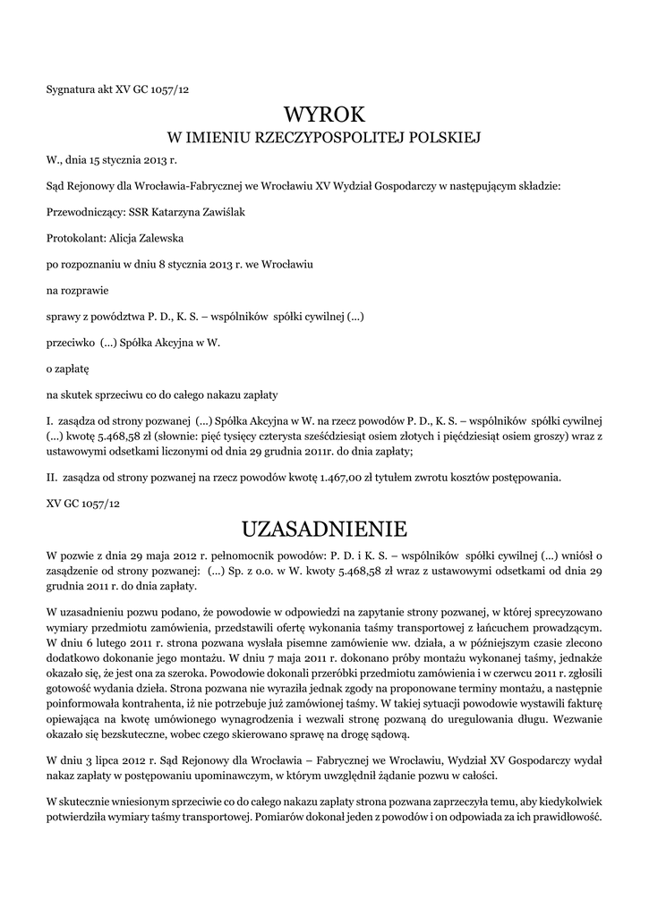 Sygnatura akt XV GC 1057/12 WYROK W IMIENIU RZECZYPOSPOLITEJ POLSKIEJ W., dnia 15 stycznia 2013 r. Sąd Rejonowy dla Wrocławia-Fabrycznej we Wrocławiu XV Wydział Gospodarczy w następującym składzie: Przewodniczący: SSR Katarzyna Zawiślak Protokolant: Alicja Zalewska po rozpoznaniu w dniu 8 stycznia 2013 r. we Wrocławiu na rozprawie sprawy z powództwa P. D., K. S. – wspólników spółki cywilnej (...) przeciwko (...) Spółka Akcyjna w W. o zapłatę na skutek sprzeciwu co do całego nakazu zapłaty I. zasądza od strony pozwanej (...) Spółka Akcyjna w W. na rzecz powodów P. D., K. S. – wspólników spółki cywilnej (...) kwotę 5.468,58 zł (słownie: pięć tysięcy czterysta sześćdziesiąt osiem złotych i pięćdziesiąt osiem groszy) wraz z ustawowymi odsetkami liczonymi od dnia 29 grudnia 2011r. do dnia zapłaty; II. zasądza od strony pozwanej na rzecz powodów kwotę 1.467,00 zł tytułem zwrotu kosztów postępowania. XV GC 1057/12 UZASADNIENIE W pozwie z dnia 29 maja 2012 r. pełnomocnik powodów: P. D. i K. S. – wspólników spółki cywilnej (...) wniósł o zasądzenie od strony pozwanej: (...) Sp. z o.o. w W. kwoty 5.468,58 zł wraz z ustawowymi odsetkami od dnia 29 grudnia 2011 r. do dnia zapłaty. W uzasadnieniu pozwu podano, że powodowie w odpowiedzi na zapytanie strony pozwanej, w której sprecyzowano wymiary przedmiotu zamówienia, przedstawili ofertę wykonania taśmy transportowej z łańcuchem prowadzącym. W dniu 6 lutego 2011 r. strona pozwana wysłała pisemne zamówienie ww. działa, a w późniejszym czasie zlecono dodatkowo dokonanie jego montażu. W dniu 7 maja 2011 r. dokonano próby montażu wykonanej taśmy, jednakże okazało się, że jest ona za szeroka. Powodowie dokonali przeróbki przedmiotu zamówienia i w czerwcu 2011 r. zgłosili gotowość wydania dzieła. Strona pozwana nie wyraziła jednak zgody na proponowane terminy montażu, a następnie poinformowała kontrahenta, iż nie potrzebuje już zamówionej taśmy. W takiej sytuacji powodowie wystawili fakturę opiewająca na kwotę umówionego wynagrodzenia i wezwali stronę pozwaną do uregulowania długu. Wezwanie okazało się bezskuteczne, wobec czego skierowano sprawę na drogę sądową. W dniu 3 lipca 2012 r. Sąd Rejonowy dla Wrocławia – Fabrycznej we Wrocławiu, Wydział XV Gospodarczy wydał nakaz zapłaty w postępowaniu upominawczym, w którym uwzględnił żądanie pozwu w całości. W skutecznie wniesionym sprzeciwie co do całego nakazu zapłaty strona pozwana zaprzeczyła temu, aby kiedykolwiek potwierdziła wymiary taśmy transportowej. Pomiarów dokonał jeden z powodów i on odpowiada za ich prawidłowość. Zarzucono też nieterminowe wykonanie dzieła i podkreślono, że po nieudanej próbie montażu, strona pozwana jeszcze przez dwa miesiące czekała na finalizację umowy. Po tym okresie powodowie za pośrednictwem poczty elektronicznej poinformowali o gotowości do montażu, jednakże nie dostarczyli do siedziby strony pozwanej przedmiotu umowy. W oparciu o tak sformułowane zarzuty strona pozwana wniosła o oddalenie powództwa w całości. Podstawę faktyczną rozstrzygnięcia stanowiły następujące ustalenia: W dniu 8 czerwca 2010 r. P. D. w imieniu wspólników spółki cywilnej (...) złożył ofertę umowy o dzieło dotyczącej taśmy transportowej z łańcuchem prowadzącym o szerokości 240 mm, wykonanej ze stali nierdzewnej z bokami spawanymi o średnicy drutu plecionego 1,6 mm i średnicy drutu poprzecznego 2 mm, podziałką 6,6/7 mm z łańcuchem prowadzącym tulejkowym o podziałce 50,8 mm, obustronnym. Wynagrodzenie zostało w niej określone na kwotę 4.680 zł (780 zł za mb przy 6 mb) netto i miało być płatne przed odbiorem dzieła. Czas realizacji zamówienia określono na 5 tygodni. Dostawa na koszt zamawiającego. (dowód: - ww. oferta, k.13) Oferta została złożona w odpowiedzi na zapytanie (...) SA w W.. (dowód: - zeznania powoda, k.74) Przedmiot umowy miał zostać zamontowany w urządzeniu myjącym butelki, w celu wymiany zużytej taśmy. (dowód: - zeznania świadka R. K., k.68; - zeznania strony pozwanej, k.76) Na początku grudnia 2010 r. przedstawiciele wykonawcy i adresata oferty skontaktowali się, celem ustalenie terminu dokonania pomiarów urządzenia, w którym miała zostać zamontowana taśma. Po kilkakrotnym odwołaniu umówionych wizyt, ostatecznie pomiary zostały wykonane przez P. D. z początkiem lutego 2011 r. (dowód: - korespondencja mailowa, k.40-43; - zeznania świadka R. K., k.68-69; - zeznania powoda, k.74). Po dokonaniu pomiarów, mailem wysłanym w dniu 7 lutego 2011 r. P. D. poinformował, że firma jest gotowa wykonać siatkę w terminie 3 tygodni. (dowód: - ww. mail, k.43) Tego samego dnia (...) SA w W. złożyła zamówienie na wykonanie taśmy transportowej z łańcuchem prowadzącym na warunkach określonych w ofercie kontrahenta, z tym że sprecyzowała, że zamówienie dotyczy 5,7 m taśmy i zastrzegła konieczność dołączenia stosownych atestów nie później niż w dniu dostawy. Dodatkowo zleciła też montaż wykonanej taśmy. (dowód: -ww. zamówienie, k.14) W dniu 10 marca 2011 r. przedstawiciel zamawiającego – R. K. wysłał drogą elektroniczną zapytanie o termin wykonania dzieła. (dowód: - ww. mail, k.45) Kolejne zapytanie dotyczące tej samej kwestii zostało wystosowane w dniu 14 kwietnia 2011 r. (dowód: - mail z dnia 14 kwietnia 2011 r., k.47) Dopiero w dniu 21 kwietnia 2011 r. P. D. poinformował kontrahenta, że siatka jest gotowa do montażu. Poinformował też, że koszt montażu wyniesie 80 zł za roboczogodzinę, przy czym przewidywany czas montażu przy pracy dwóch osób to około 4 godziny. Koszt dojazdu – 0,85 zł/km. (dowód: - mail z dnia 21 kwietnia 2011 r., k. 48) (...) SA w W. zaakceptowała zaproponowane przez kontrahenta koszty montażu. (dowód: - zeznania świadka R. K., k.69) Następnie wykonawca kilkakrotnie odwoływał terminy umówionych s