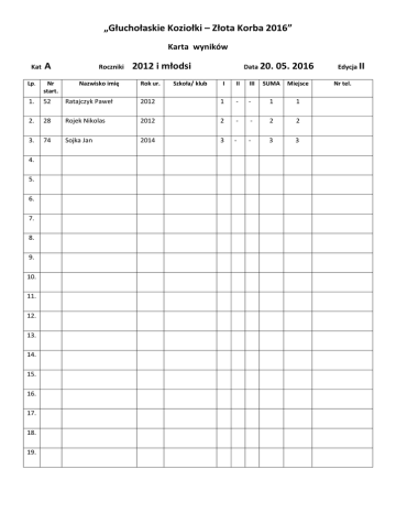 „Głuchołaskie Koziołki – Złota Korba 2016” Karta wyników Kat A Roczniki Lp. Nr start. 1. 52 Ratajczyk Paweł 2. 28 3. 74 4. 5. 6. 7. 8. 9. 10. 11. 12. 13. 14. 15. 16. 17. 18. 19. Nazwisko imię 2012 i młodsi Rok ur. Szkoła/ klub Data 20. I II III 2012 1 - Rojek Nikolas 2012 2 Sojka Jan 2014 3 05. 2016 SUMA Miejsce - 1 1 - - 2 2 - - 3 3 Edycja II Nr tel. „Głuchołaskie Koziołki – Złota Korba 2016” Karta wyników Kat B Roczniki Lp. Nr start. 1. 41 Fialkowa Anna 2009 2. 25 Maćkowski Karol 2009 3. 1 Sułek Łukasz 2009 4. 73 Sojka Antoni 2010 5. 31 Korczak Igor 2010 6. 4 Kondratowicz Anna 2009 7. 2 Olchawa Oskar 2011 8. 68 Sobierska Maja 2009 9. 42 Mickova Tereza 2011 10. 3 Kondratowicz Tymon 2011 11. 49 Brych Tomasz 2010 12. 76 Kustra Anna 2011 13. 14. 15. 16. 17. 18. 19. 20. 21. 22. Nazwisko imię 2009-2011 Rok ur. Data 20. 05. 2016 Edycja II Szkoła/ klub I II III SUMA Miejsce Acs Drak Vrbno Przedszkole Charbielin Przedszkole Nr 2 Głuchołazy Przedszkole Nr 2 Głuchołazy Przedszkole Nr 2 Głuchołazy PSP Nr 1 Głuchołazy PSP Nr 1 Głuchołazy PSP Nr 1 Głuchołazy Acs Drak Vrbno PP Bodzanów 1,5 2 - 3,5 1 4 1 - 5 2 3 4 - 7 3 6 3 - 9 4 1,5 8 - 9,5 5 5 7 - 12 6 8 5 - 13 7 10 6 - 16 8 7 10 - 17 9 9 11 - 20 10 Przedszkole Nr 2 Głuchołazy PP Bodzanów 12 9 - 21 11 11 12 - 23 12 Nr tel. „Głuchołaskie Koziołki – Złota Korba 2016” Karta wyników Kat C Roczniki 2006-2008 - dziewczęta Lp. Nr start. Nazwisko imię 1. 5 2. 26 Rok ur. Mickova Magdalena 2006 2006 3. 32 Maćkowska Małgorzata Jachura Natalia 4. 53 Ogrodnik Martyna 2007 5. 44 Brych Joanna 2008 6. 57 Skowronek Oliwia 2008 7. 8. 9. 10. 11. 12. 13. 14. 15. 16. 17. 18. 19. 20. 21. 22. 2007 Data 20. 05. 2016 Szkoła/ klub I II III SUMA Miejsce Acs Drak Vrbno SP Charbielin 1 1 2 4 1 2 3 1 6 2 PSP Nr 2 Głuchołazy PSP Bodzanów 3 2 3 8 3 4 4 4 12 4 6 5 5 16 5 5 6 6 17 6 PSP Nr 2 Głuchołazy PSP Nr 1 Głuchołazy Edycja II Nr tel. „Głuchołaskie Koziołki – Złota Korba 2016” Karta wyników Kat D Roczniki Lp. Nr start. 1. 62 Rokicki Karol 2006 2. 24 Piech Dawid 2006 3. 8 Zvedelik Vojtech 2007 4. 27 Zborowski Oliwier 2007 5. 58 Bębenek Michał 2007 6. 9 Chaszczewicz Tomasz 2006 7. 56 Skowronek Piotr 2006 8. 60 Ratajczyk Sebastian 2008 9. 65 Hływa Tymoteusz 2006 10. 10 Olchawa Patryk 2006 11. 66 Sobierski Mikołaj 2007 12. 75 Micek Dominik 2008 13. 70 Kliś Oliwier 2008 14. 71 Lejkowski Kacper 2007 15. 38 Bias Oliwier 2007 16. 11 2008 17. 34 Kondratowicz Konstanty Wolny Mikołaj 18. 19. 20. 21. 22. Nazwisko imię 2006-2008-chłopcy Rok ur. 2007 Data 20. 05. 2016 Szkoła/ klub I II III SUMA Miejsce PSP Nr 1 Prudnik PSP Nr 2 Głuchołazy Acs Drak Vrbno PSP Nr 1 Głuchołazy PSP Bodzanów 2 1 2 5 1 4 5 1 10 2 1 9 3 13 3 7 2 5 14 4 3 7 7 17 5 PSP Nr 1 Głuchołazy PSP Nr 1 Głuchołazy PSP Nr 1 Głuchołazy PSP Nr 1 Głuchołazy 10 3 9 22 6 8 11 4 23 7 5 14 6 25 8 6 8 12 26 9 9 12 8 29 10 PSP Nr 1 Głuchołazy PSP Bodzanów 13 4 16 33 11 15 6 13 34 12 PSP Nr 1 Głuchołazy PSP Nr 1 Głuchołazy PSP Nr 1 Głuchołazy PSP Nr 1 Głuchołazy PSP Nr 2 Głuchołazy 12 16 10 38 13 11 17 11 39 14 16 10 14 40 15 14 15 15 44 16 17 13 17 47 17 Edycja II Nr tel. „Głuchołaskie Koziołki – Złota Korba 2016” Karta wyników Kat E Roczniki Lp. Nr start. 1. 51 Tabisz Natalia 2. 13 3. 4. 5. 6. 7. 8. 9. 10. 11. 12. 13. 14. 15. 16. 17. 18. 19. 20. 21. 22. Nazwisko imię 2003-2005-dziewczęta Rok ur. Data 20. 05. 2016 Szkoła/ klub I II III SUMA Miejsce 2003 PSP Bodzanów 2 1 3 6 1-2 Studalova Pavla 2005 1 3 2 6 1-2 12 Cizkova Katerina 2004 4 2 1 7 3 64 Mlynarova Katerina 2004 Acs Drak Vrbno Acs Drak Vrbno Acs Drak Vrbno 3 4 4 11 4 Edycja II Nr tel. „Głuchołaskie Koziołki – Złota Korba 2016” Karta wyników Kat F Roczniki Nazwisko imię 2003-2005-chłopcy Lp. Nr start. Rok ur. 1. 17 Adamek Martin 2004 2. 16 Kresta Vojtech 2004 3. 30 Rojek Mateusz 2003 4. 40 Jędrysek Patryk 2003 5. 22 Bednarek Piotr 2003 6. 72 Majzel Daniel 2005 7. 23 Wypych Bartosz 2004 8. 35 Skokuń Jakub 2005 9. 48 Śnieżek Karol 2003 10. 18 Zvedelik Ondrej 2005 11. 59 Witwicki Artur 2004 12. 19 Chaszczewicz Paweł 2005 13. 29 Rojek Szymon 2005 14. 63 Rokicki Paweł 2003 15. 61 Zapała Michał 2004 16. 15 Fialek David 2004 17. 20 Sułek Adrian 2005 18. 69 Świetlikowski Paweł 2054 19. 36 Hawryluk Kacper 2004 20. 21 Bednarek Jakub 2003 21. 14 Malis Ivo 2005 22. 67 Brych Jakub 2005 Data 20. 05. 2016 Szkoła/ klub I II III SUMA Miejsce ACS Drak Vrbno ACS Drak Vrbno PSP Nr 1 Głuchołazy PSP Nr 2 Głuchołazy PSP Nr 1 Głuchołazy PSP Nr 2 Głuchołazy PSP Nr 1 Głuchołazy SP Nowy Świętów PSP Bodzanów 1 1 1 3 1 2 4 3 9 2 3,5 3 8 14,5 3 Acs Drak Vrbno PSP nr 1 Głuchołazach PSP Nr 1 Głuchołazy PSP Nr 1 Głuchołazy PSP Nr 1 Prudnik PSP Nr 2 Głuchołazy Acs Drak Vrbno PSP nr 1 Głuchołazy PSP Nr 1 Głuchołazy PSP Nr 2 Głuchołazy PSP Nr 1 Głuchołazy Acs Drak Vrbno PSP Nr 2 Głuchołazy 7 5 5,5 17,5 4 5 14 2 21 5 6 11 7 24 6 9 7 9 25 7 8 13 5,5 26,5 8 10 2 15 27 9 3,5 21 4 28,5 10 14 12 10 36 11 12 10 16 38 12-14 15 6 17 38 12-14 17 9 12 38 12-14 13 17 11 41 15 11 22 13,5 46,5 16 16 20 13,5 49,5 17 21 8 21 50 18 19 15 19 53 19 20 18 18 56 20-21 18 16 22 56 20-21 22 19 20 61 22 Edycja II Nr tel.