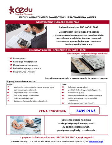 SZKOLENIA DLA ŻOŁNIERZY ZAWODOWYCH I PRACOWNIKÓW WOJSKA INDYWIDUALNY KURS ABC KADR i PŁAC Indywidualny kurs ABC KADR i PŁAC Uczestnikiem kursu może być osoba: - nieznająca zagadnień związanych z tą problematyką, - początkująca w dziedzinie kadrowo – płacowej, - pracująca na stanowisku kadrowo – płacowym lub chcąca podjąć taką pracę. CEL: NOWY ZAWÓD – SPECJALISTA DS. KADR I PŁAC Potrzebujesz indywidualnego podejścia? Prawo pracy Kalkulacja wynagrodzeń Ubezpieczenia społeczne Podatki w wynagrodzeniach Program ZUS „Płatnik” Indywidualne podejście w przygotowaniu do nowego zawodu! W programie szkolenia m.in.: Kadry: Płace: zawieranie, zmiana, rozwiązywanie umów o pracę kalkulacja wynagrodzeń ochrona danych osobowych podatek dochodowy od osób fizycznych odpowiedzialność pracownika tworzenie listy płac czas pracy, urlopy pracownicze wynagrodzenia z umów cywilnoprawnych dokumentacja kadrowa zasiłki: wyrównawczy, macierzyński, opiekuńczy Zakładowy Fundusz Świadczeń Socjalnych obsługa programu ZUS „Płatnik” CENA SZKOLENIA 2499 PLN! Szkolenie kładzie nacisk na naukę praktycznych umiejętności. 30 godzin szkoleniowych, praktyczne przykłady i rozwiązania. Łączymy szkolenia w pakiety np. ABC KADR I PŁAC + język angielski! Kontakt: CEdu Sp. z o.o. tel. 71 342 83 64, Wrocław ul. Powstańców Śląskich 28/30, www.cedu.pl