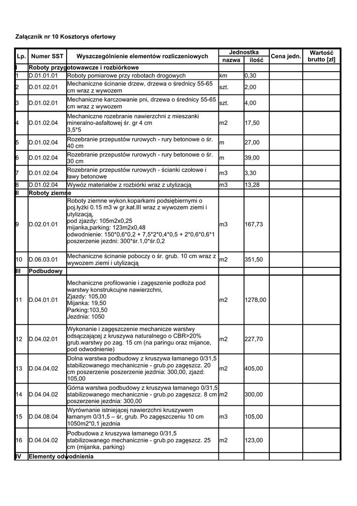 Załącznik nr 10 Kosztorys ofertowy Numer SST Wyszczególnienie